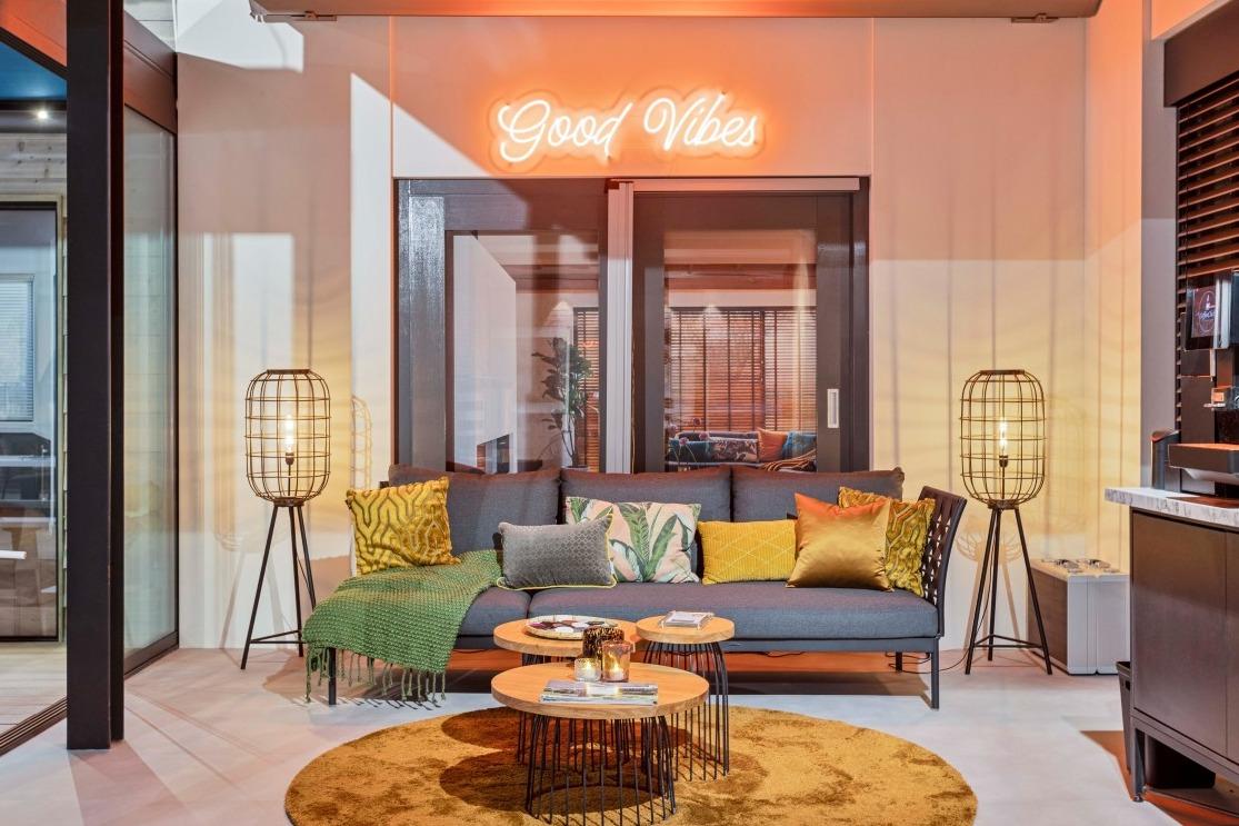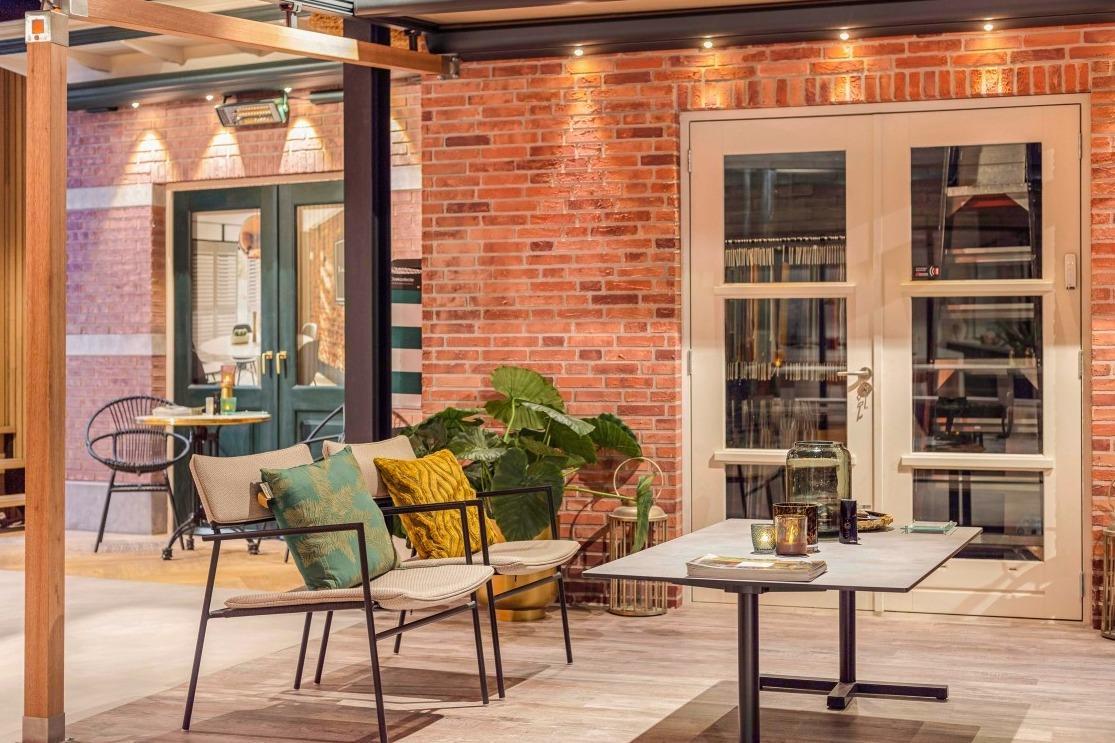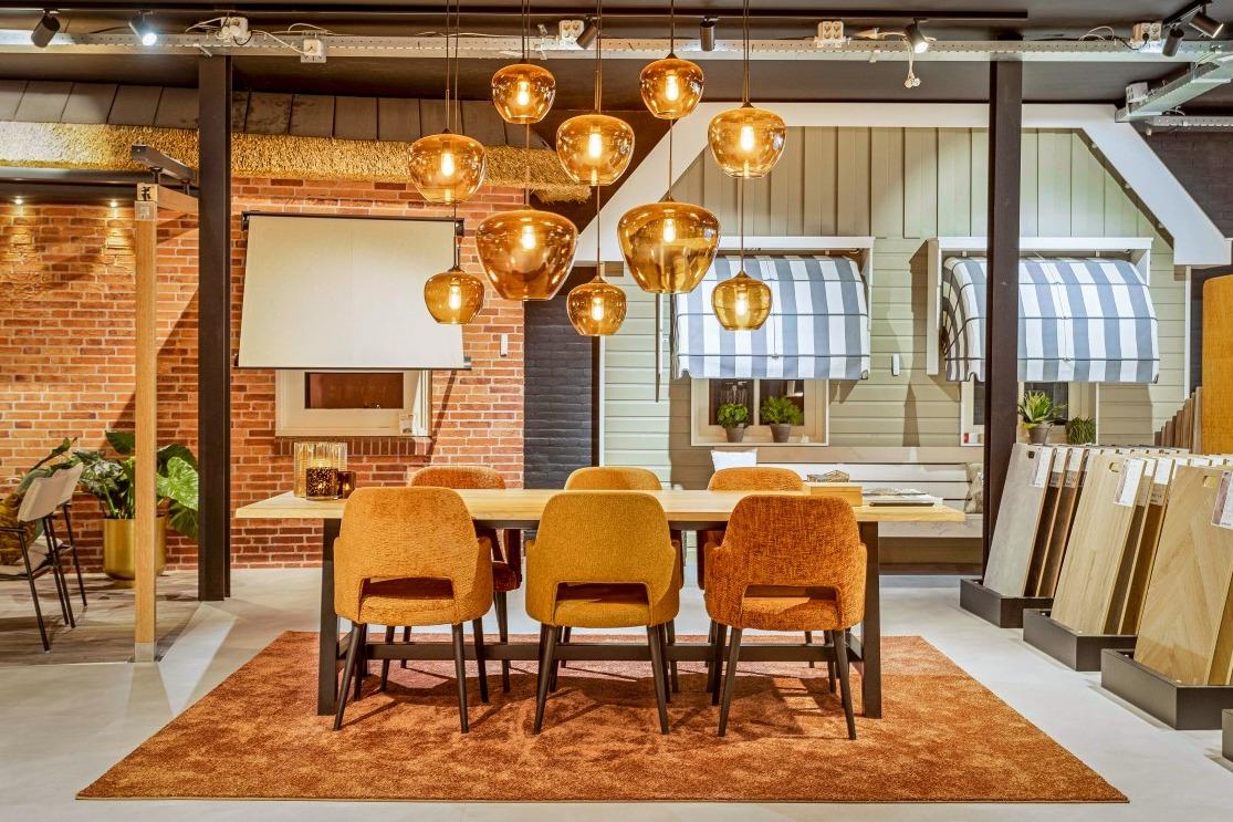 Retail meubilair De overlegtafels zijn middenin de showroom geplaatst, eentje is bij de vitragestalen neergezet en de ander middenin de showroom bij de vloerstalen. Hier is een sfeervolle hoek ontstaan met onze boomstamtafel en de Ema 2 H stoelen, die gestoffeerd zijn in verschillende, oranjekleurige stofferingen. De sfeerhoeken waar onder andere de zonweringen, overkappingen en raamdecoraties geëtaleerd zijn, zijn verder aangekleed met onze terrascollectie. Zo zien we onder meer onze witte picknic bank, W-sit in een soort buitenpatio staan. De modulaire Busan bank is gesierd met prachtige kussens en daar tref je alleen maar ‘good vibes’! En even verderop in de showroom is een ruime terrassetting neergezet met een viertal van onze Miyaki loungestoelen. Deze zijn gecombineerd met een grote terrasoverkapping en sfeervolle buitenverlichting. Onder de blauw witte markiezen prijkt onze Robert terrasbank, die voor iedere ruimte op maat te maken is. |