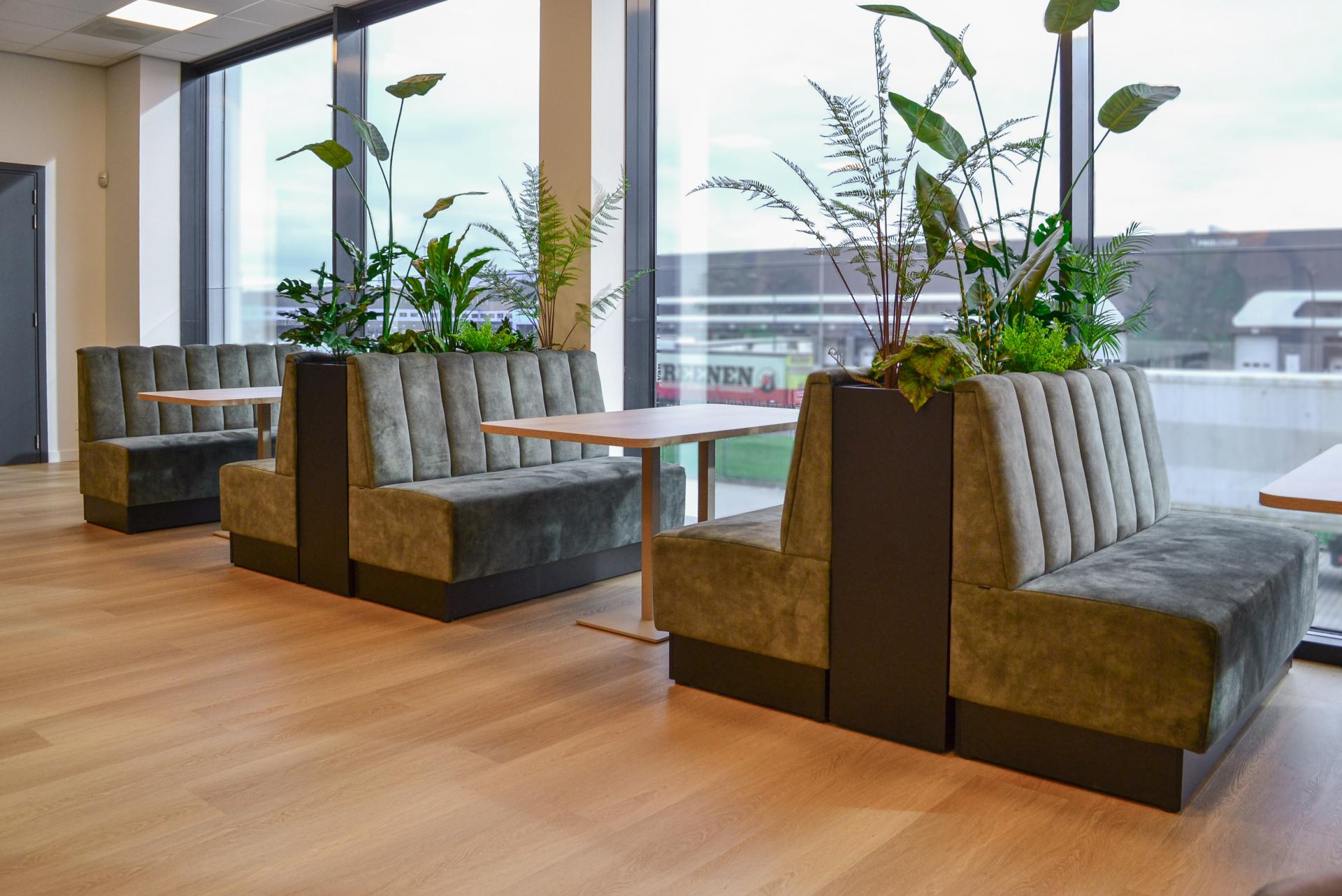Voorin de kantine staan ronde tafels met Ikon kegelonderstel, gecombineerd met Thomas stoelen in taupe. Hier kunnen collega’s met elkaar in gesprek gaan of genieten van hun pauzemoment. Groene accenten |