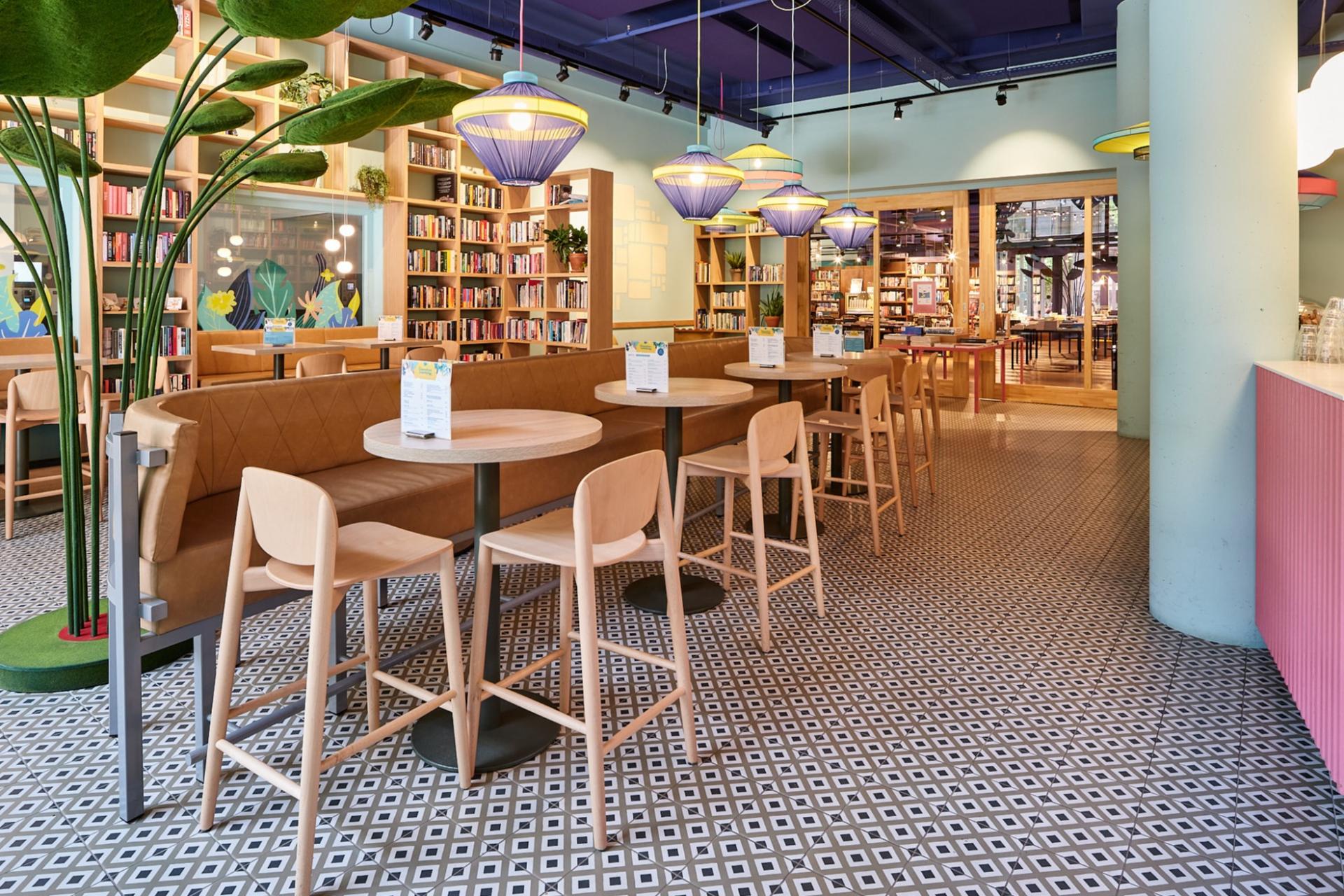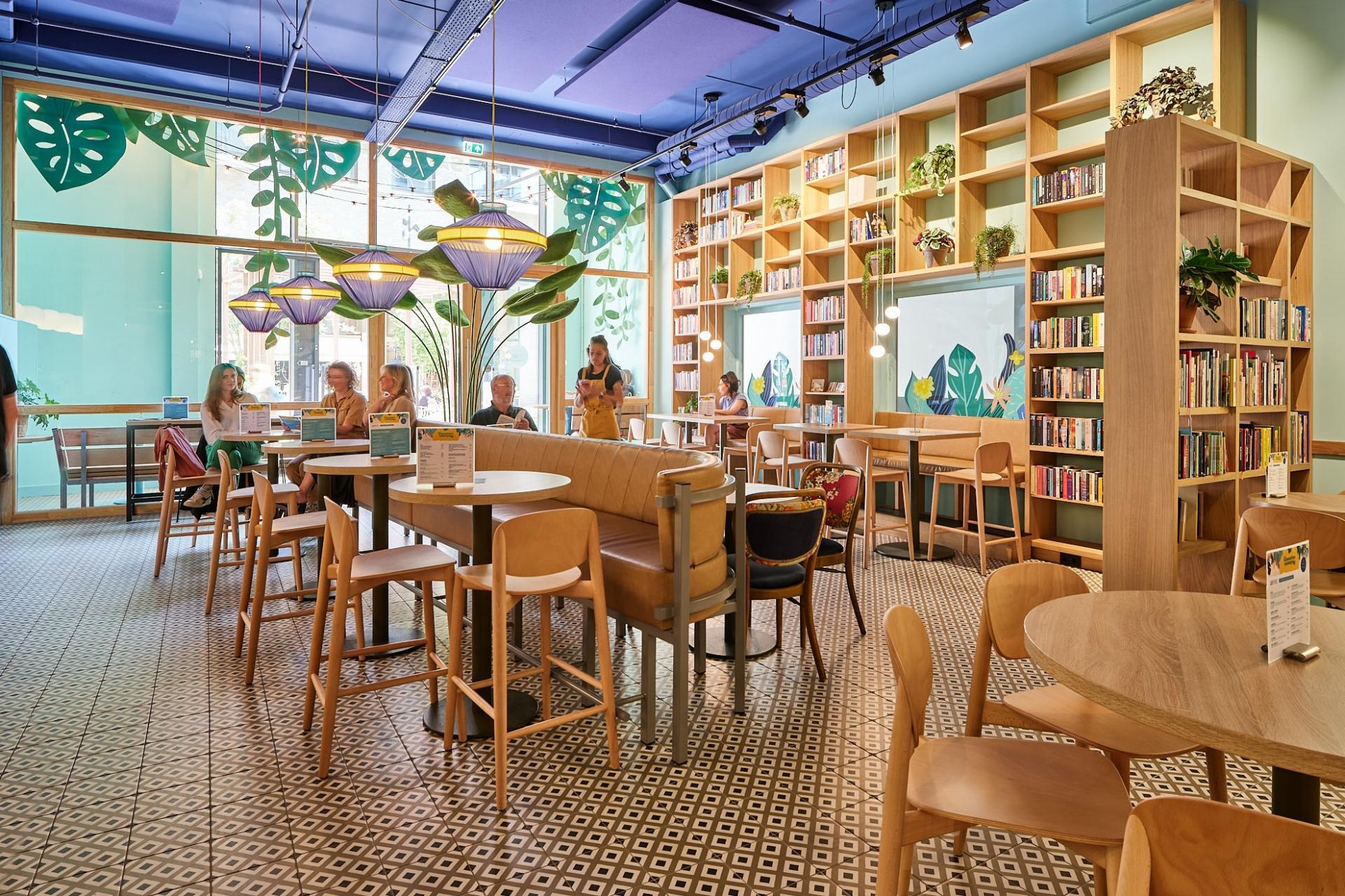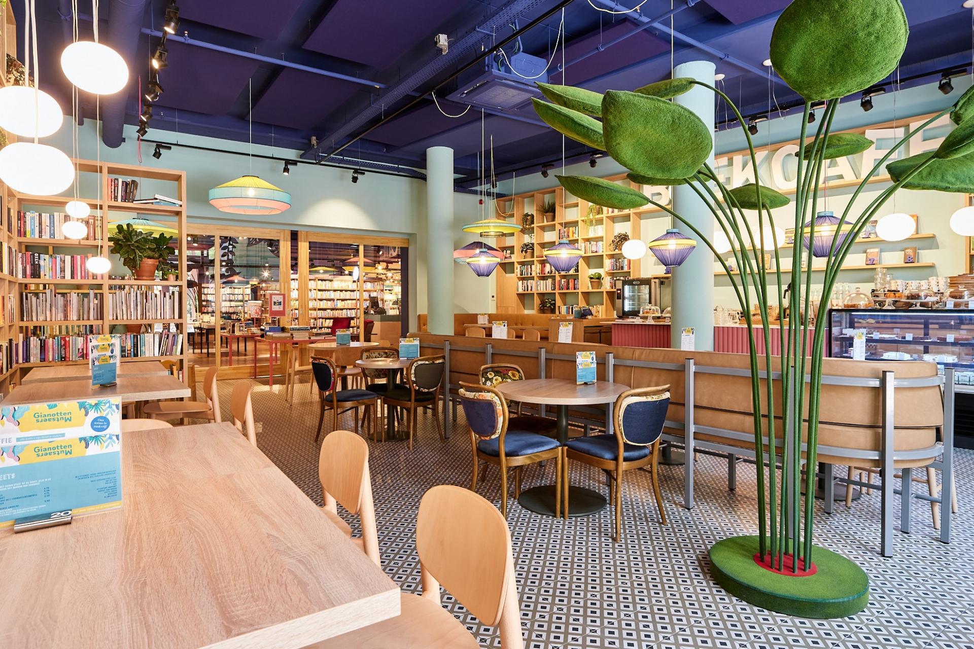 In het nieuwe, moderne winkelgebied in het centrum van Tilburg heeft boekhandel Gianotten Mutsaers eindelijk haar vaste plek gekregen. De winkel heeft genoeg ruimte om haar uitgebreide assortiment aan (tweedehands) boeken, tijdschriften, wenskaarten en geschenken te etaleren. Maar naast een goed boek kun je hier ook genieten van een kop koffie en gebak in het boekencafé, dat sinds kort ook haar terras opende. Naar het ontwerp van interieurarchitect Nicole van Beers hebben wij deze prachtige zaak een nieuw interieur mogen geven. Literaire harmonie Bij het betreden van het café valt meteen de warme en uitnodigende sfeer op. De binnenruimte van het boekencafé van Gianotten is voorzien van een unieke mix van moderne en vintage elementen. Zo zien we een aantal oude stoelen en fauteuils die gestoffeerd zijn in velours prints. Als tegenhanger zijn de Harry stoelen en Harry krukken ingezet, die met hun Scandinavische karakter een fijne harmonie creëren. Er is bewust gekozen voor de eenvoudige, zwarte Inox onderstellen voor de hoge- en lage tafels, zodat de rest van het interieur alle aandacht krijgt. Samen met de licht eiken tafelbladen combineren ze perfect met het zitmeubilair. |