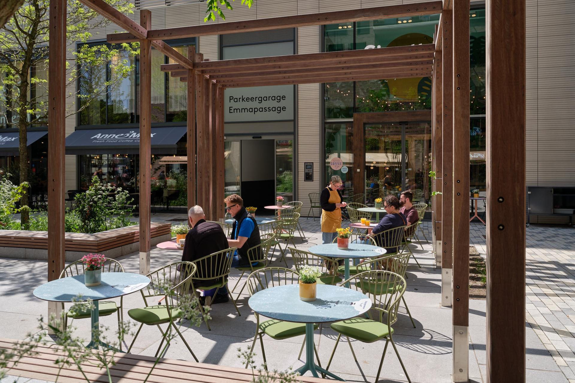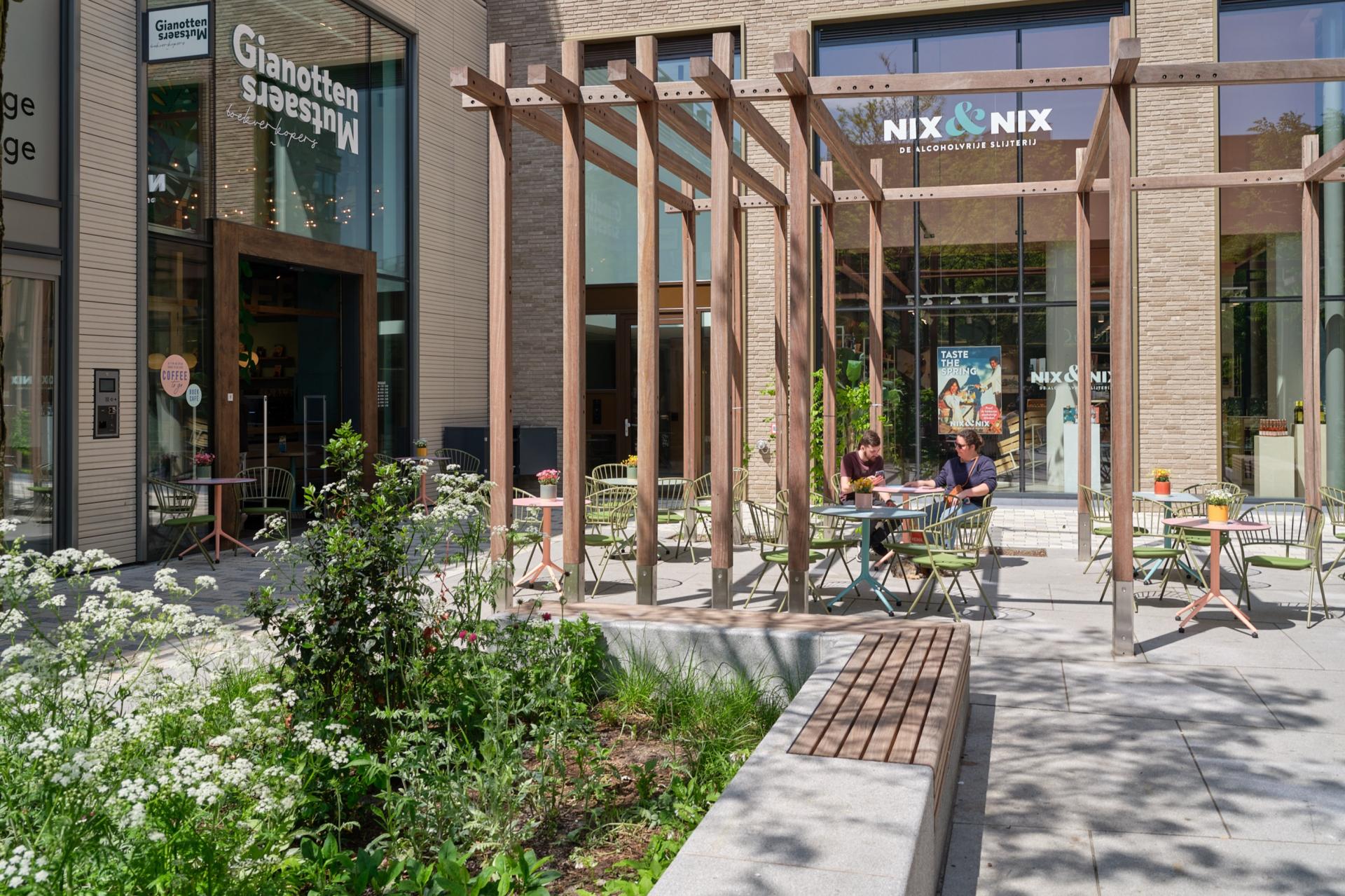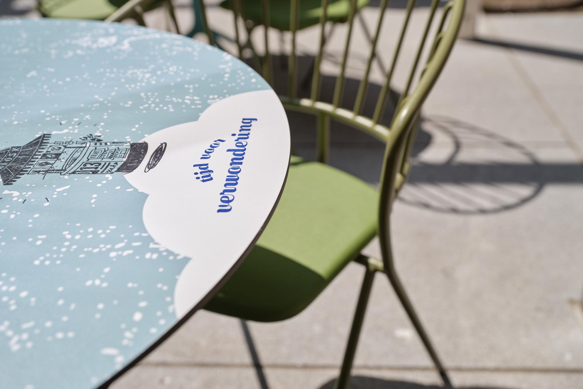 Buiten word je meteen vrolijk van de vele pastelkleurige meubels die het terras rijk is. De zachtgroene, terrasstoelen hebben een gestoffeerde zitting en een omarmende rugleuning. Deze zijn gecombineerd met de custom made terrastafels met ons roze- en blauw Elliot vierteens onderstel. De bladen zijn gesierd met een grafische illustratie die speciaal voor Gianotten Mutsaers is ontworpen. Gasten kunnen nu genieten van een goed boek en een heerlijke kop koffie terwijl ze ontspannen op het terras zitten. Het nieuwe meubilair straalt klasse uit en nodigt uit tot urenlang tafelen en genieten van het prachtige weer. |