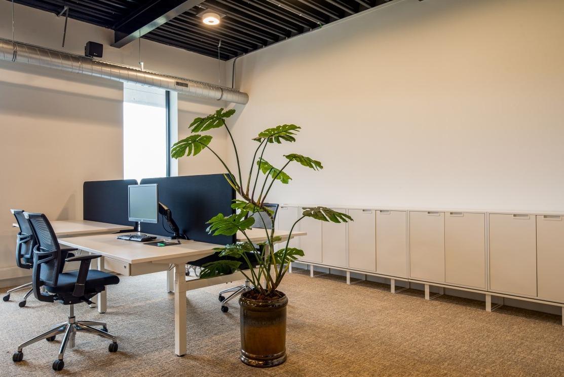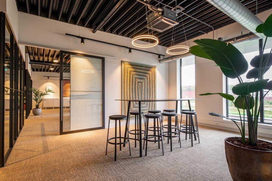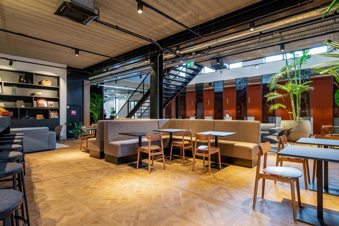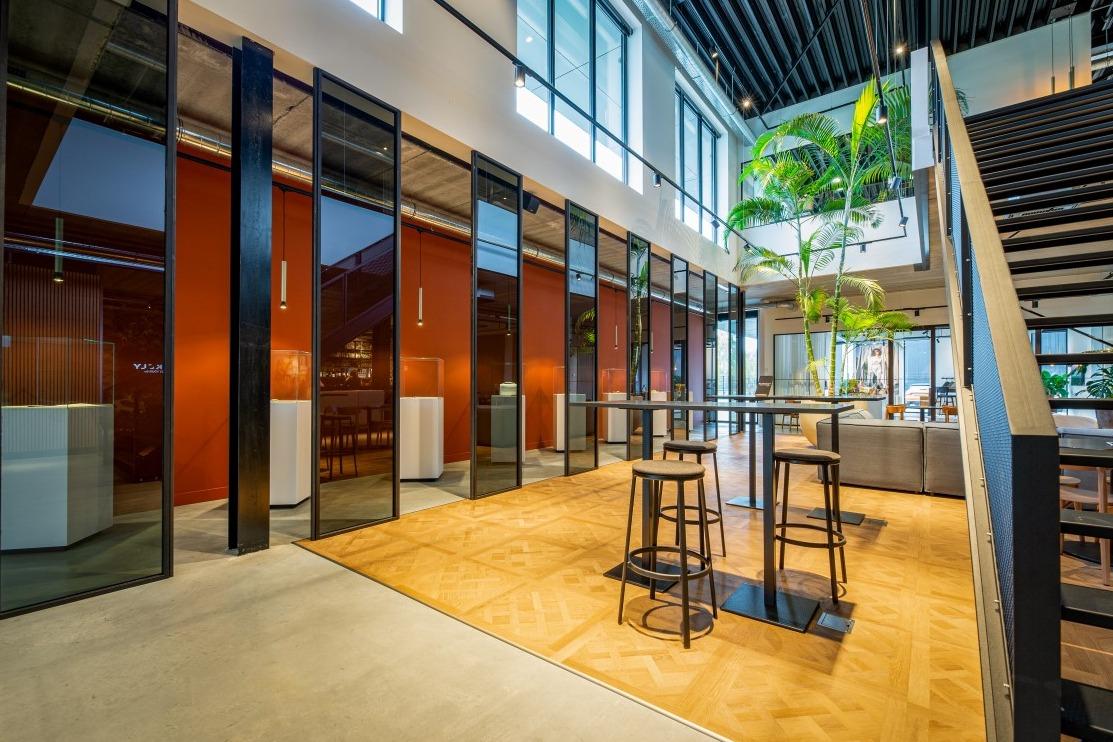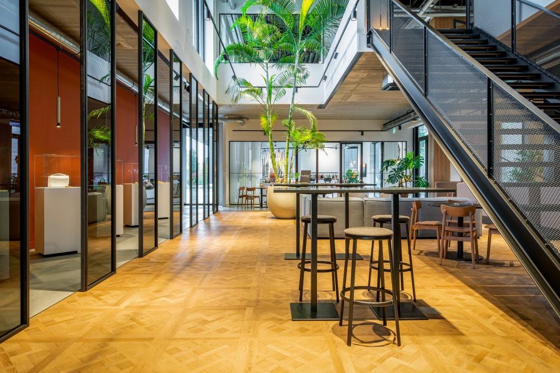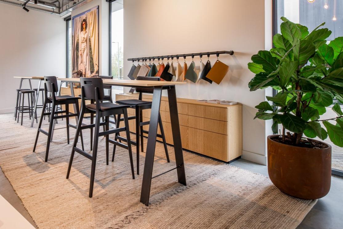 Voor een relaxt kopje koffie kan er plaats worden genomen op de modulaire Brixen bank of Mundi fauteuils. En daar tussenin vinden we de retro Alto stoelen die gecombineerd zijn met de Risto bank. De vloer vult het meubilair naadloos aan, zo ontstaat er een minimalistische warme sfeer. Hierdoor leent de ruimte zich voor het ontvangen van klanten en eventueel voor overleg en besprekingen, maar ook het eigen team vindt hier ontspanning en rust tijdens pauzes en na werktijd. WerkruimtesIn het hoofdkantoor van Burkely zijn verschillende werkruimtes ingericht. Op de begane grond loopt de entree door naar de showroom, waar de diversiteit van de Burkely tassen wordt tentoongesteld. Aan de hoge maatwerktafels en de New Retro krukken kan er eindeloos worden gekeken naar materialen en kleurcombinaties. |
