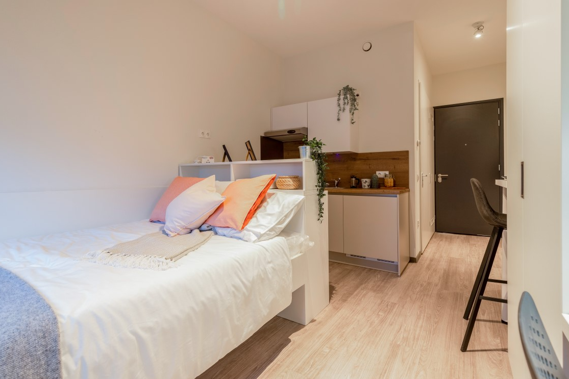 Aan onze partner Brunner de taak om zowel de gemeenschappelijke ruimtes als de appartementen in te richten. De appartementen moesten zowel smaakvol als praktisch ingericht worden. Want een kleine studentenwoning vraagt om een ideale indeling en een algemene inrichting. Daarom is er in de studentenwoning gekozen voor neutraal meubilair, veel wit, grijs en zwart. Zodat de studenten zelf hun persoonlijke draai aan het interieur kunnen geven met behulp van accessoires. |