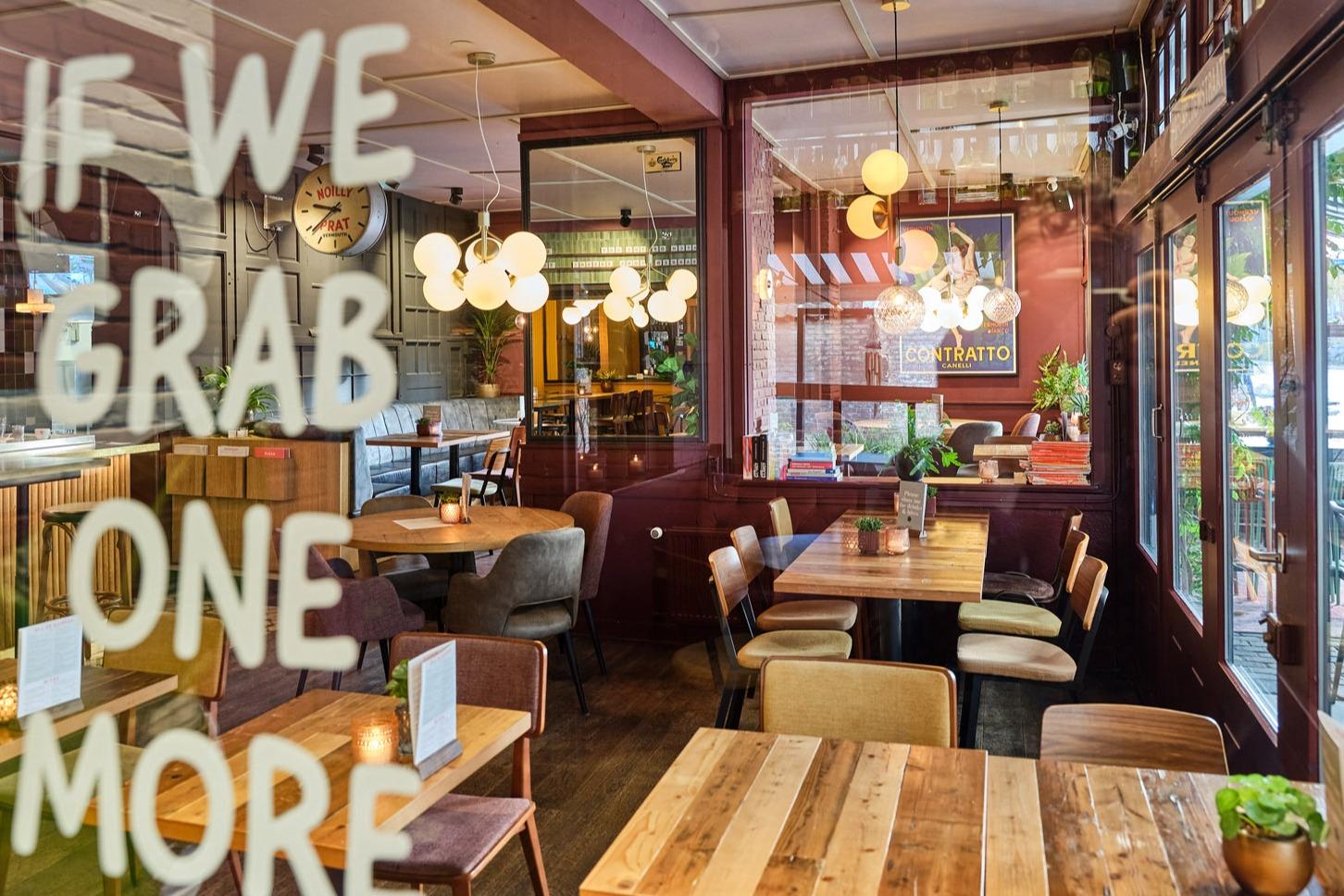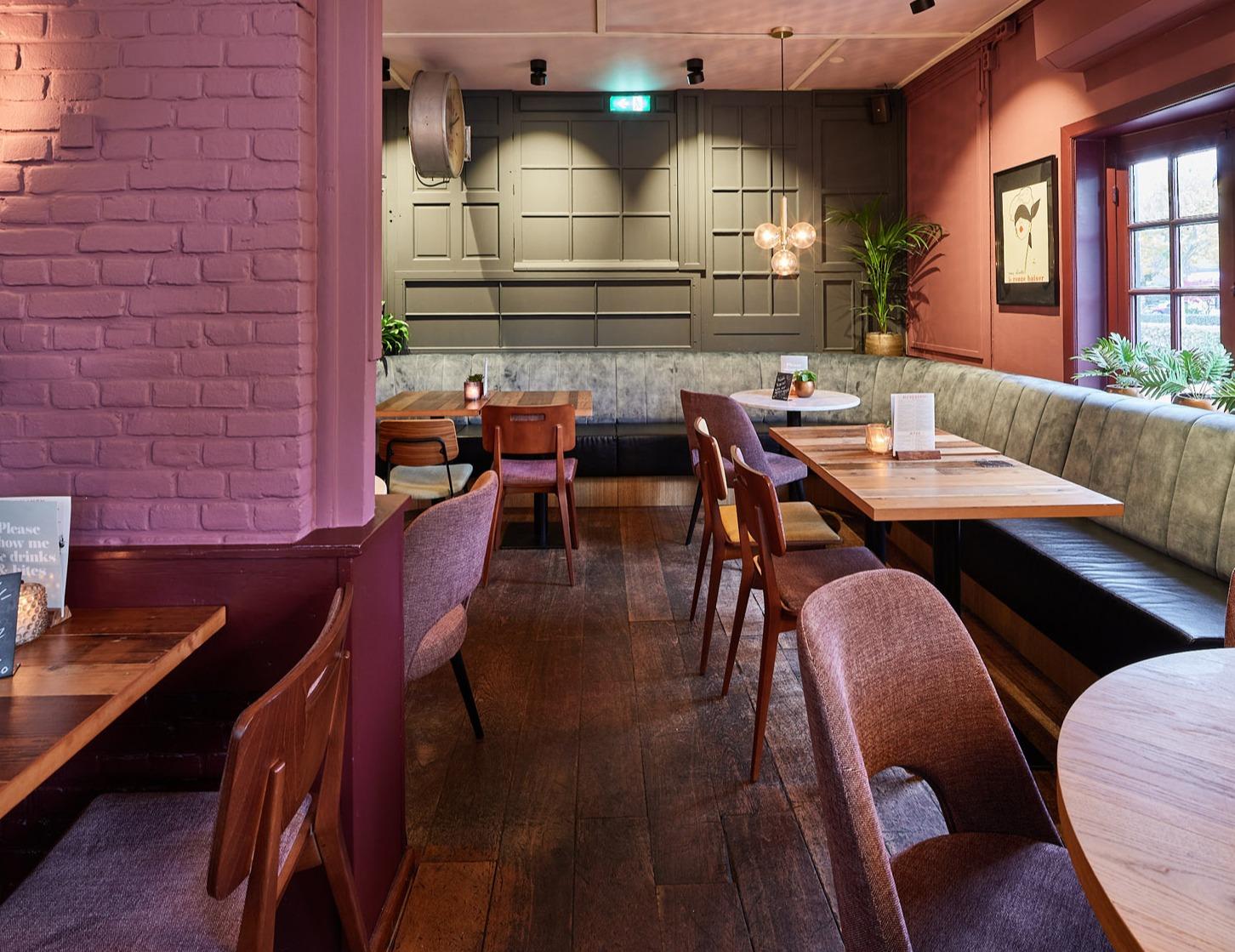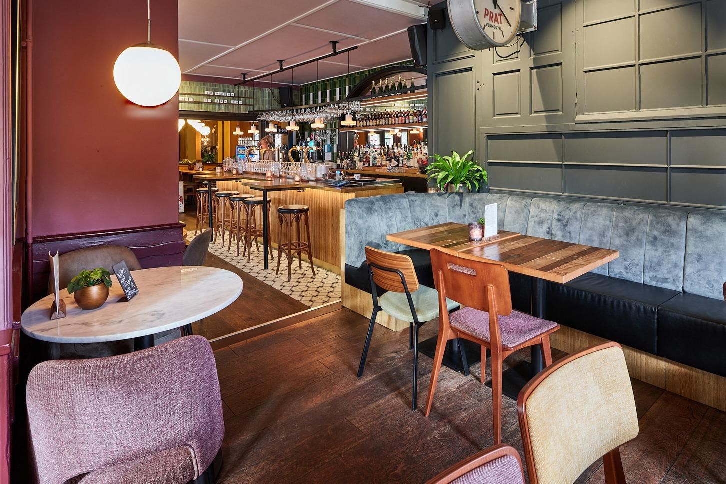 Eigenzinnig huiselijk Verderop langs de bar, verandert de sfeer met warme paarsrode muren. Verschillende tafelindelingen sieren het gebied, waaronder ronde tafels met visgraat tafelbladen, vergezeld door Ema 2 H armstoelen in verschillende gestoffeerde kleuren die de ruimte een eigenzinnige en huiselijk uitstraling geven. Tegen de muur vinden we opnieuw de gebombeerde wandbanken, ditmaal op normale zithoogte, gecombineerd met gestoffeerde New Retro stoelen en vierkante Inox tafeltjes; een ideale setting voor kleine of samen gevoegd voor grote gezelschappen. |