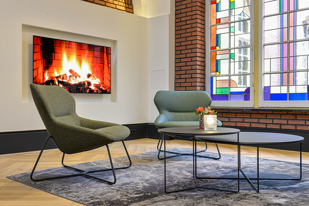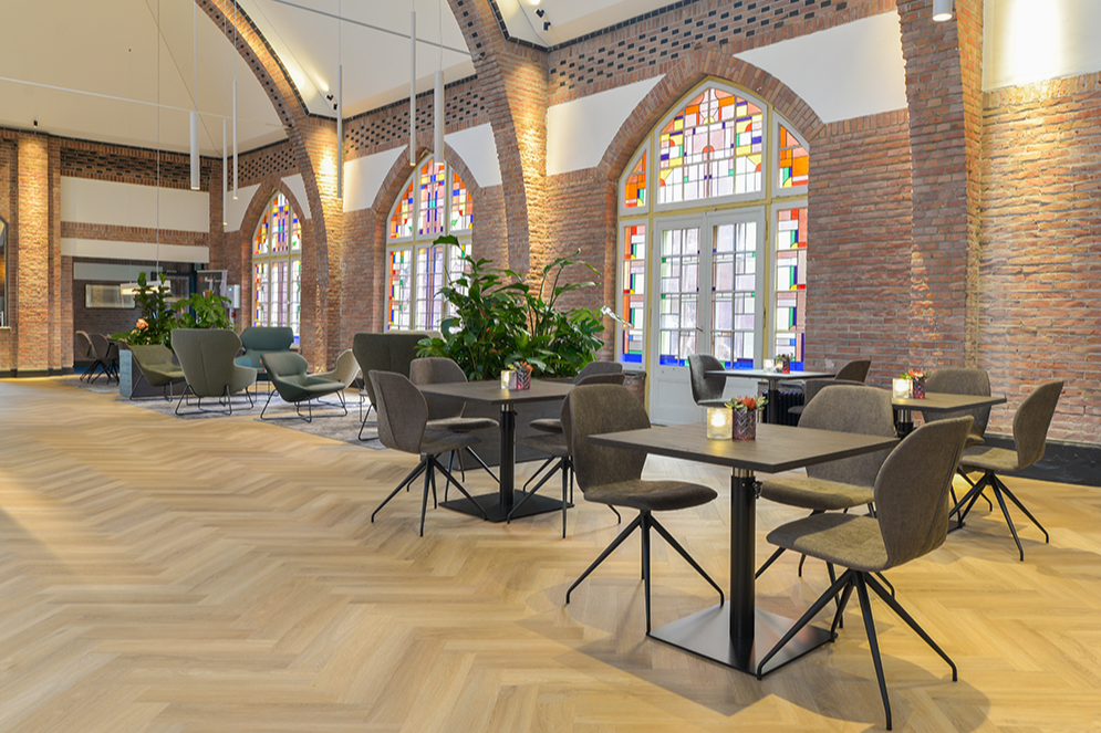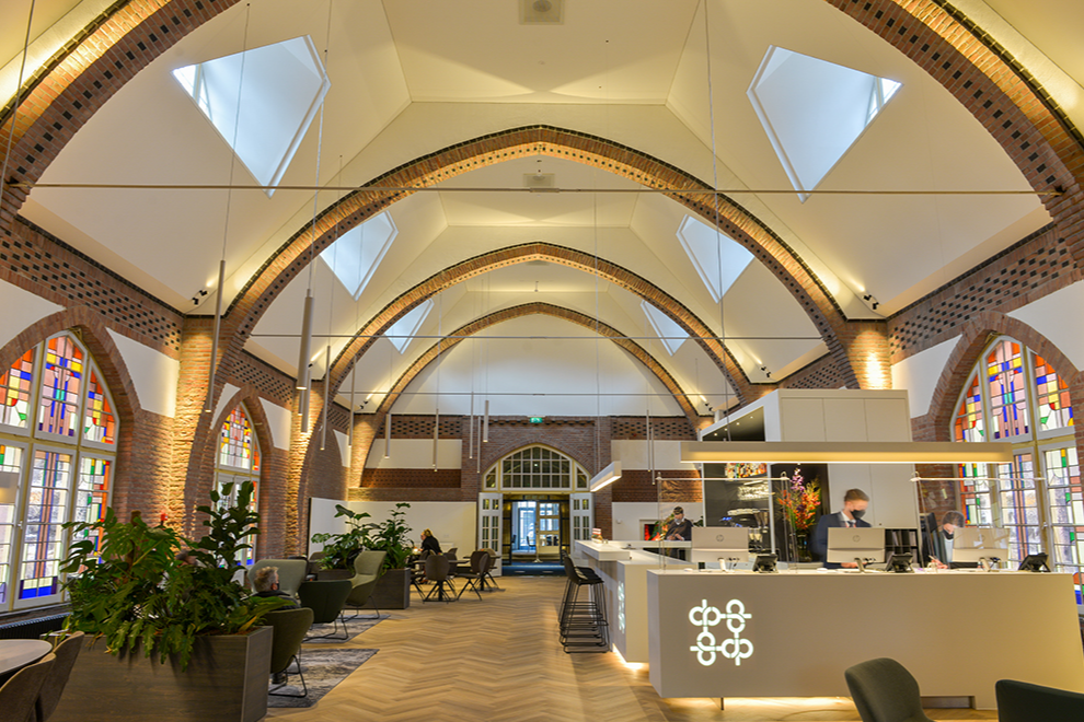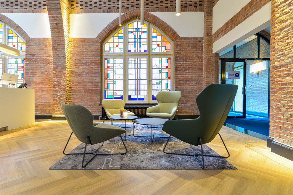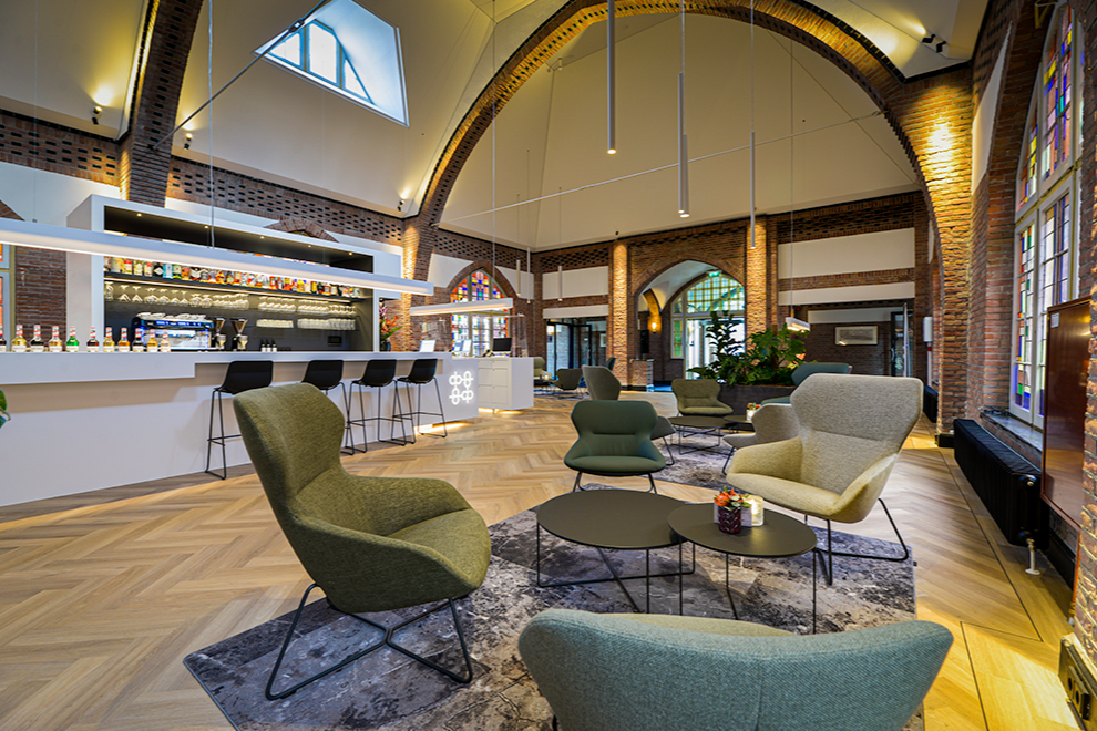 De lobby is de eerste plek waar gasten, maar ook leerlingen, kennis maken met het onderwijshotel. Een imposante ruimte met glas-in-lood ramen en een prachtig gewelven plafond maakt meteen veel indruk. Het interieur was daarentegen gedateerd en vroeg om frisse en moderne ideeën. Omdat de ruimte op zichzelf alle aandacht trekt, mocht het interieur rustig en ingetogen zijn. Er is gekozen voor een meubilair met organische vormen en simplistische onderstellen. De fauteuils met verschillende hoogtes in de rugleuning zijn bij elkaar gezet voor een speels effect. Het kleurenpallet is neutraal met verschillende grijs- en groenschakeringen. Het contrast tussen authentiek en modern is versterkt door het gebruik van design verlichting.