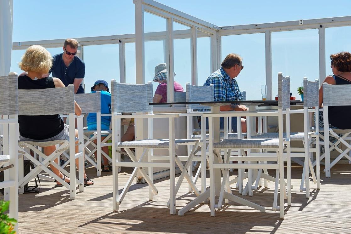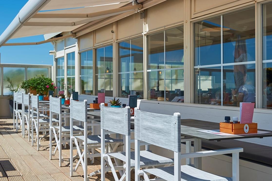 De mooie blauwe wandbank langs een van de raamzijden, gecombineerd met de comfortabele witte kuipstoelen weerkaatsen de zonnige frisse uitstraling van het terras buiten. Hier werden ook de tafels vervangen met een mooi rank wit onderstel en een betonlook tafelblad. |