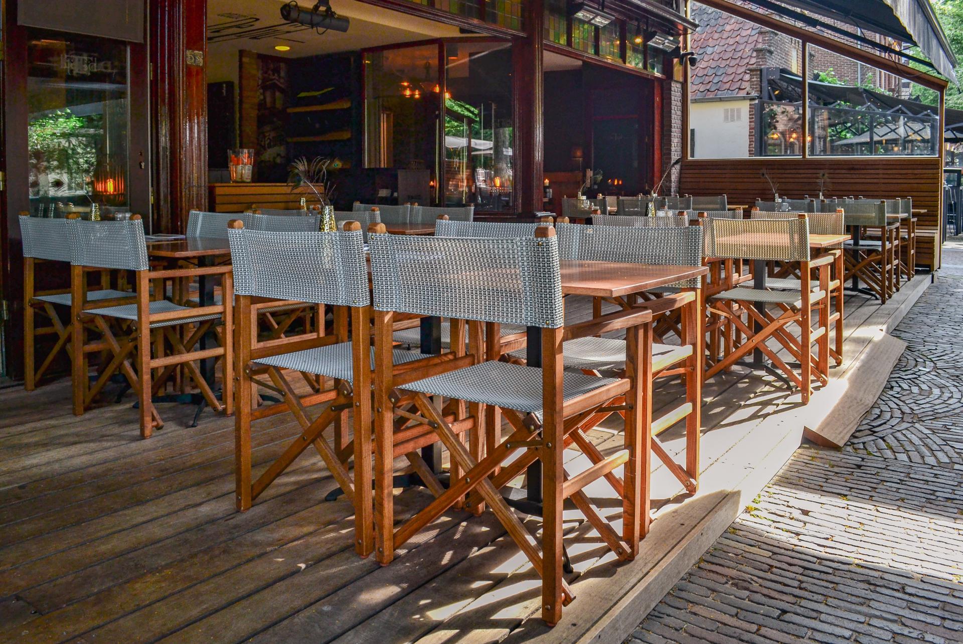 De bestaande tafelbladen zijn gebleven, maar de onderstellen hebben we vervangen door Stabily-onderstellen. Deze onderstellen zijn niet alleen slanker, maar zorgen ook voor extra stabiliteit een belangrijk pluspunt op een terras waar de bestrating hier en daar wat ongelijk is. Het resultaat is een rustiger en steviger geheel, met meer comfort voor zowel personeel als gasten.