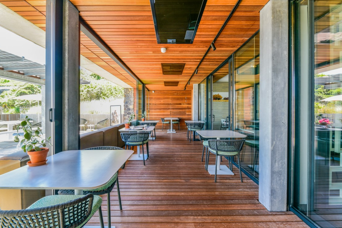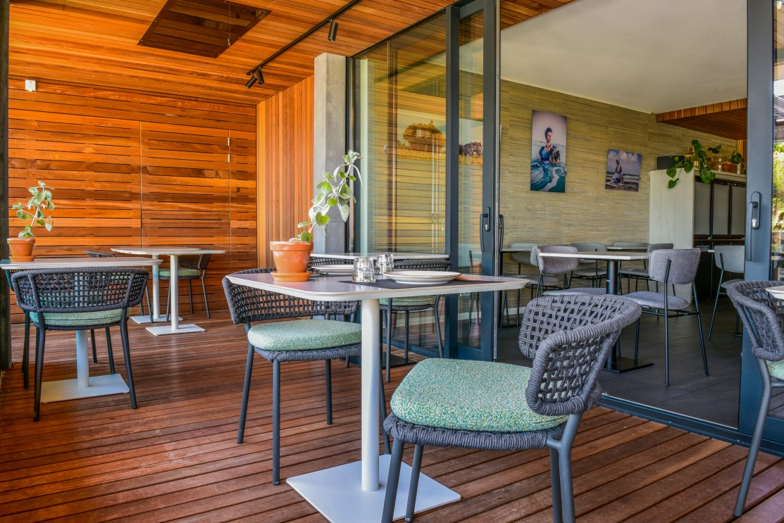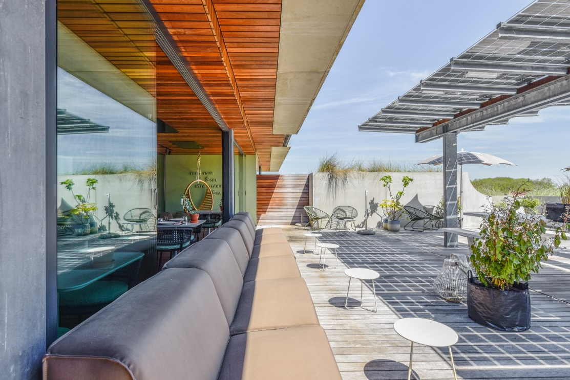 maar als je daar even klaar mee bent is daar het zonovergoten dakterras van het hotel. Voor de koudere dagen kun je binnen plaatsnemen aan de groene en grijze Daisy stoelen. |