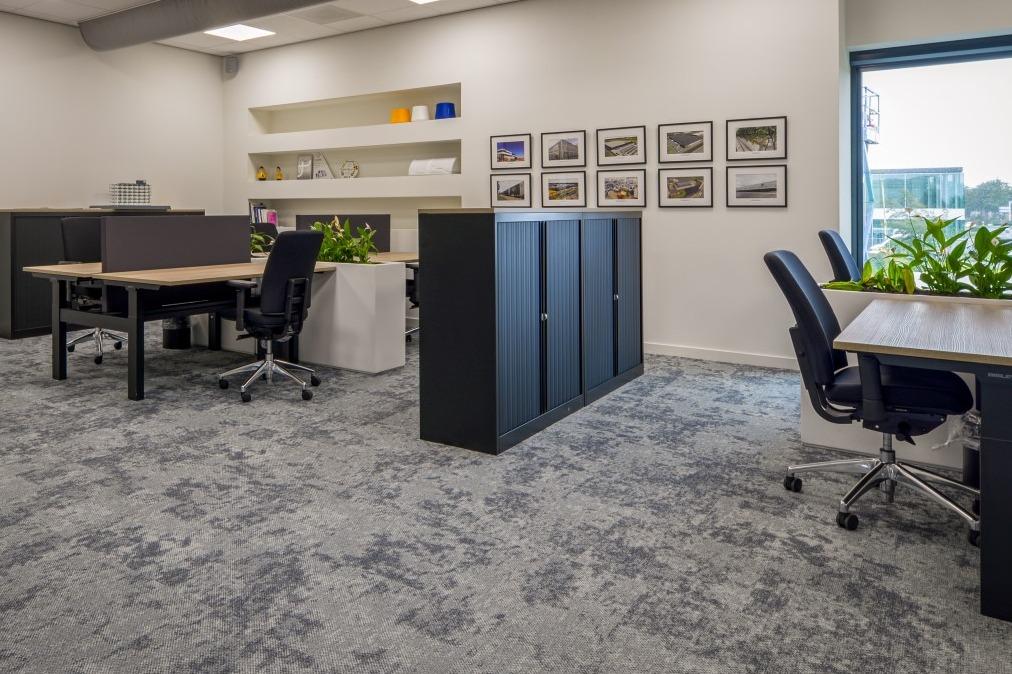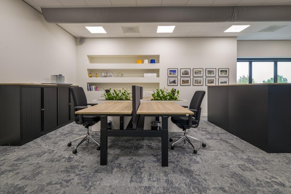 Hier zijn verschillende zitmogelijkheden gecreëerd, zodat er genoeg ruimte is om samen te zitten, maar ook om je even af te zonderen. Aan de bar en langs het raam zijn de Ema 1 SH krukken geplaatst in een cognac kleurige stoffering. Dit geeft een stoer en tegelijkertijd warm effect. Aan de lange tafel met A-frame zijn de bijpassende Ema 1 H stoelen geplaatst in een taupe reliëf stof. En achterin de kantine zijn een viertal Palace wandbanken geplaatst voor knussere zitplekken. Alle toegepaste stoffen zijn afneembaar en dus makkelijk schoon te houden. Efficiënte werkplekkenIn samenwerking met onze partner Bisley zijn de kantoren voorzien van minimalistische en efficiënte bureaus en bureaustoelen. Deze dubbele zit/sta werkplekken zijn allemaal voorzien van een schot tussen de tafels, voor de nodige privacy en concentratie. Naast de bureaus zijn plantenbakken ingezet, waardoor er een natuurlijke en frisse scheiding tussen de werkplekken ontstaat. De werkeilanden worden van elkaar gescheiden door zwarte archiefkasten, die mooi combineren met de onderstellen van de bureaus. Zo wordt er eenheid en rust in de kantoorruimtes gecreëerd. |