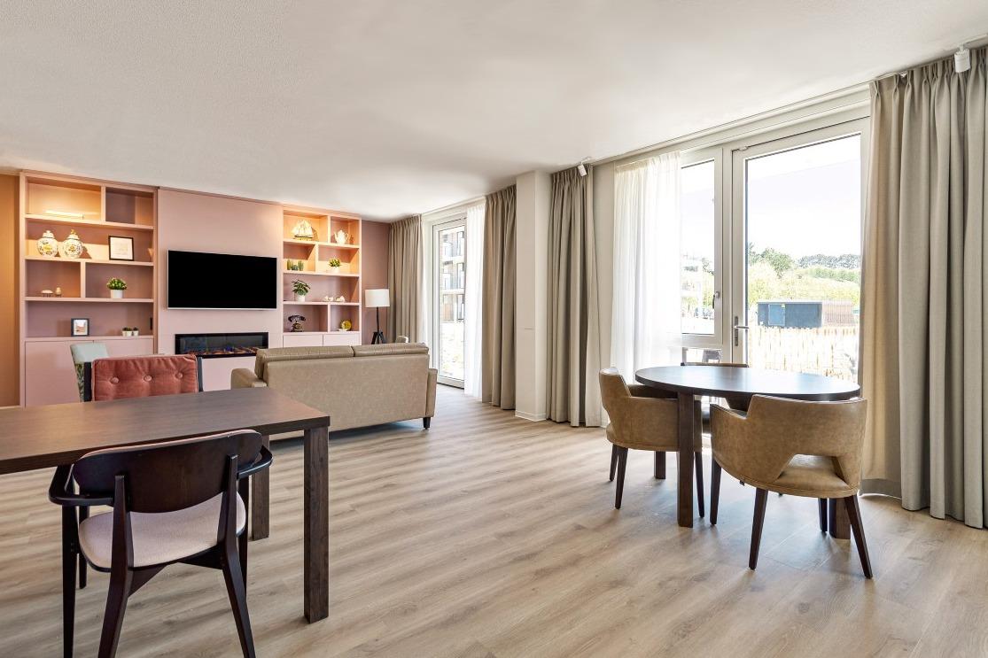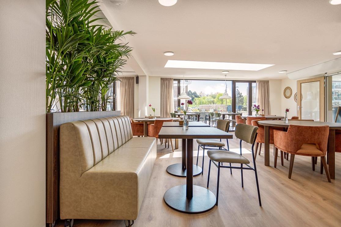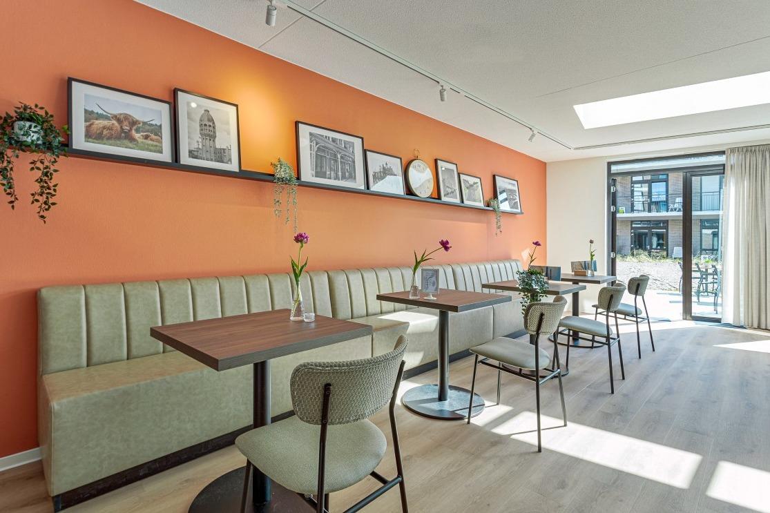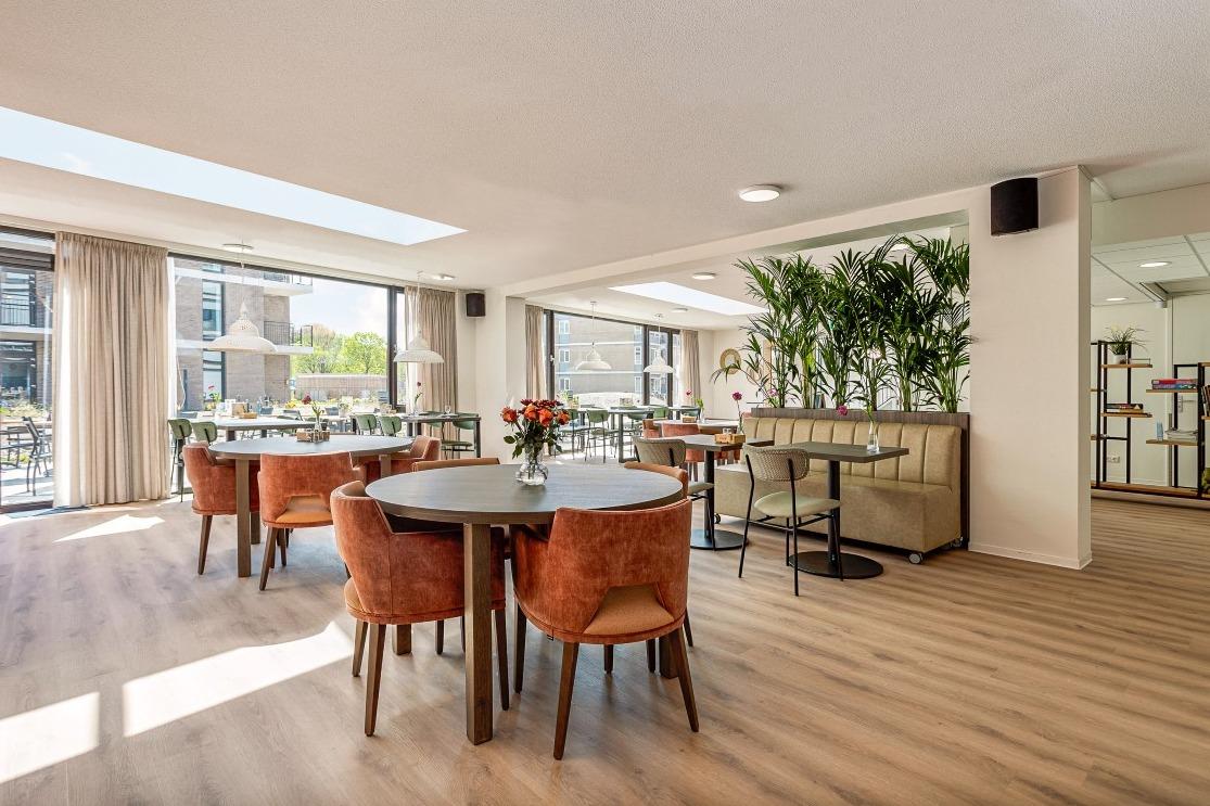 Aan de rand van Zandvoort, tussen de prachtige natuur en de duinen ligt verzorgingstehuis ‘Huis in de Duinen’ van zorgorganisatie Kennemerhart. Het nieuwbouw gedeelte werd begin 2023 opgeleverd en bestaat uit drie verdiepingen met in totaal 97 appartementen en tien gemeenschappelijke woonkamers. Onze interieurontwerper heeft in samenwerking met Mike Groot het centrale restaurant (Het Paviljoen) en de gemeenschappelijke woonkamers mogen inrichten. Het Paviljoen Het Paviljoen in Huis in de Duinen vormt een verbindende functie in de wijk. Iedereen is er welkom, bijvoorbeeld voor een kopje koffie, een voorstelling of een georganiseerde activiteit. Ook mensen uit de omgeving zijn er welkom. Wanneer je het restaurant binnen loopt, valt je oog meteen op de knal oranje accentmuur. Als tegenhanger is hier de Palace wandbank voor geplaatst, die met zijn zachte groene kleur heel fijn contrasteert met de muur. Aan de andere kant van de Inox tafels, zijn de ranke Daisy stoelen geplaatst in dezelfde groentint. |