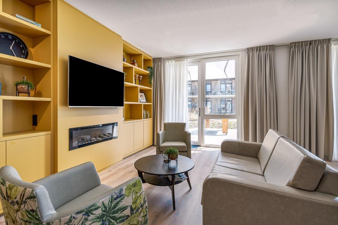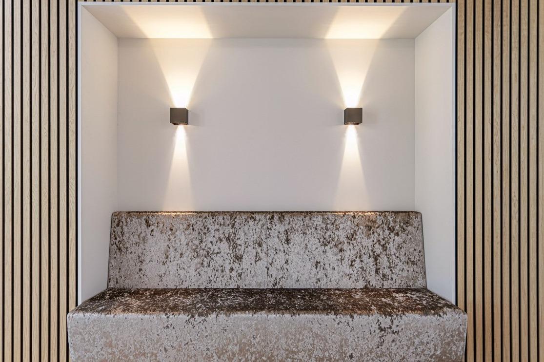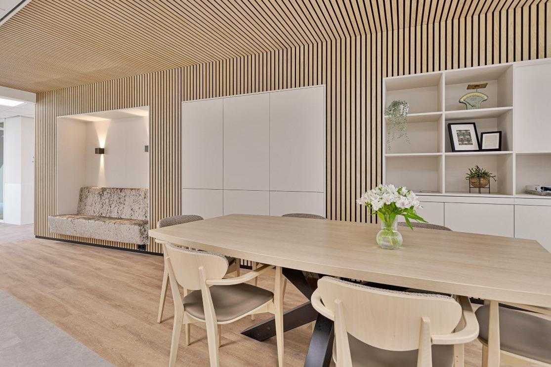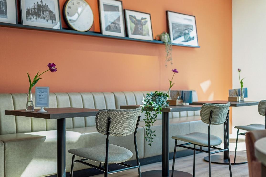 Aan de rand van Zandvoort, tussen de prachtige natuur en de duinen ligt verzorgingstehuis ‘Huis in de Duinen’ van zorgorganisatie Kennemerhart. Het nieuwbouw gedeelte werd begin 2023 opgeleverd en bestaat uit drie verdiepingen met in totaal 97 appartementen en tien gemeenschappelijke woonkamers. Onze interieurontwerper heeft in samenwerking met Mike Groot het centrale restaurant (Het Paviljoen) en de gemeenschappelijke woonkamers mogen inrichten. Het Paviljoen Het Paviljoen in Huis in de Duinen vormt een verbindende functie in de wijk. Iedereen is er welkom, bijvoorbeeld voor een kopje koffie, een voorstelling of een georganiseerde activiteit. Ook mensen uit de omgeving zijn er welkom. Wanneer je het restaurant binnen loopt, valt je oog meteen op de knal oranje accentmuur. Als tegenhanger is hier de Palace wandbank voor geplaatst, die met zijn zachte groene kleur heel fijn contrasteert met de muur. Aan de andere kant van de Inox tafels, zijn de ranke Daisy stoelen geplaatst in dezelfde groentint. |