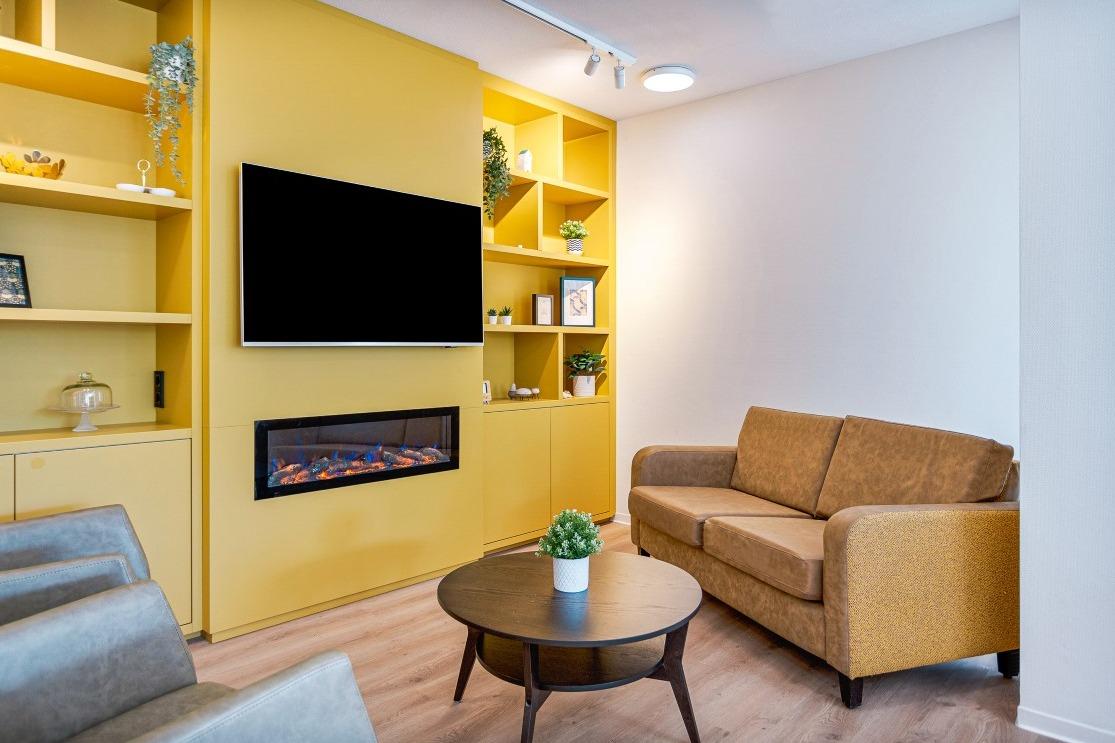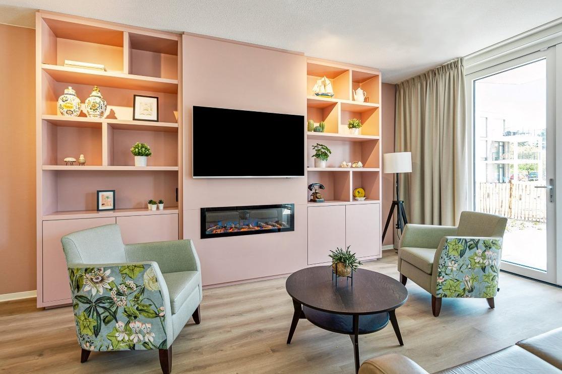 Dit zorgt meteen voor veel warmte in de ruimte, die op de accentmuur na helemaal wit geschilderd is. De rechthoekige tafels met stalen, trapeze onderstel worden gecombineerd met de Daisy stoelen en de verrijdbare Palace wandbank in een beige stoffering. De gemeenschappelijke woonkamers in het Huis in de Duinen zijn ieder geïnspireerd op een bloem die groeit in het duingebied. Hierdoor heeft iedere huiskamer een eigen accentkleur gekregen, wat het voor bewoners weer makkelijker maakt om een woonkamer te herkennen. De woonkamers met de gele verfbrem en de roze struikheide zie je voorbij komen op de foto’s. In iedere woonkamer is een relax hoekje gemaakt, waar de bewoners TV kunnen kijken. De comfortabele Julian fauteuil is aan de buitenkant gestoffeerd met een botanische print en is binnenin effen gestoffeerd. |