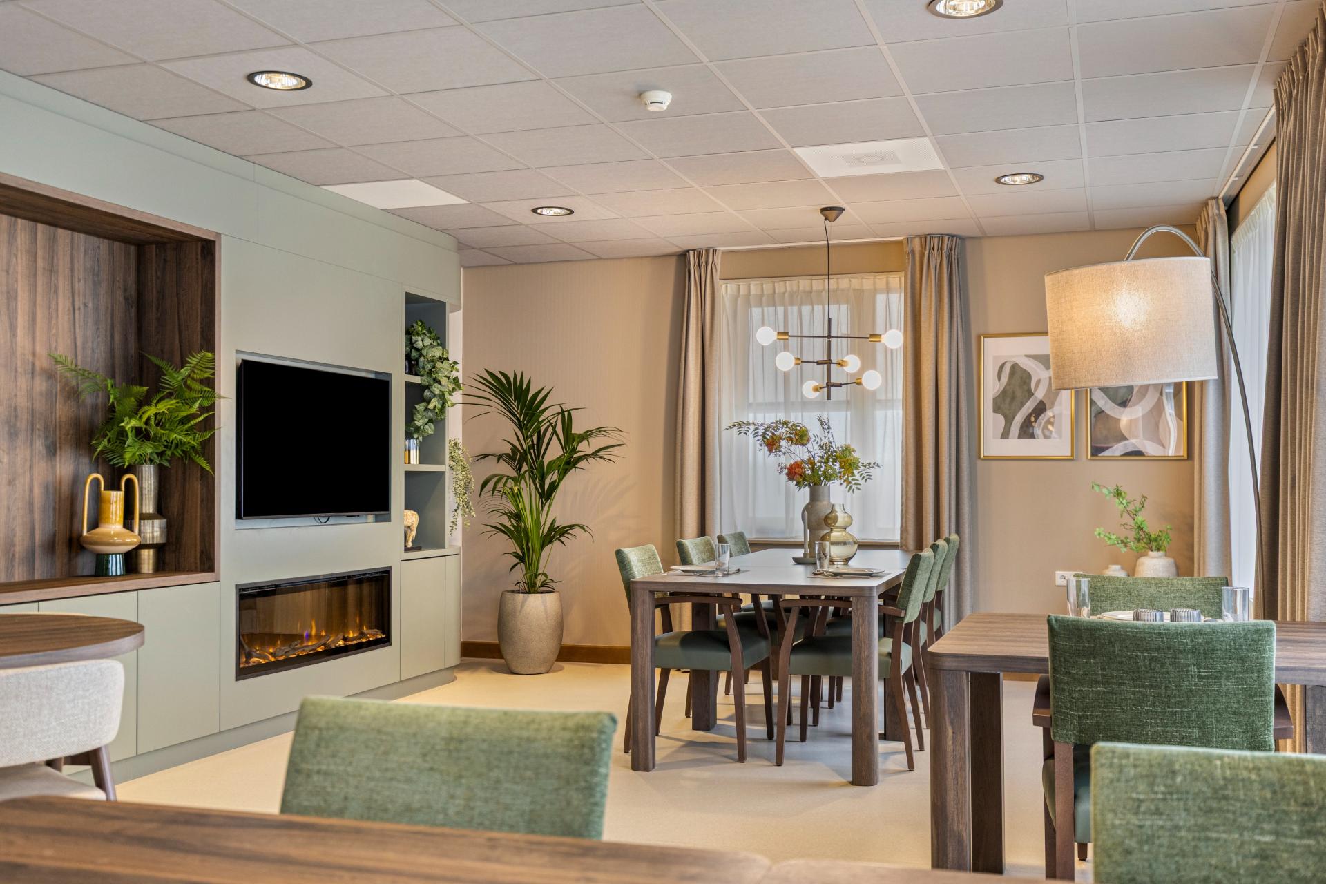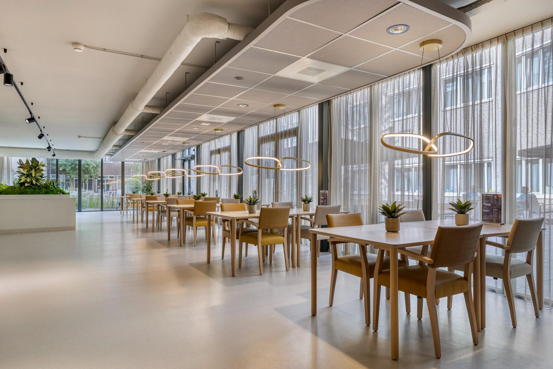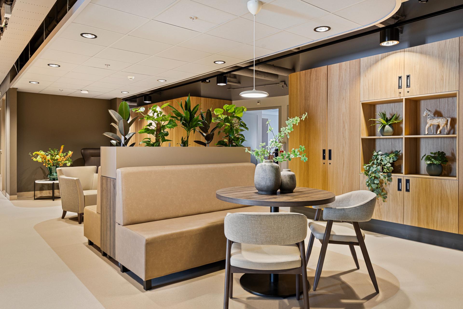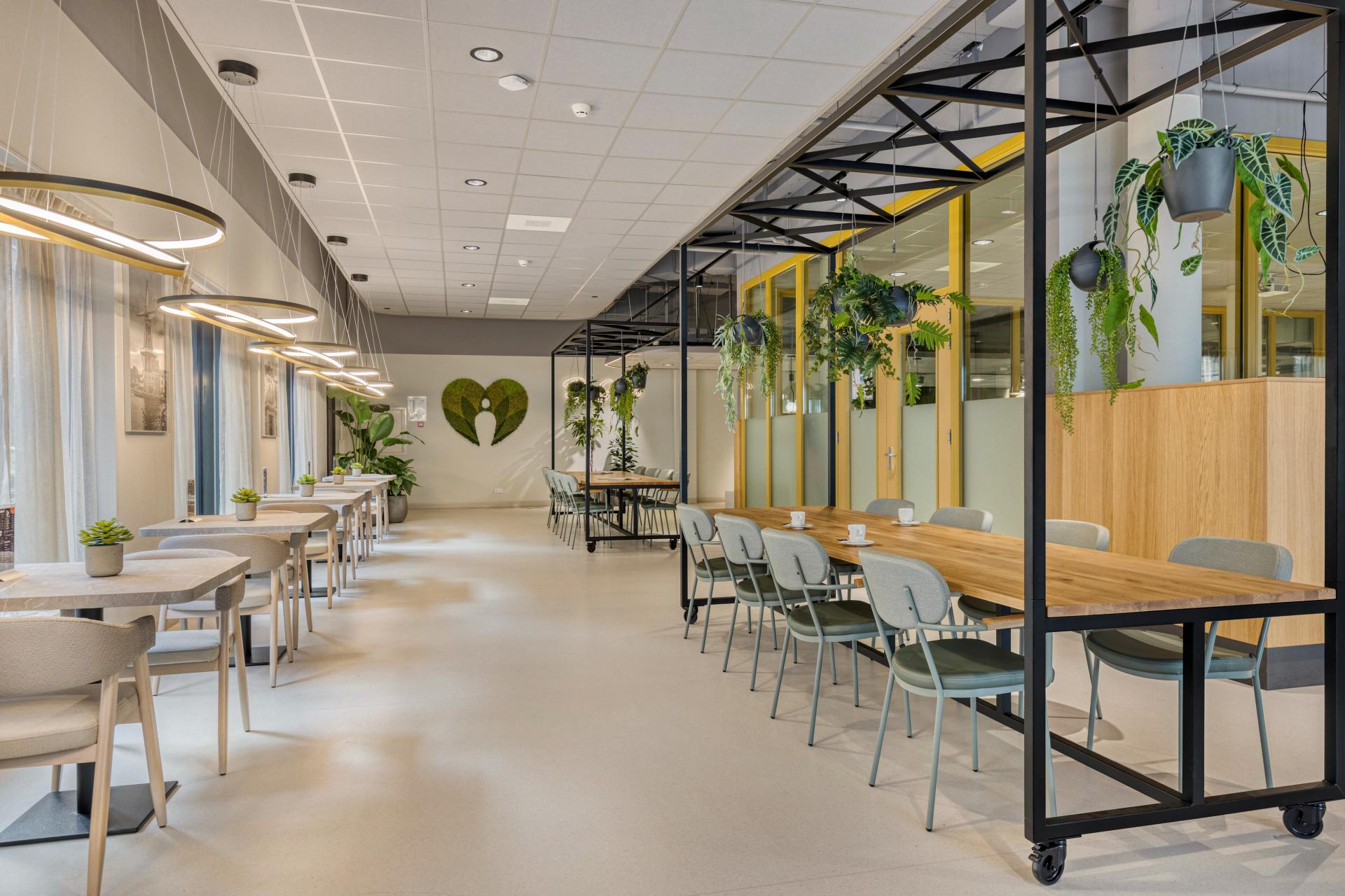 Het restaurant ‘Bij Jans’ is dé ontmoetingsplek binnen de Janskliniek. Cliënten, personeel en omwonenden kunnen hier terecht voor een dagmaaltijd, een kopje koffie of een goed gesprek. Midden in het restaurant staan de Greentable met Chester-armstoelen. De tafel is makkelijk te verplaatsen en de planten geven de ruimte een frisse uitstraling. De ruimte is zo ingericht dat cliënten en rolstoelgebruikers comfortabel aan kunnen aanschuiven aan de tafels. Om een speels effect te geven aan de ruimte, hebben de Veda A-stoelen twee verschillende kleuren. Ook is er gekozen voor de Bryson-fauteuils. De hoge rugleuning biedt een gevoel van geborgenheid, waardoor cliënten zich rustig kunnen terugtrekken. De zachte vormen dragen bij aan een prettige en huiselijke sfeer.