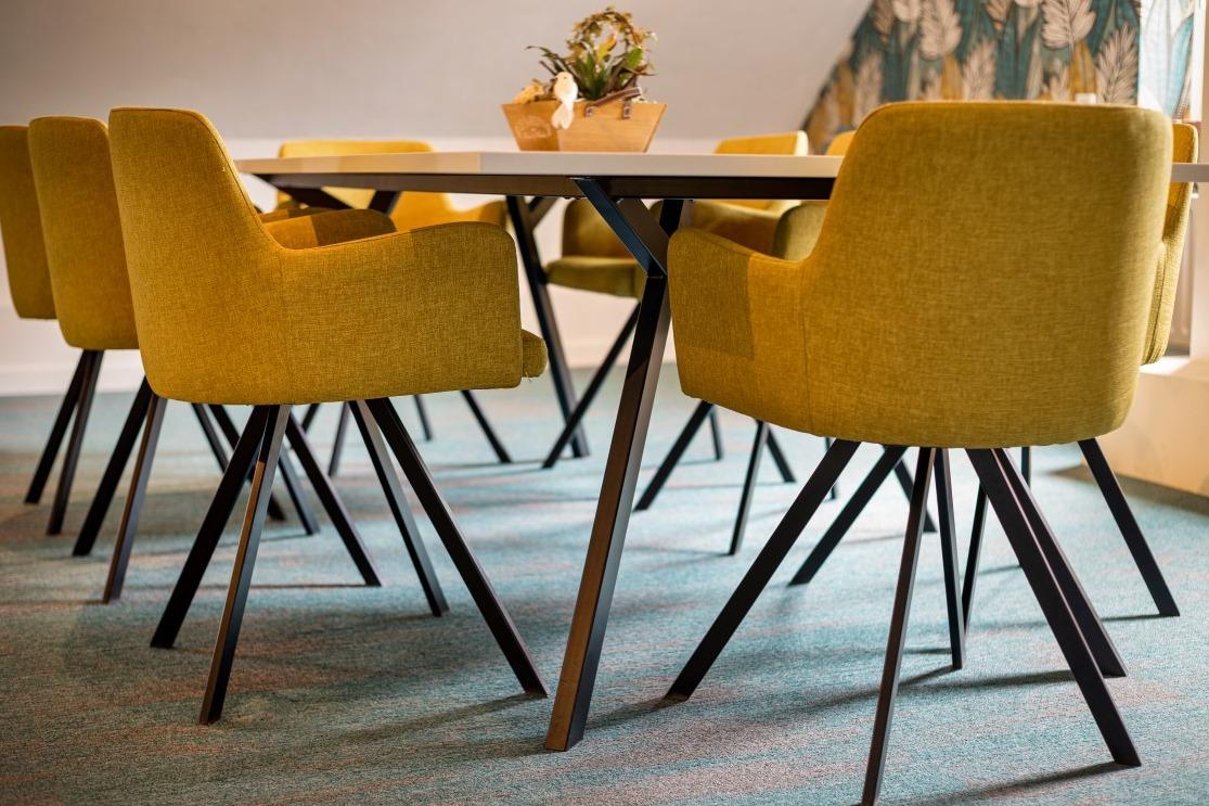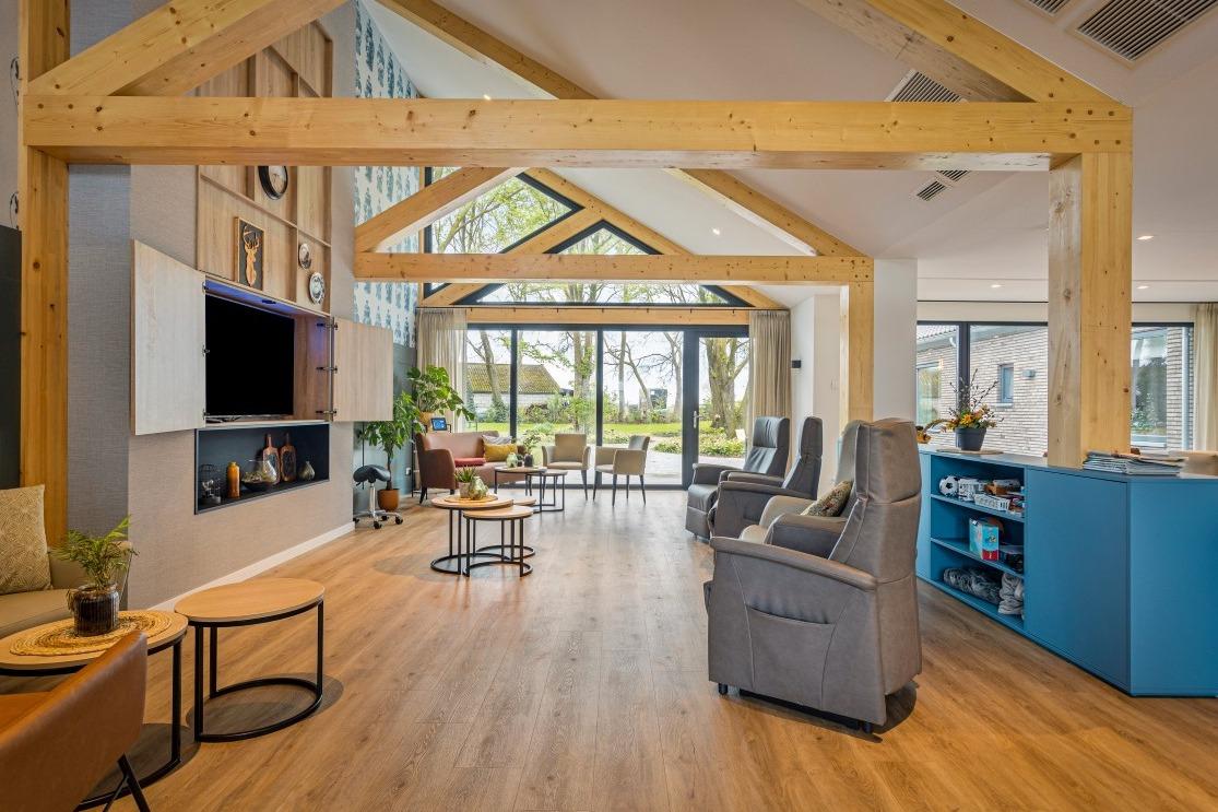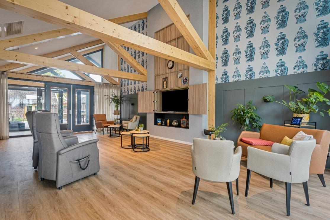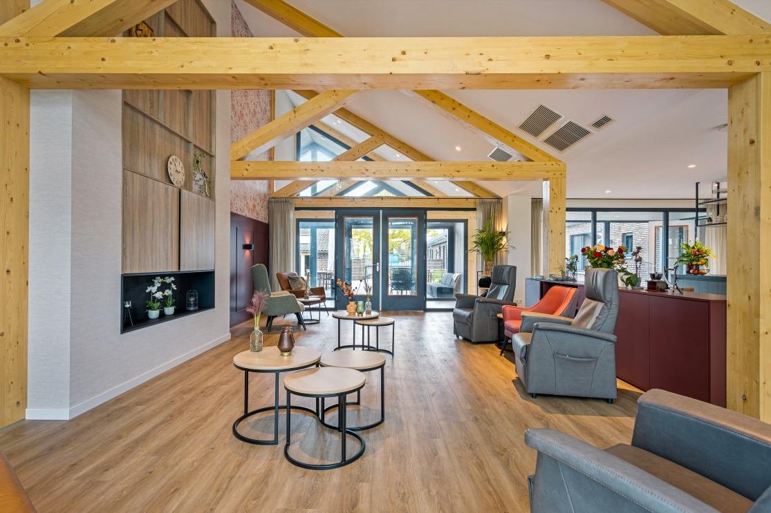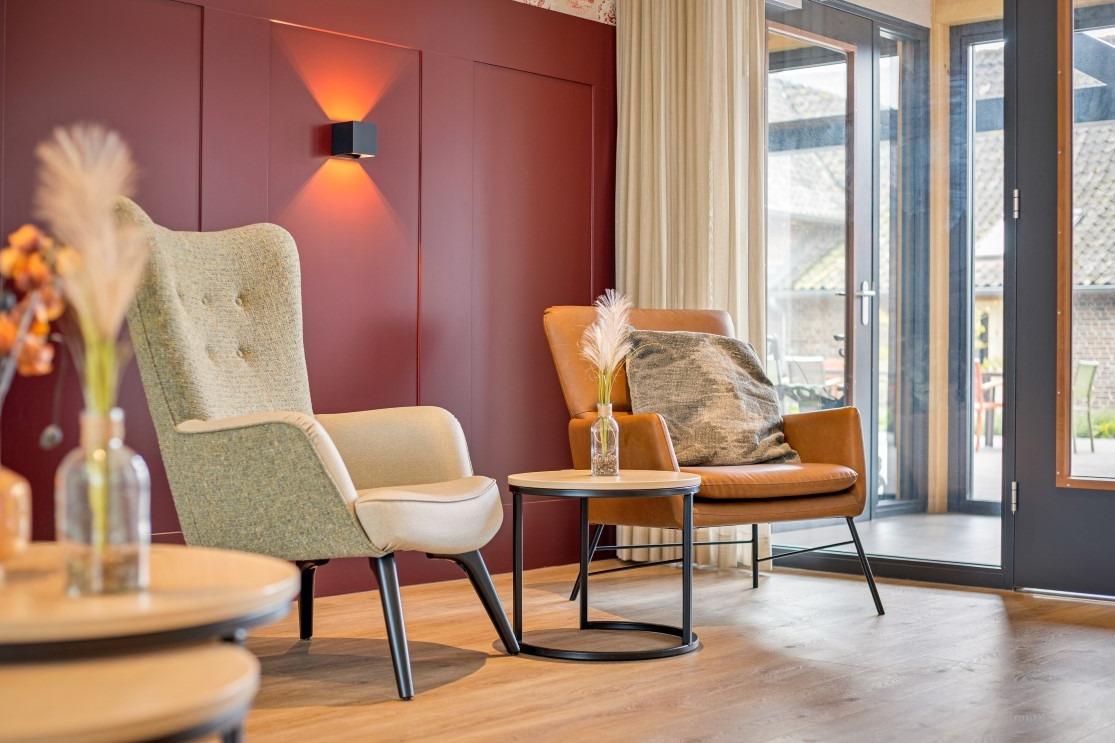 Samen met de relax fauteuils creëren ze een fijne balans in de ruimte. Ondanks dat in beide ruimtes hetzelfde meubilair is geplaatst, ervaar je een andere sfeer door de bijzondere wandafwerking. De ene woonkamer laat zich kenmerken door de warme, rode tinten en in de andere woonkamer ervaar de frisheid van de blauwe accentmuur. Ook aan het personeel van Lindezorg is gedacht, net als in de gezamenlijke woonkamers en keukens is in de personeelsruimte de huiselijkheid terug te vinden. Ook hier wordt de ruimte gesierd met de karakteristieke, houten balken en het vele daglicht. In de ruimte vinden we de lange overleg tafel met onze Spike stoelen met spinpoot in een gemêleerde, grijze stoffering. In de zithoek vinden we wederom de Cinema- en de Organi fauteuil terug die gekenmerkt worden door hun hoogwaardig comfort. Kleinschalig en huiselijk vat de prachtige locatie van Lindezorg samen, hier is de perfect balans gevonden in een interieur dat zowel rust als authenticiteit uitstraalt. |