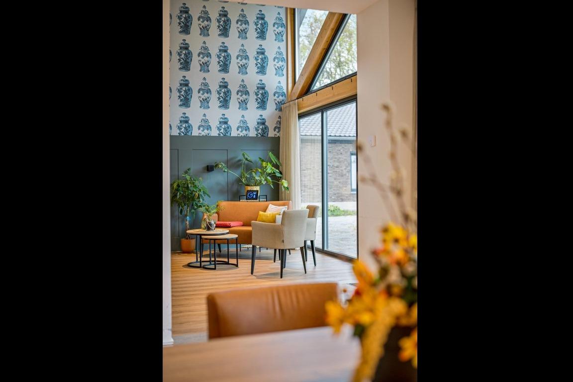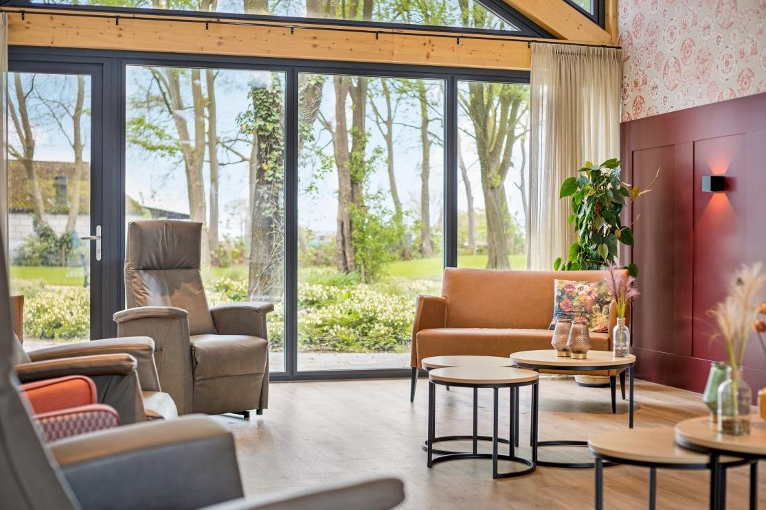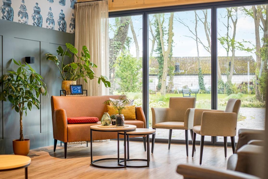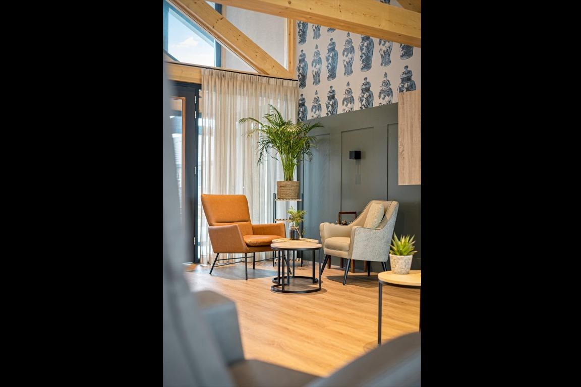 Samen met de relax fauteuils creëren ze een fijne balans in de ruimte. Ondanks dat in beide ruimtes hetzelfde meubilair is geplaatst, ervaar je een andere sfeer door de bijzondere wandafwerking. De ene woonkamer laat zich kenmerken door de warme, rode tinten en in de andere woonkamer ervaar de frisheid van de blauwe accentmuur. Ook aan het personeel van Lindezorg is gedacht, net als in de gezamenlijke woonkamers en keukens is in de personeelsruimte de huiselijkheid terug te vinden. Ook hier wordt de ruimte gesierd met de karakteristieke, houten balken en het vele daglicht. In de ruimte vinden we de lange overleg tafel met onze Spike stoelen met spinpoot in een gemêleerde, grijze stoffering. In de zithoek vinden we wederom de Cinema- en de Organi fauteuil terug die gekenmerkt worden door hun hoogwaardig comfort. Kleinschalig en huiselijk vat de prachtige locatie van Lindezorg samen, hier is de perfect balans gevonden in een interieur dat zowel rust als authenticiteit uitstraalt. |
