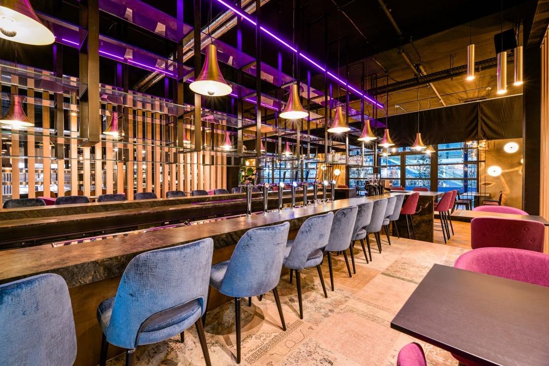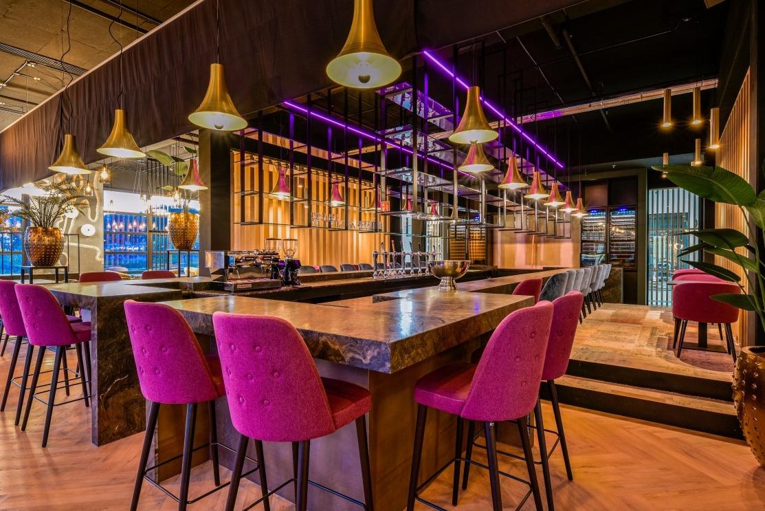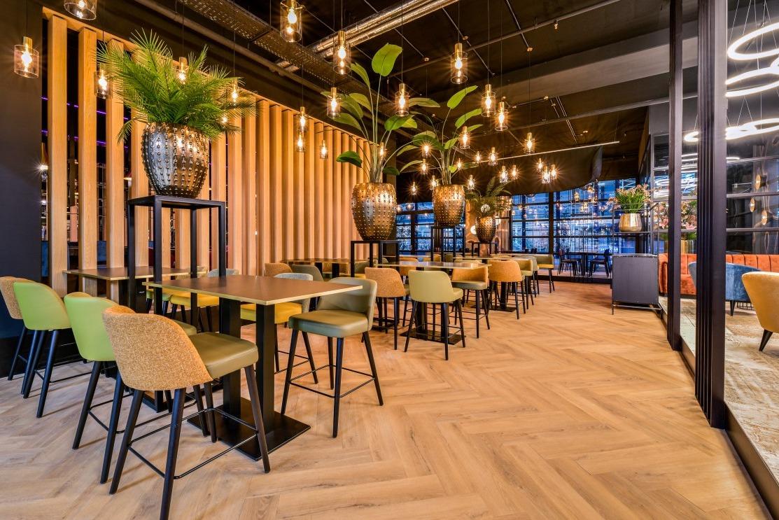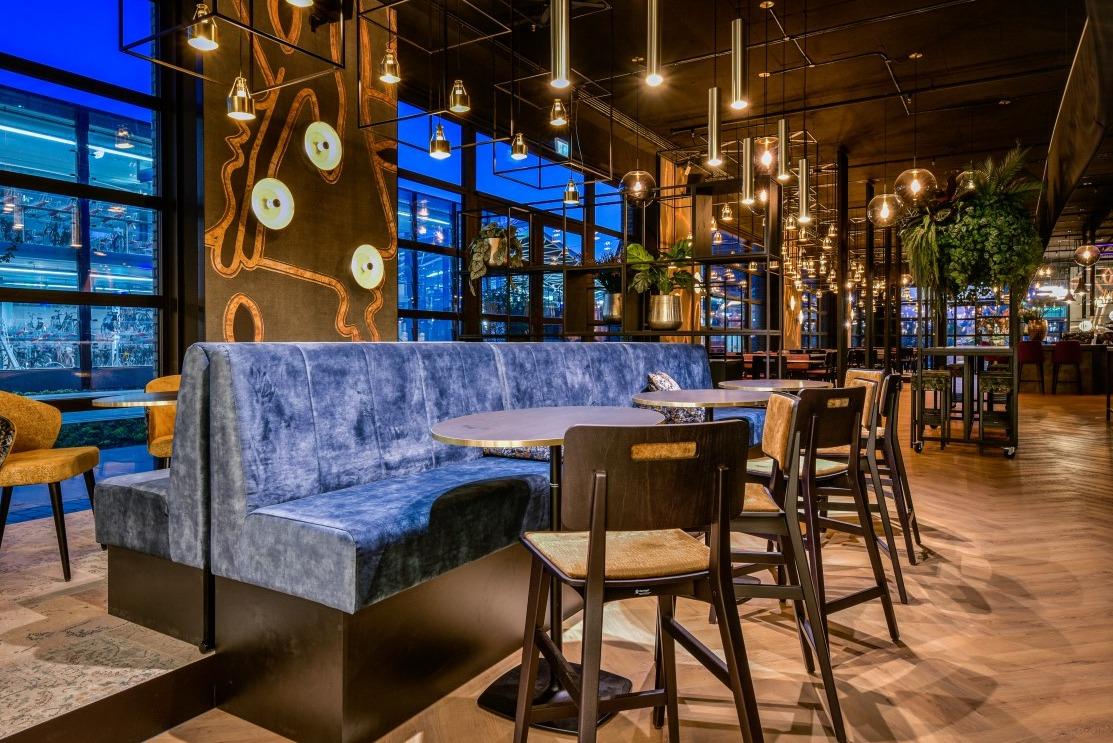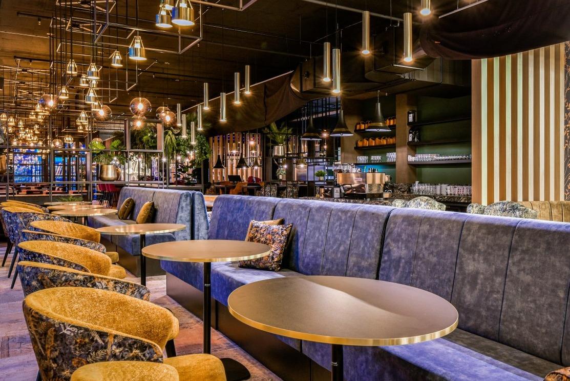 Natuurlijke divider De langwerpige ruimte met uitzicht op het centraal station, was een uitdaging om in te delen. Maar de op maat gemaakte Risto wandbanken in verschillende hoogtes boden de uitkomst. Deze velours beklede banken zijn met de ruggen tegen elkaar geplaatst, waardoor er ontzettend veel zitplekken zijn gecreëerd. Door de hoogte verschillen in de wandbanken zijn er drie soorten zitmogelijkheden ontstaan. Je kunt plaats nemen aan de opvallende en comfortabele gele Ema 3 stoelen. Liever een actievere zit? Dan staan aan de andere kant de New Retro S krukken voor je klaar. En voor de relaxers onder ons staan er bijna koninklijke Yvan fauteuils klaar in wederom die opvallende jungle stoffering. De grotere groepen kunnen plaats nemen aan de ovale Billy eetbanken, deze worden gecombineerd met de Loop Mono stoelen in een goude stoffering. Messing als rode draad Bijzonder aan dit interieur is het diverse gebruik van kleuren en prints. Toch komt het interieur niet chaotisch over en is er sprake van eenheid en een goed doorgevoerde sfeer door de algehele ruimte. Het gebruik van messing details in onder andere de tafelranden van de Tonda en Stylus tafels, de verlichting en accessoires versterkt die eenheid. Door de 250 plekken die Mood rijk is, zal er altijd een geschikt plek zijn om te genieten van de geweldige Aziatische keuken. |