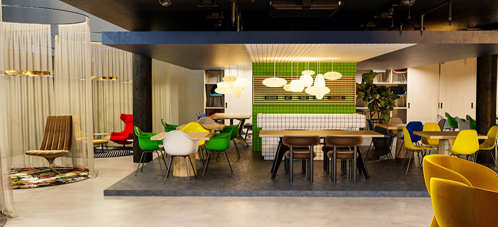Vanuit de opdrachtgever kwam de vraag om ook een familiekamer te ontwerpen. De relatief kleine ruimte is optimaal benut door een stapelbed te plaatsen. Hierdoor is het toch mogelijk om een hele familie in het hotel te laten overnachten. De uitgesproken kleuren en materialen die voor deze kamer zijn gebruikt, zal ook de jongere gasten prikkelen en enthousiasmeren. Ook hier is een maatwerk meubel geplaatst waar de TV en het koffiezetapparaat in geplaatst is.