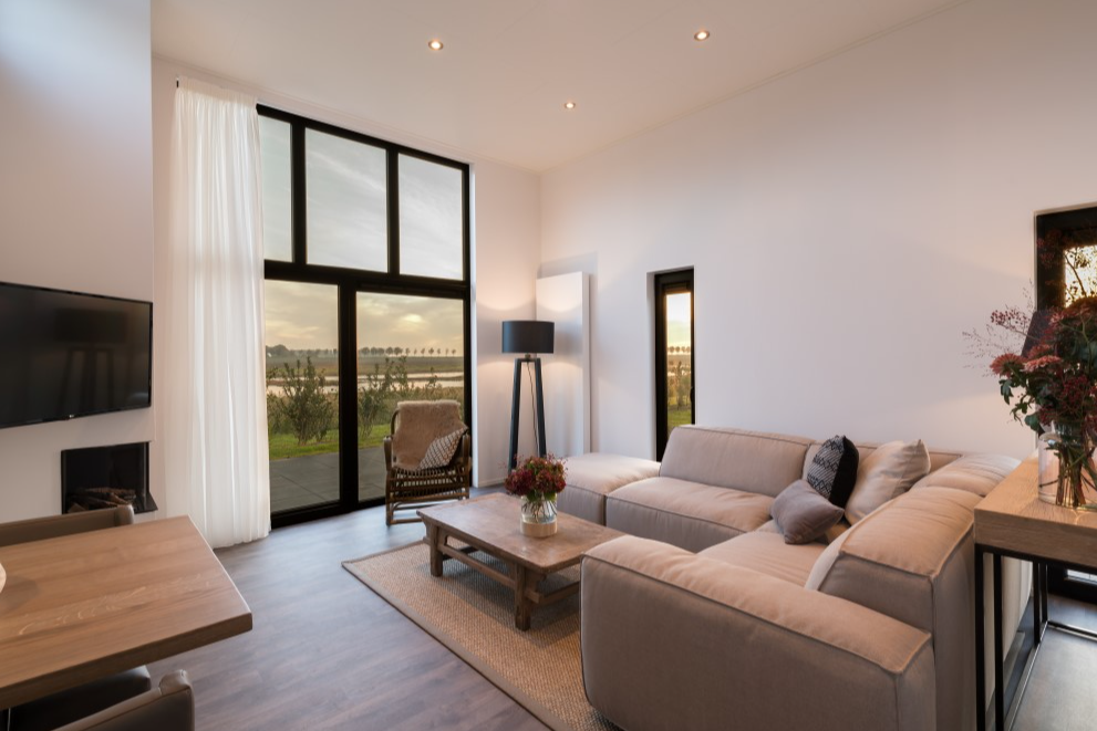 Logischerwijs is er voor de inrichting ook gekozen voor een natuurlijke uitstraling; rustige kleuren zoals wit, bruin, taupe en grijs. Ook zie je veel hout terug komen in de accessoires en de bijzet- en eettafels. Door de hoge raampartijen en materiaal keuze, wordt binnen met buiten op een natuurlijk manier met elkaar verweven. |