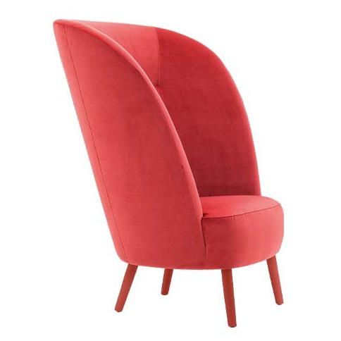 De Rose serie wordt gekenmerkt door een omhullend en boeiend silhouet. De Rose 03043 loungestoel heeft een hoge rugleuning, kuip van multiplex. Zitting met zwemvliezen en gestoffeerd op het frame met vier massief houten gedraaide poten in beukenhout.
