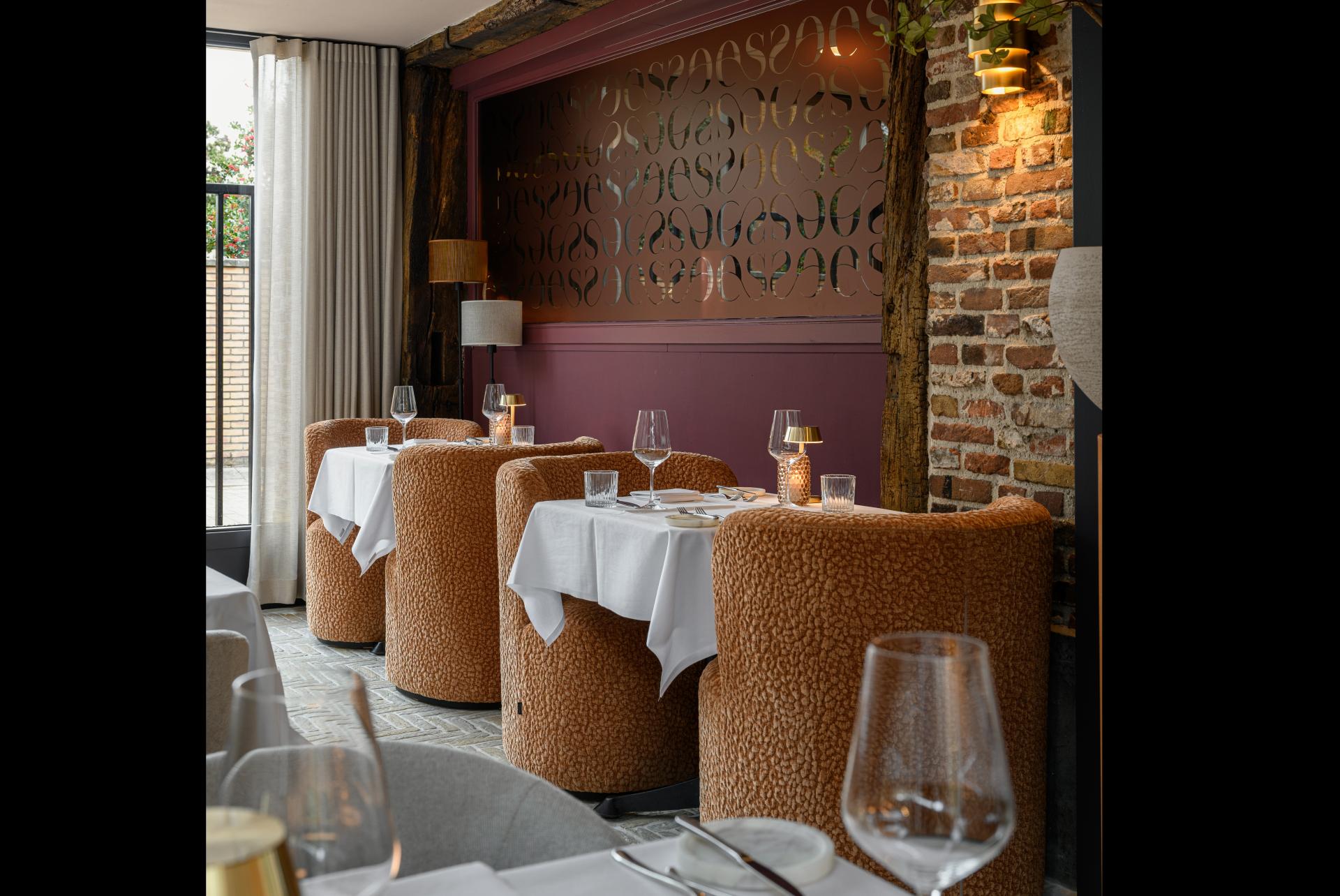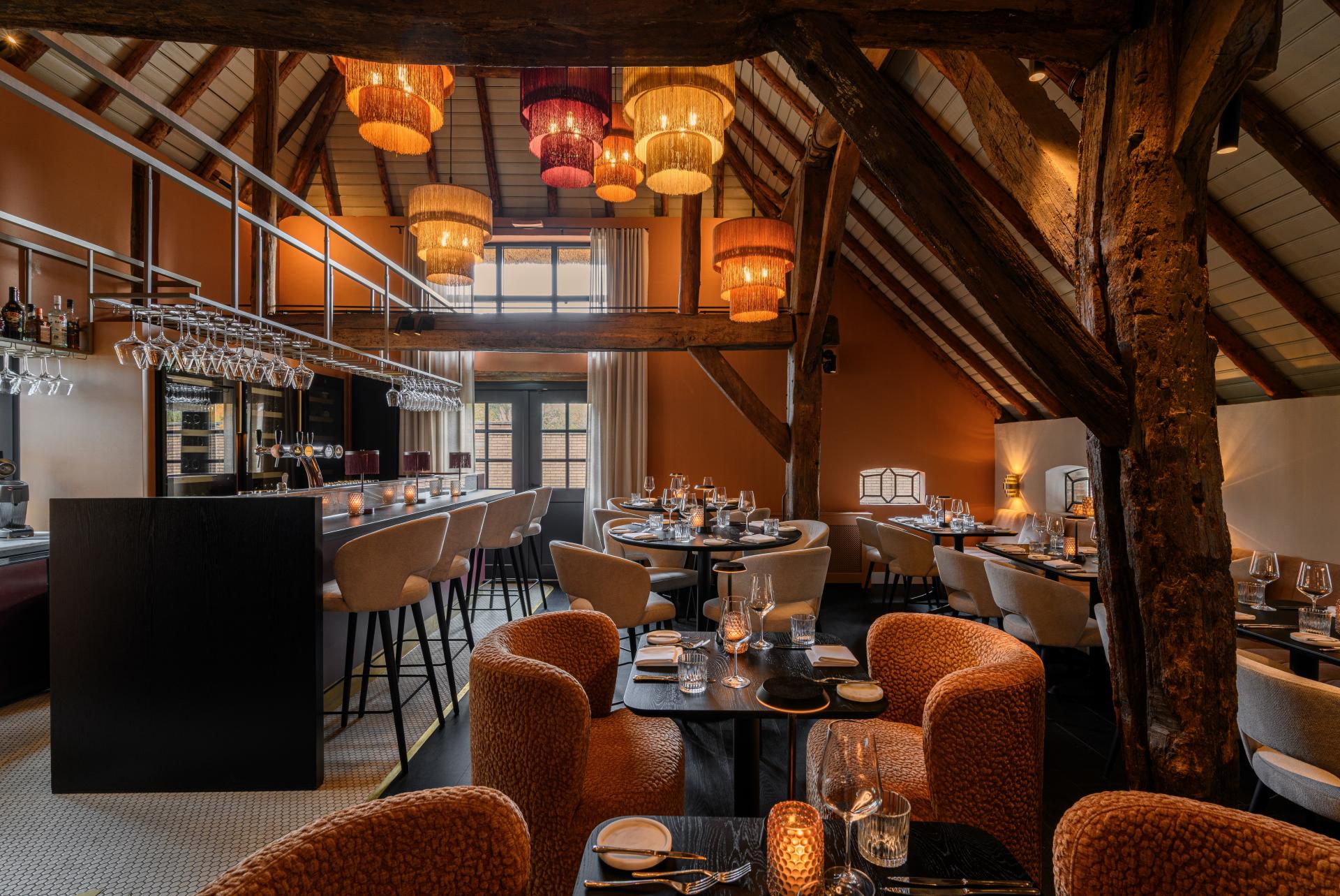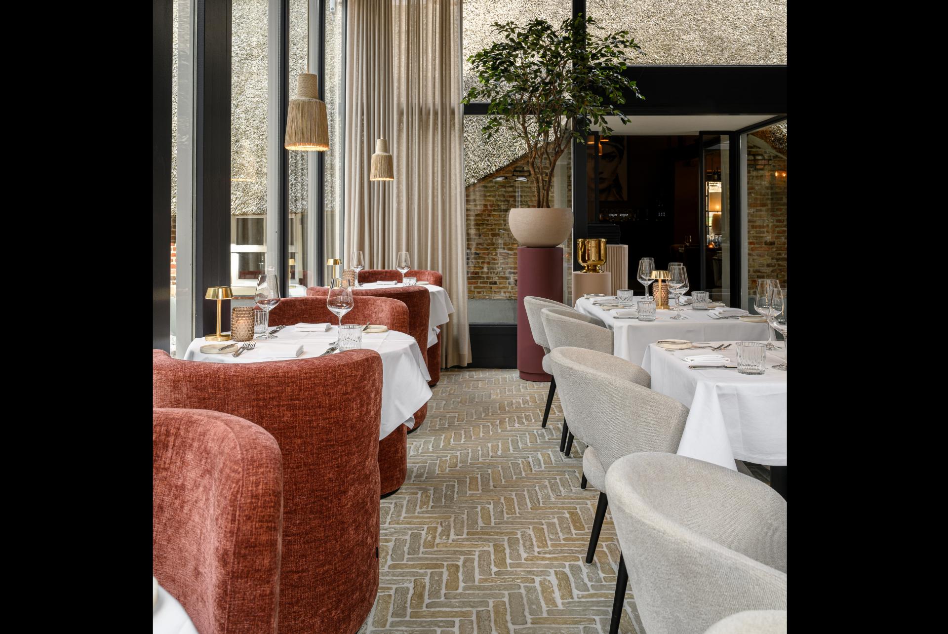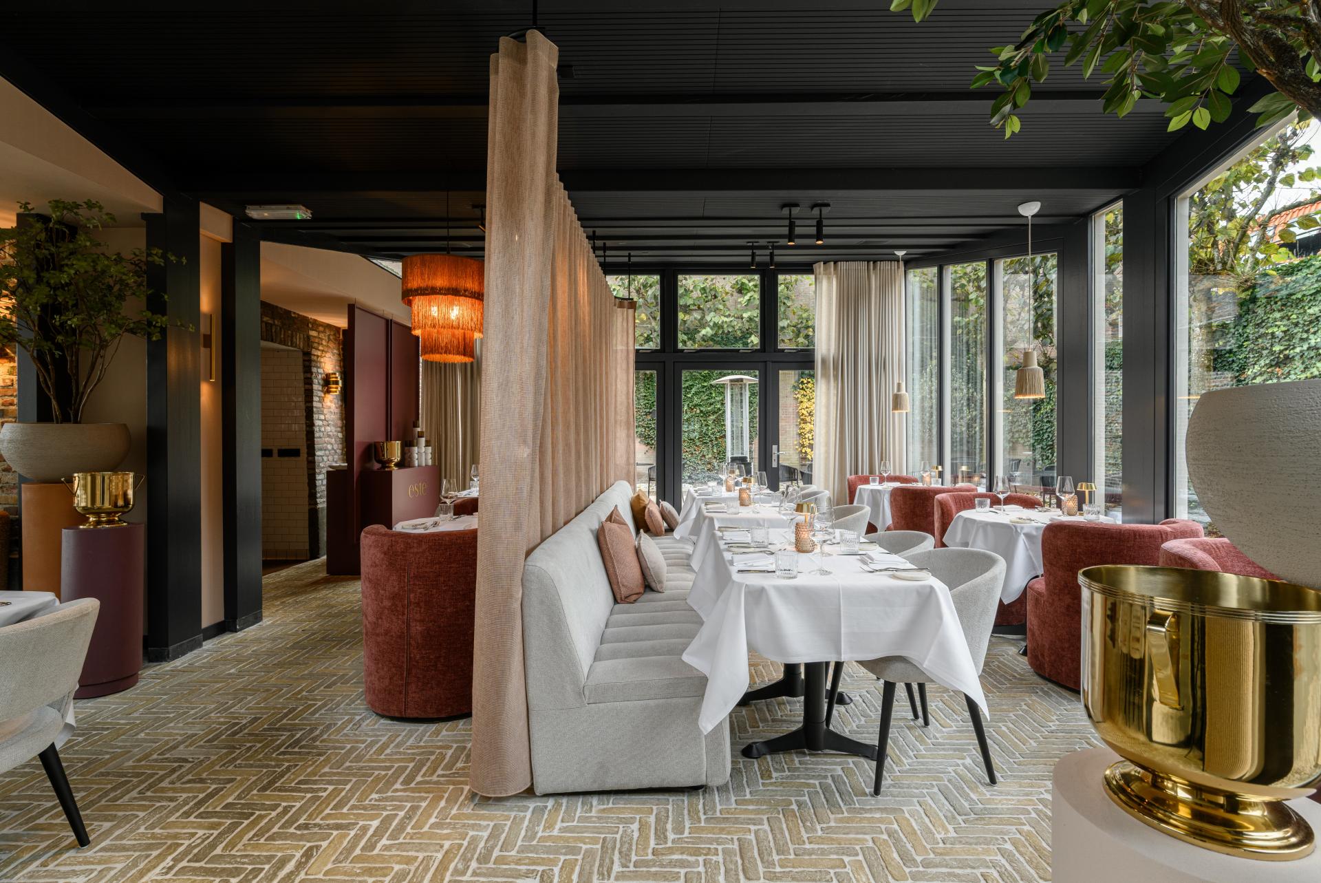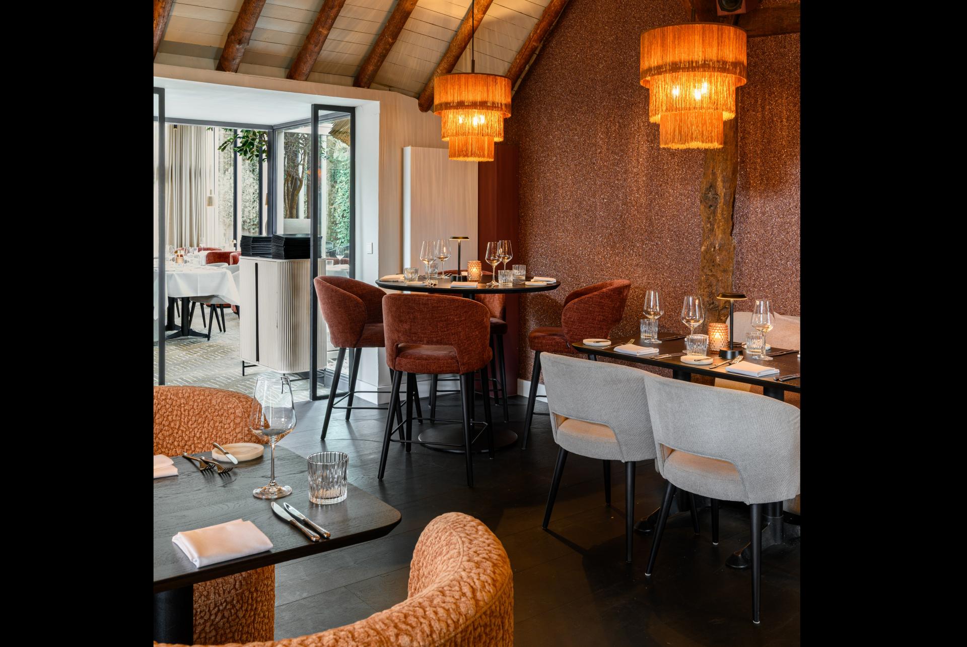 Als je vanuit de bar doorloopt naar de oranjerie merk je direct dat de sfeer verandert. Het natuurlijke licht valt hier mooi naar binnen door de grote raampartijen, waardoor de ruimte een open uitstraling heeft. De stenen vloer en de rode Montreal-fauteuils vormen een stijlvol contrast en sluiten mooi aan bij de andere meubels in de ruimte.