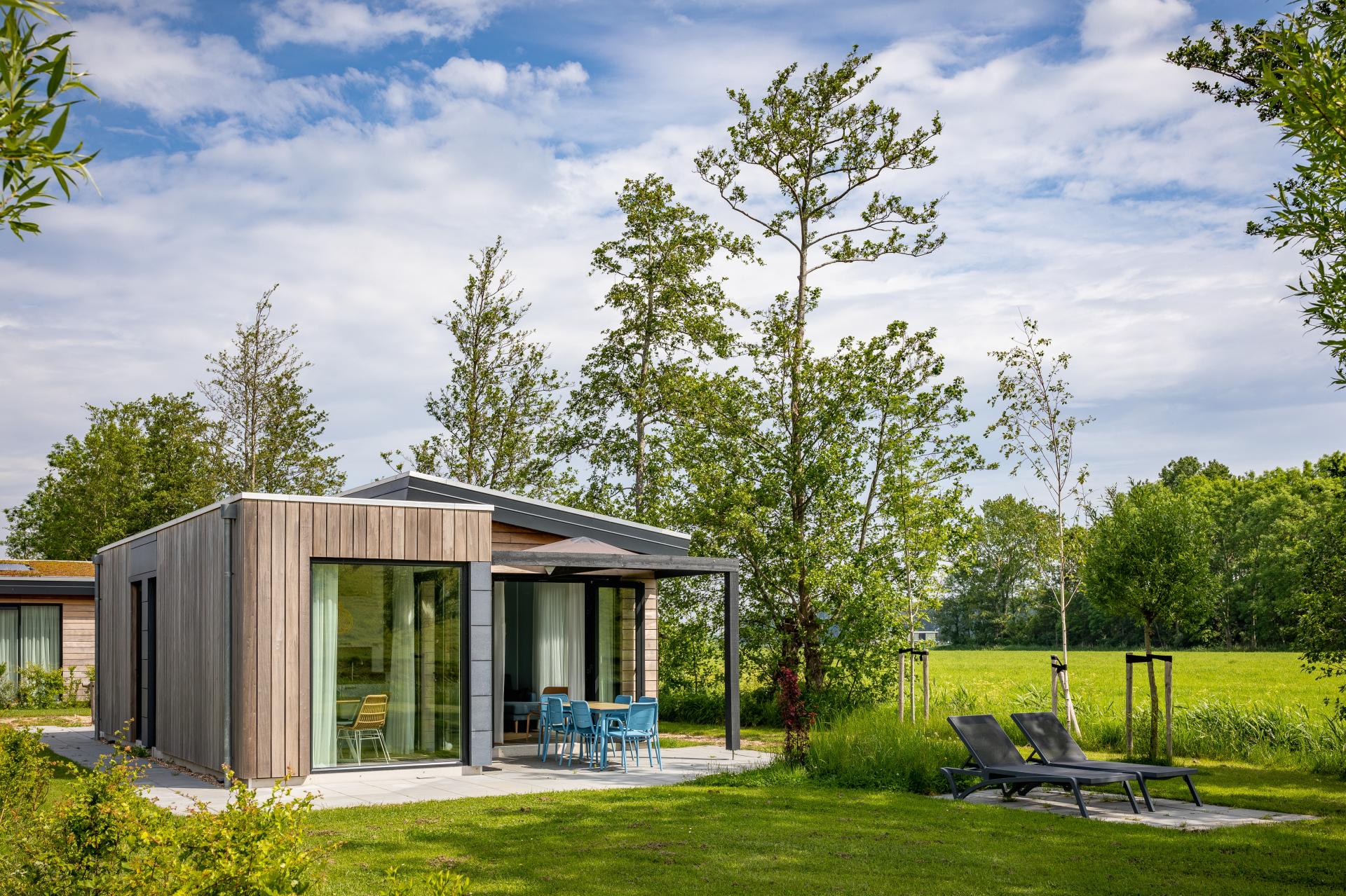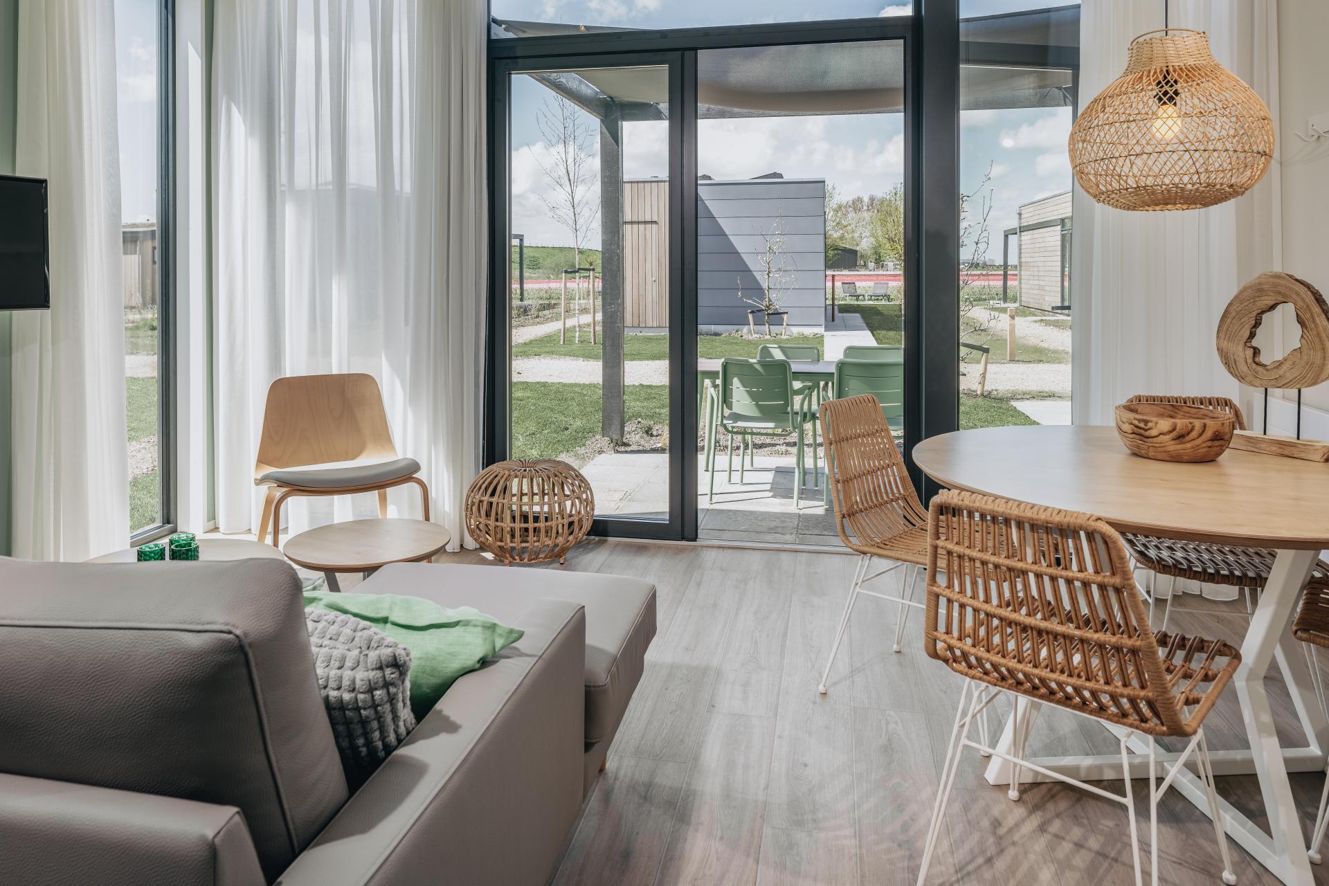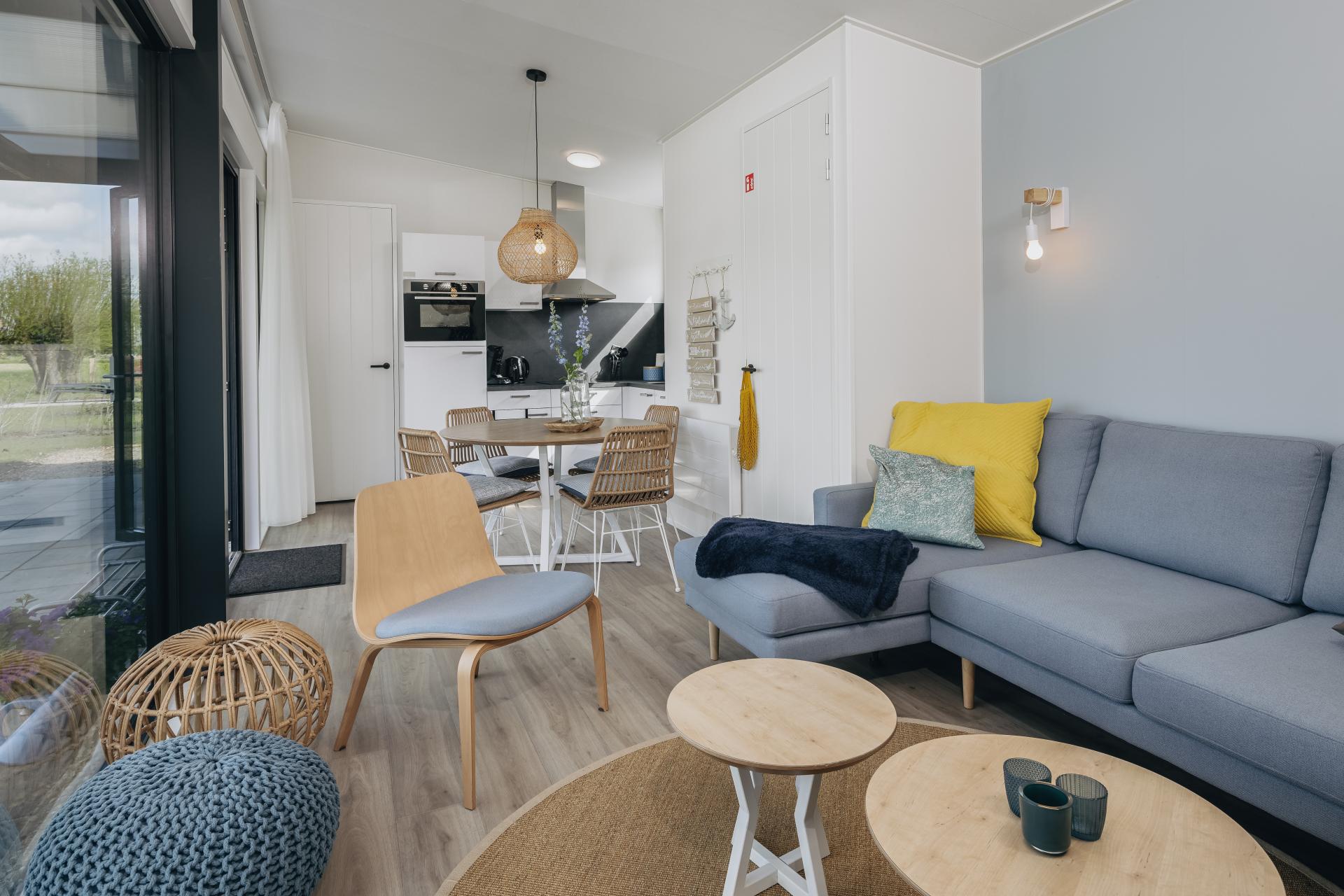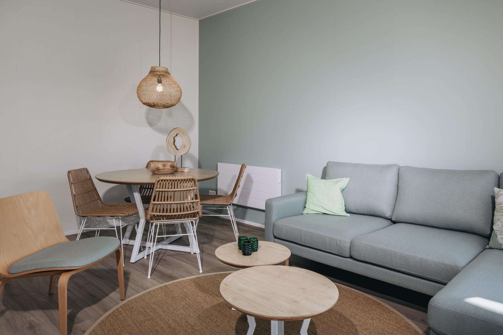 In het idyllische Noord-Hollandse landschap, waar uitgestrekte weilanden, pittoreske dorpjes en kabbelende waterwegen samenkomen, ligt het betoverende vakantiepark Roompot Wijdenes. Gelegen aan het Markermeer, biedt dit rustgevende toevluchtsoord een perfecte mix van natuur, ontspanning en plezier voor vakantiegangers van alle leeftijden. Wij mochten de 72 nieuwbouw lodges en het centrumgebouw voorzien van een fris en modern interieur. Greens and blues Van kleurrijke bloembollenvelden tot historische stolpboerderijen en van statige molens tot uitgestrekte weilanden, het dorpje Wijdenes heeft het allemaal. En dat geldt uiteraard ook voor het gelijknamige vakantiepark van Roompot. De 72 lodges die het park rijk is, bieden een fijne vakantieaccommodatie aan groepen van vier tot zes personen. Voor deze vakantiewoningen hebben we een modern en tijdloos interieurpakket samengesteld, waarbij men kon kiezen uit groen of blauw als accentkleur. De woonkamers hebben we voorzien van een comfortabele, chaise longue bank en moderne fauteuils met een Scandinavische uitstraling. |