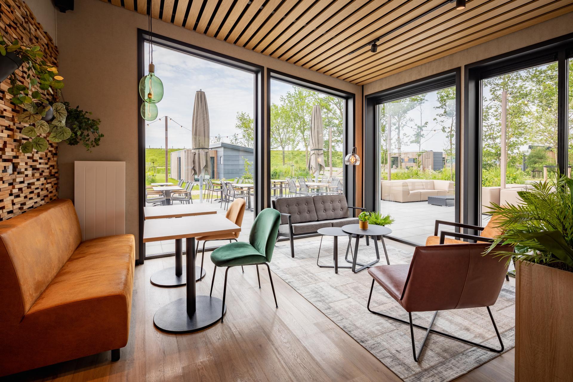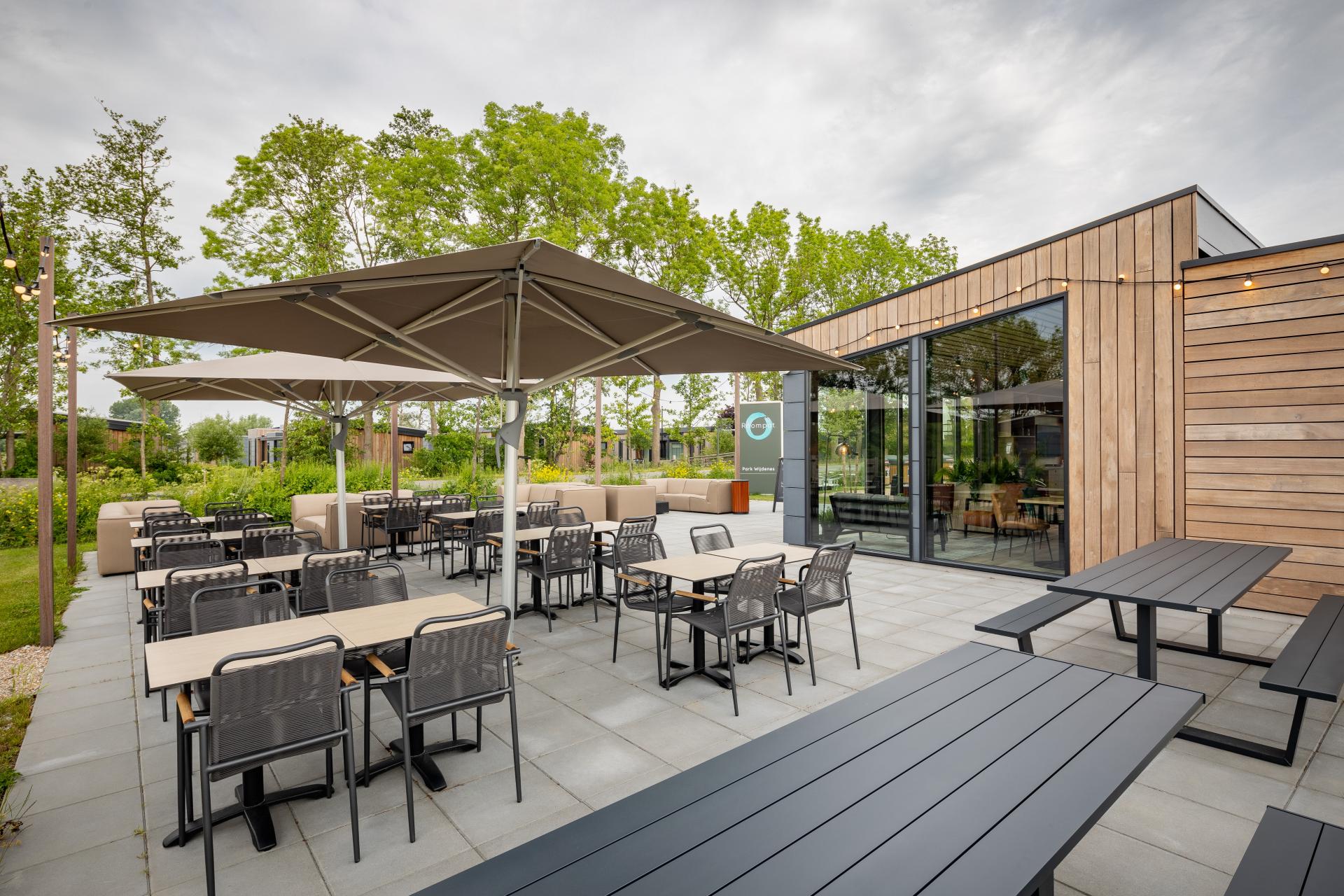 Samen met de subtiele verlichting en de comfortabele boxsprings, kunnen de gasten genieten van een heerlijke nachtrust. Op het terras van de lodges zie je de kleuraccenten duidelijk naar voren komen. Hier zijn de Jason A stoelen en de Valencia tafels geplaatst en vallen meteen op door hun blauwe- of groene kleur. In het centrumgebouw van Park Wijdenes hebben we veel maatwerk mogen realiseren. Bij de mini market waar gasten zelf hun belegde broodjes, verse soepen en koffie en thee kunnen halen en afrekenen, hebben we meerdere retail etalages gemaakt. De koffie en thee corner, de cooling wall waar alle gekoelde producten staan en een retail wall en table waar de niet-gekoelde eet- en drinkwaren zijn uitgestald. |