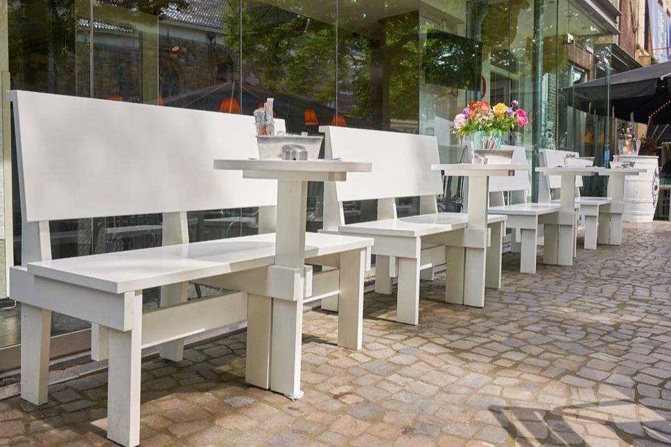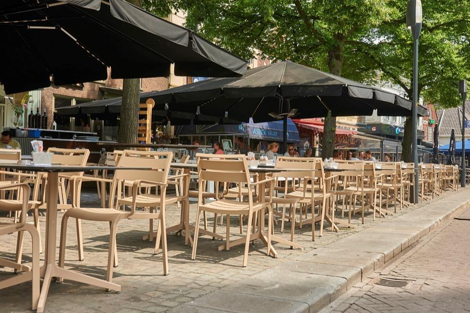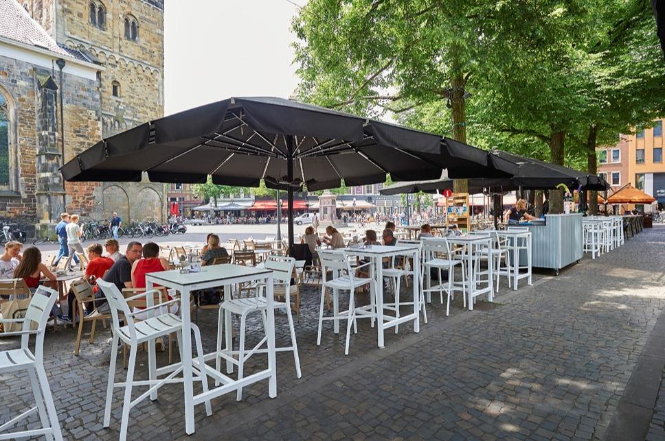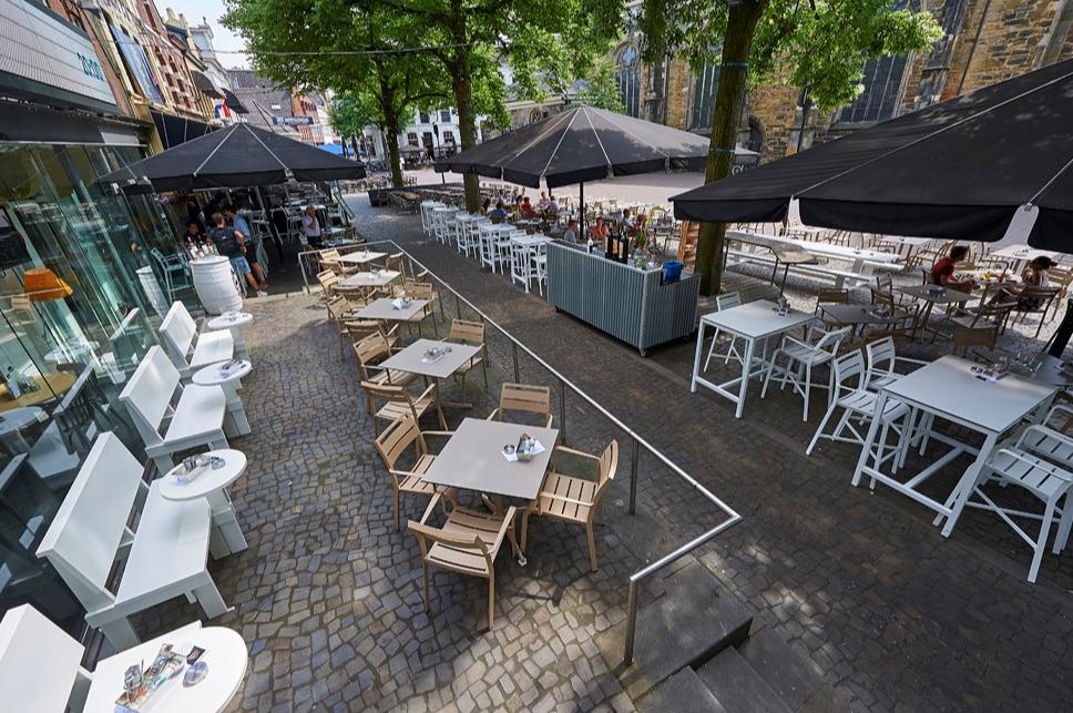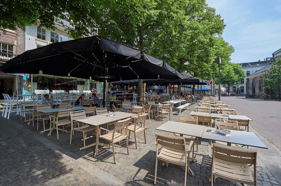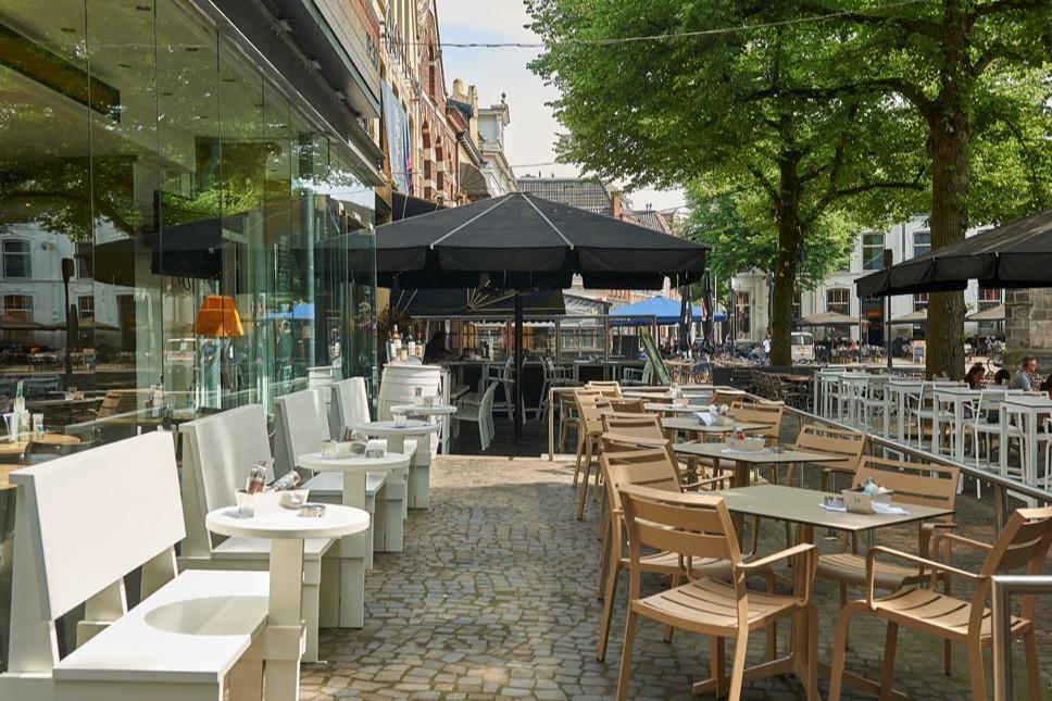 Sole op je terrasHet terras van Sam Sam strekt zich ver uit over de karakteristieke Oude Markt. De beige Sole terrasstoelen combineren perfect met de vele bruintinten van de kerk. Als frisse tegenhanger zijn de bijpassende Sole krukken met witte statafels in het midden van het terras geplaatst. Tegen het restaurant aan pronken de witte maatwerk banken, die voorzien zijn van een wit tafeltje om je drankje of borrelhapje op te plaatsen. |