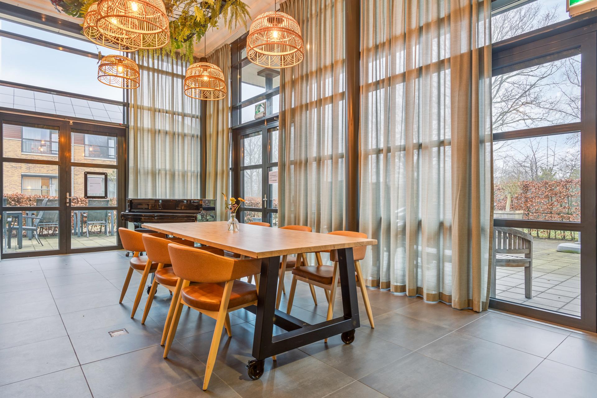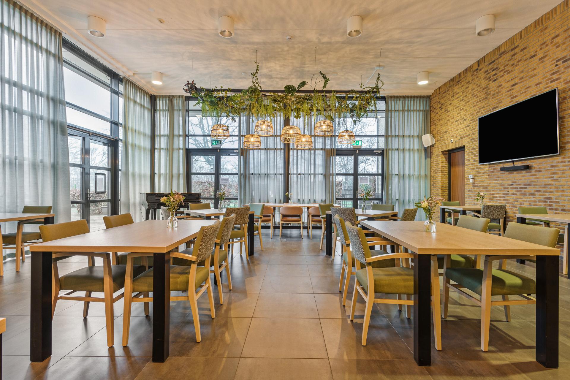 Aan de andere kant van de roomdividers zijn ronde tafels met Liberty-onderstellen geplaatst, gecombineerd met Vikki-armstoelen in een warme oranje/bruine stoffering. Door deze variatie in zitplekken is er voor iedereen een fijne plek om te eten, ontmoeten of ontspannen.