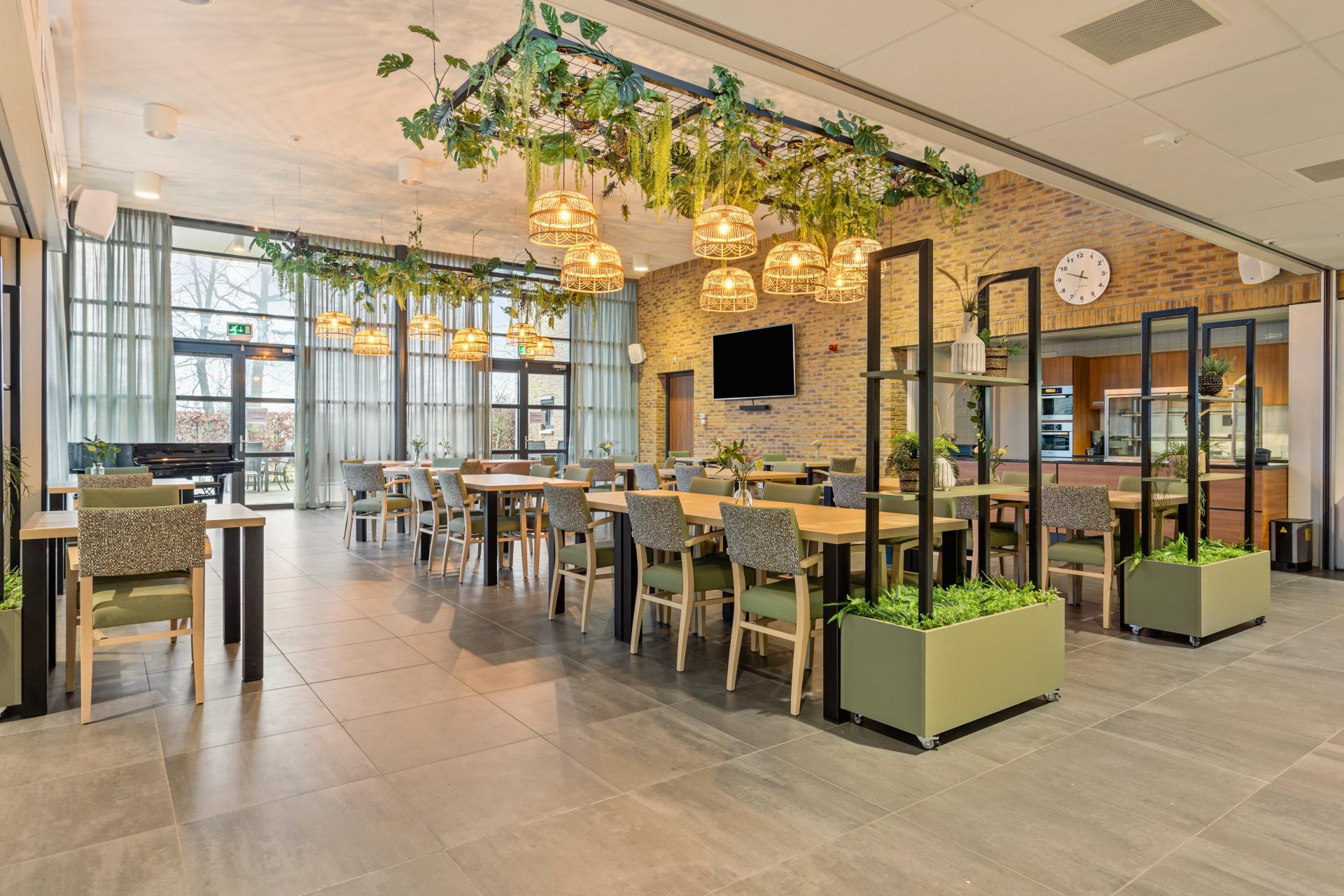 Dankzij verrijdbaar meubilair kan de indeling eenvoudig worden aangepast. De op maat gemaakte verrijdbare plantenbakken dienen niet alleen als natuurlijke roomdividers, maar bieden ook ruimte voor accessoires en groenbeleving. Daarnaast zorgen verrijdbare stamtafels ervoor dat grote groepen makkelijk samen kunnen zitten. Voor de overige zitplaatsen is gekozen voor vierkante en rechthoekige tafels met eikenhouten bladen en zwarte poten, gecombineerd met zachte, groen gestoffeerde Veda armstoel—een subtiele verwijzing naar de bosrijke omgeving van Vijverhof.