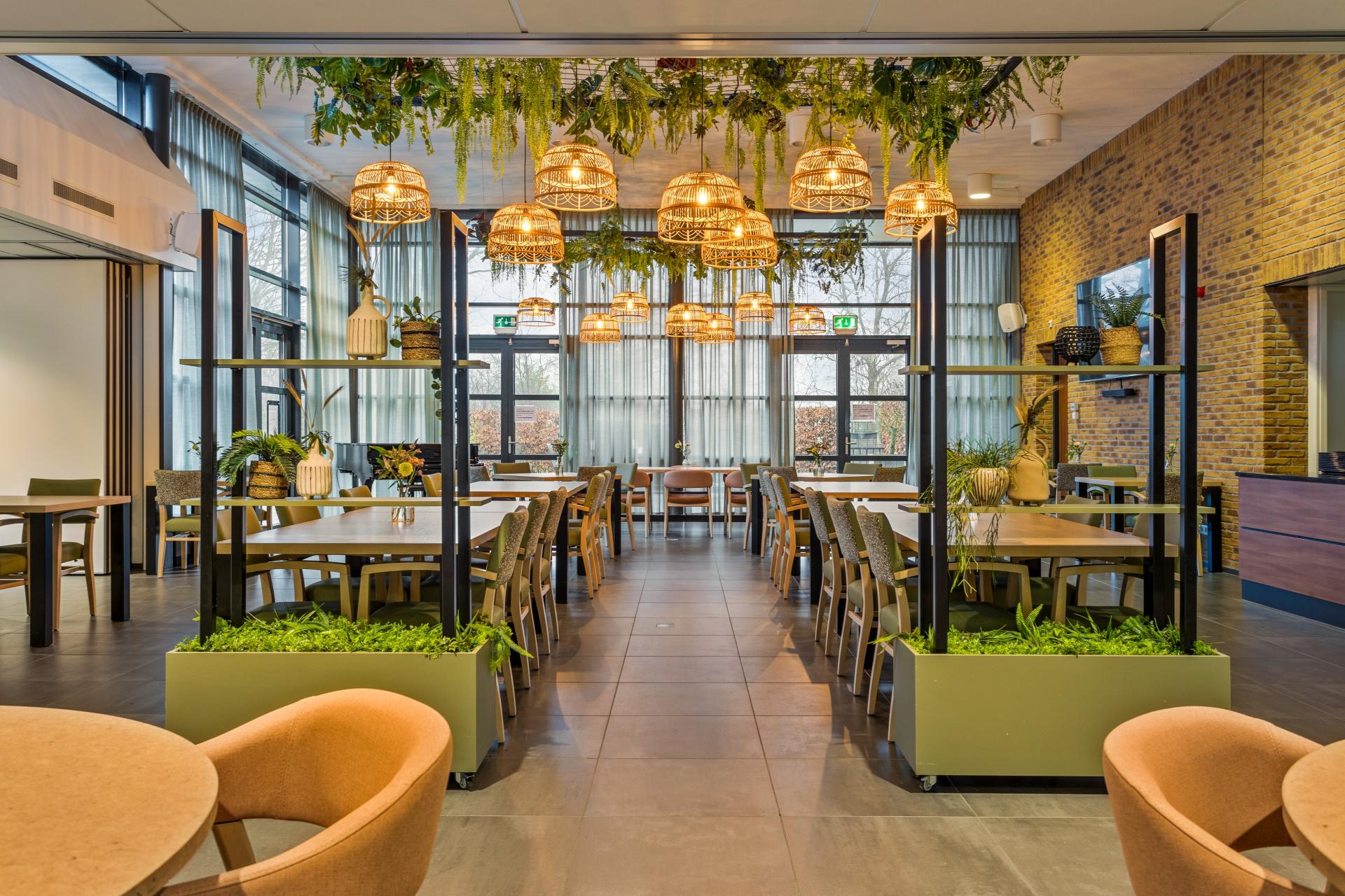 Het restaurant bevindt zich in een open, lichte ruimte met een hoog plafond—een prachtige, maar uitdagende basis voor een warme en geborgen sfeer. Om de ruimtelijkheid te benadrukken, is gekozen voor raamhoge vitrage, terwijl metalen hangframes met kunstbeplanting en rotan hanglampen de hoogte speels opvullen. Door variatie in hoogtes ontstaat een dynamisch en uitnodigend effect. Flexibiliteit was een belangrijke wens voor deze ruimte.