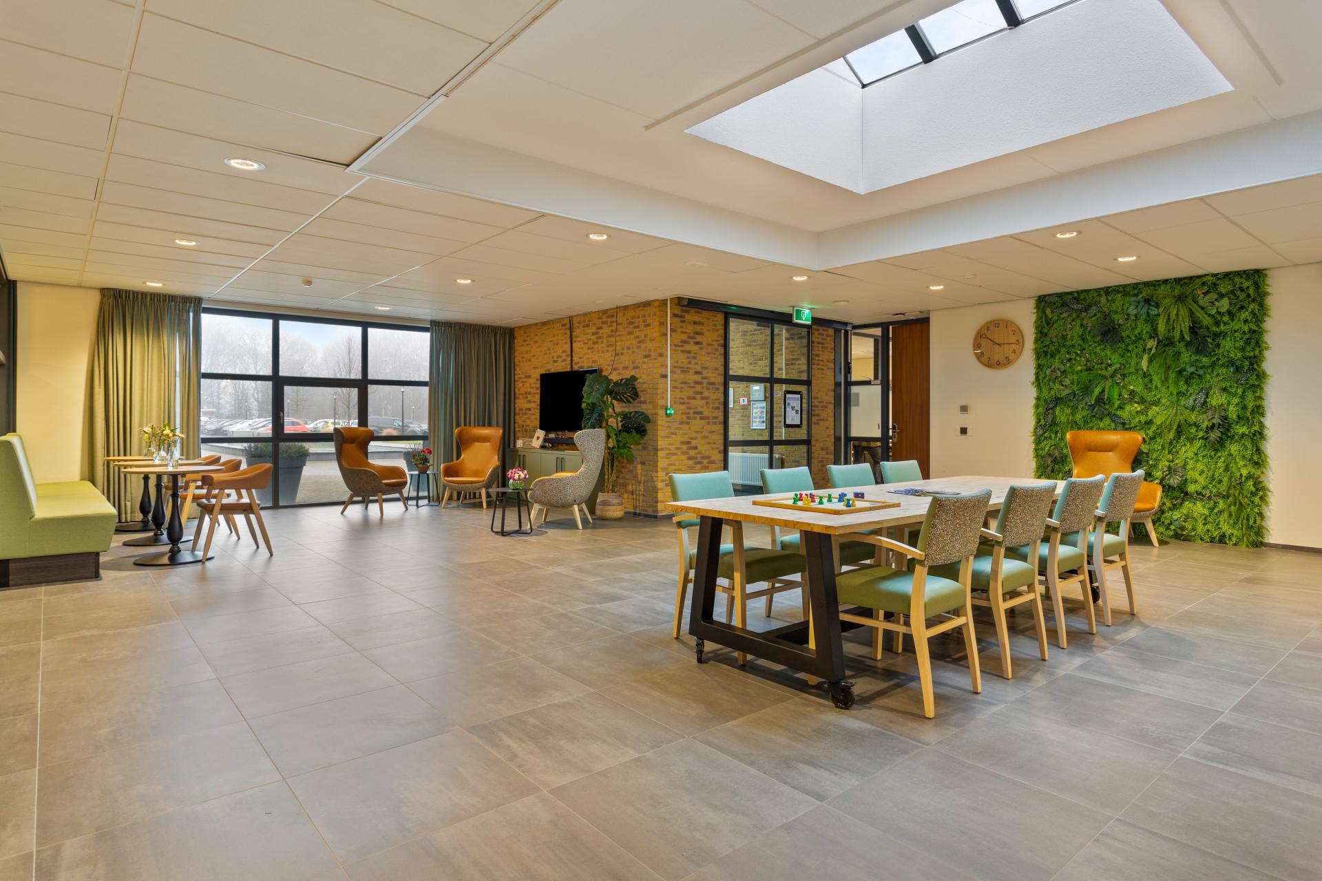 De entree van Vijverhof is meer dan alleen een ontvangsthal. Het is een plek waar bewoners even tot rust kunnen komen, een spelletje kunnen spelen of op de taxi kunnen wachten. Speciaal voor deze functie hebben we onze comfortabele Bryson-fauteuils geplaatst in een warme, cognackleurige stoffering. Dankzij de hoge rugleuning en hoofdsteunen bieden ze optimale ondersteuning. Om voldoende opbergruimte te creëren, zijn er Mento-maatwerkkasten toegevoegd, ideaal voor het opbergen van materialen voor activiteiten zoals bordspellen. Daarnaast hebben we, met oog op duurzaamheid, de bestaande wandbank een tweede leven gegeven door deze te herstofferen. Dit zorgt ervoor dat het bestaande meubilair perfect aansluit op het vernieuwde interieur, zonder onnodige verspilling.