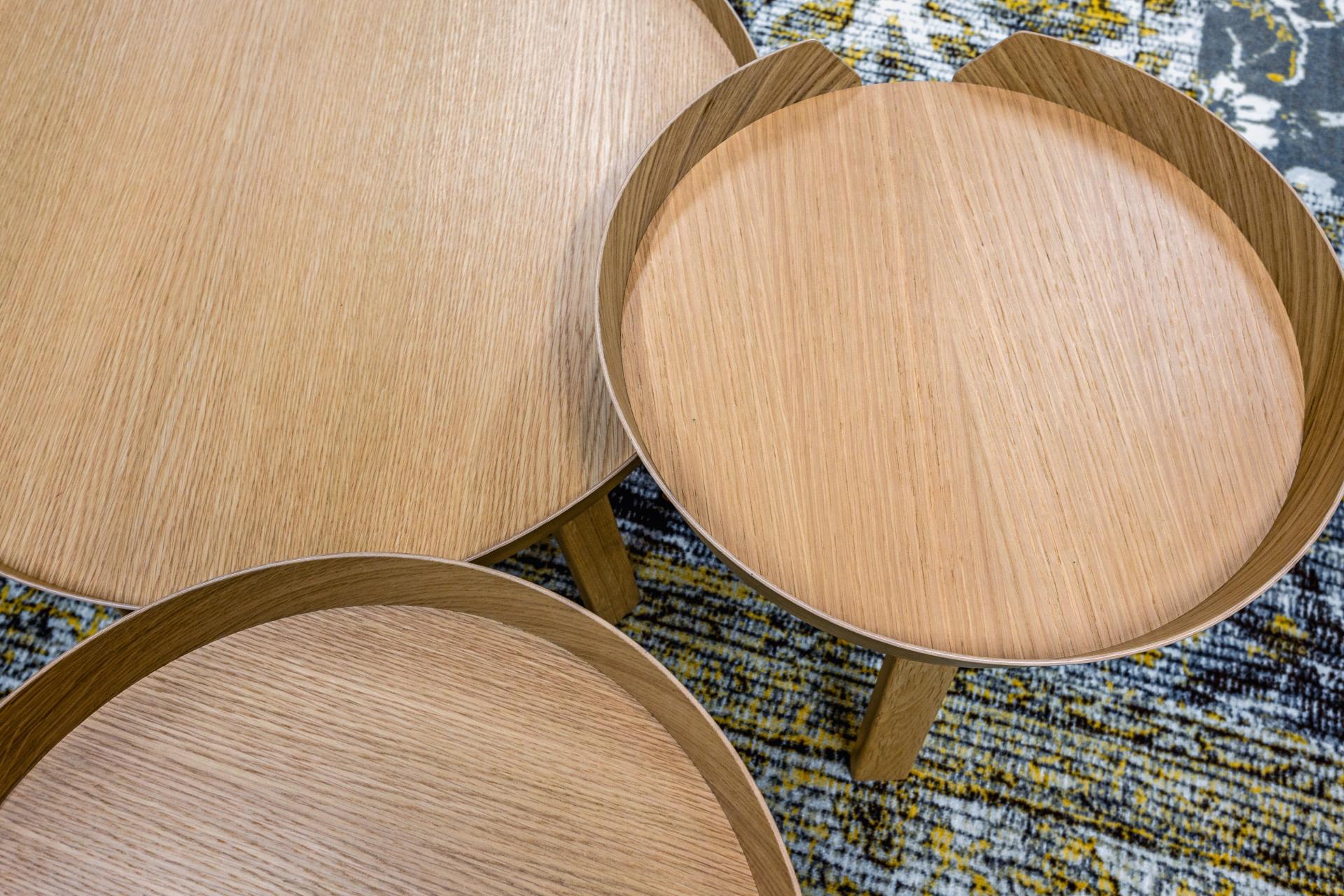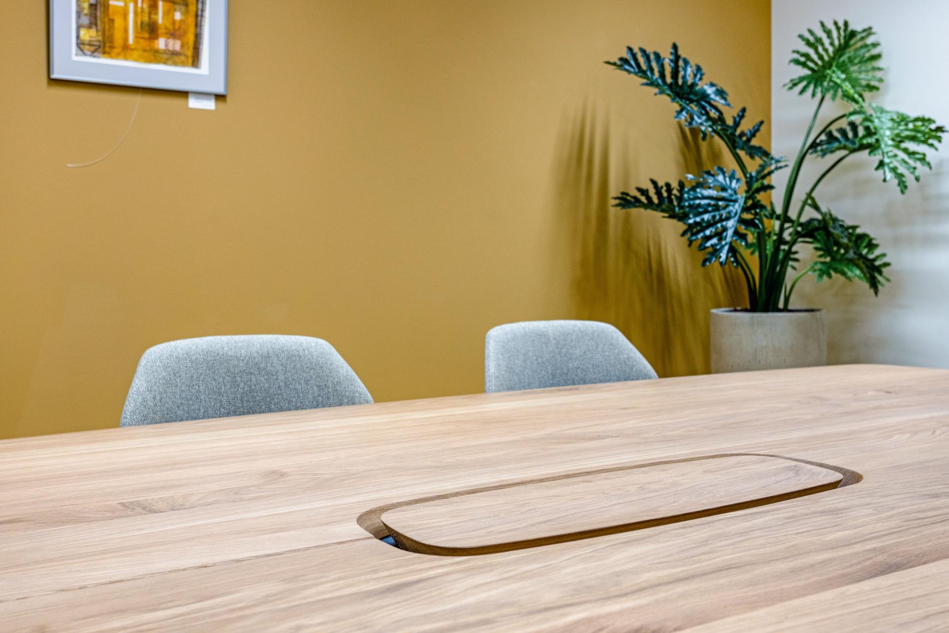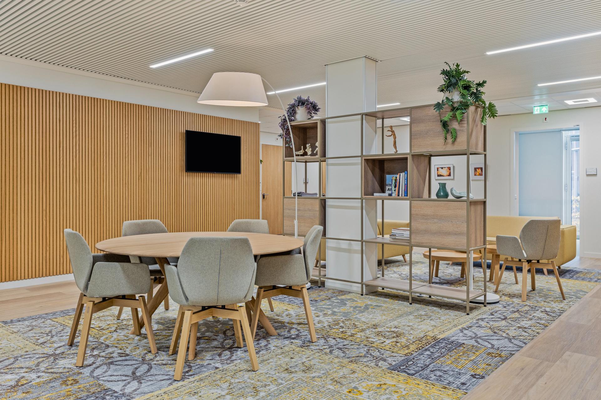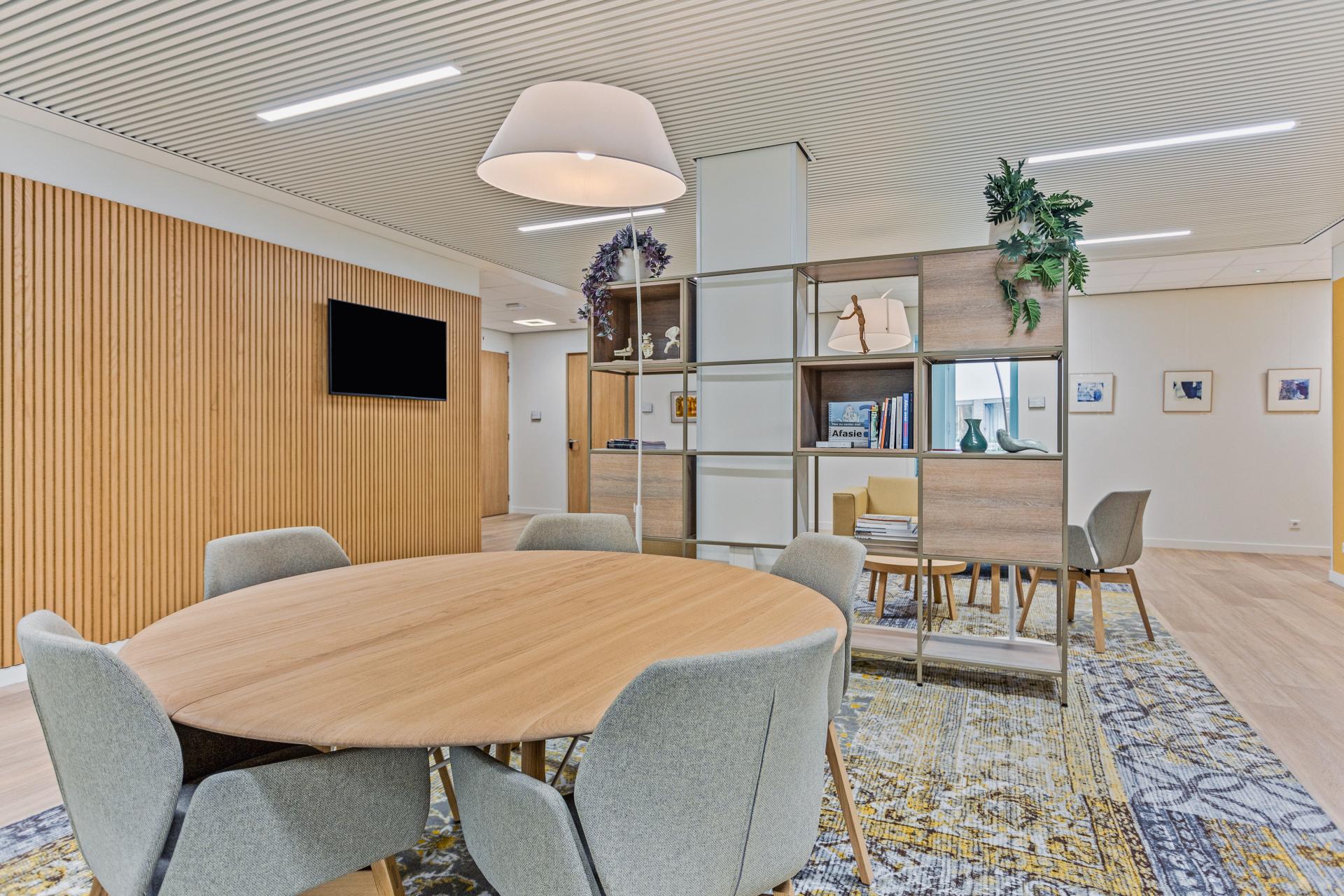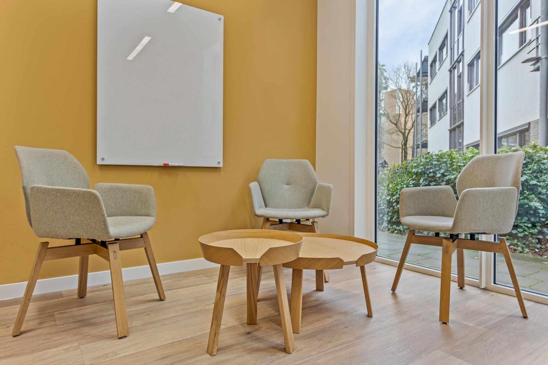 Aan de andere kant is gekozen voor een actievere zitgelegenheid, met Mood-armstoelen in grijze stoffering en licht eiken poten, gecombineerd met een ronde tafel in dezelfde lichte eiken afwerking.