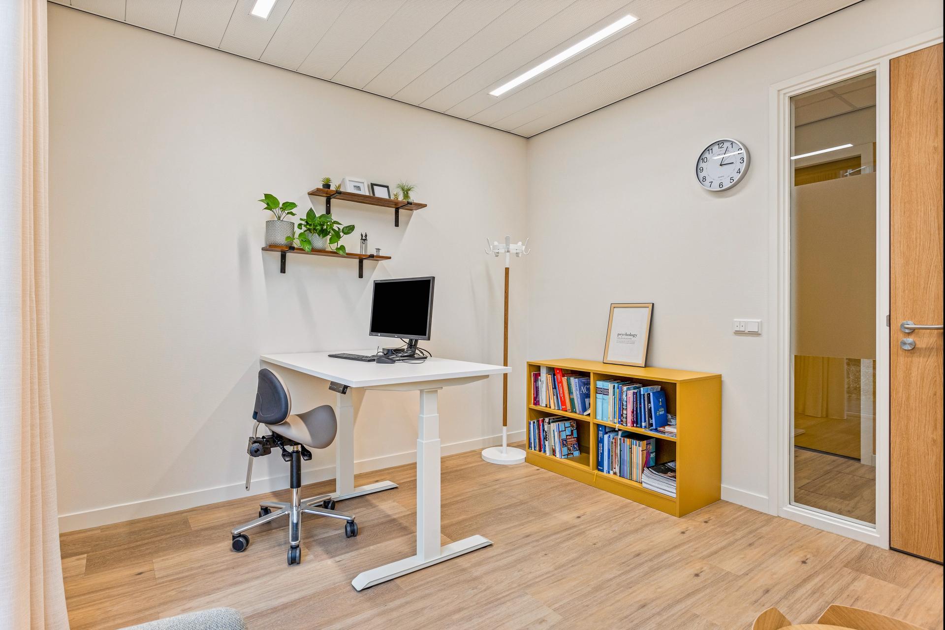 De spreek- en behandelkamers zijn ingericht met een focus op rust en functionaliteit. In hoogte verstelbare bureaus worden gecombineerd met ergonomische Twizzy-krukken, waardoor medewerkers flexibel kunnen werken – zowel staand als zittend. Voor opbergruimte is een okergele open boekenkast geplaatst, die een speels, maar praktisch accent toevoegt. Daarnaast is er ruimte voor informele gesprekken gecreëerd, met Mood-armstoelen en Around-bijzettafels. Er is voldoende loopruimte voorzien, zodat cliënten met een rolstoel of rollator zich gemakkelijk kunnen bewegen.