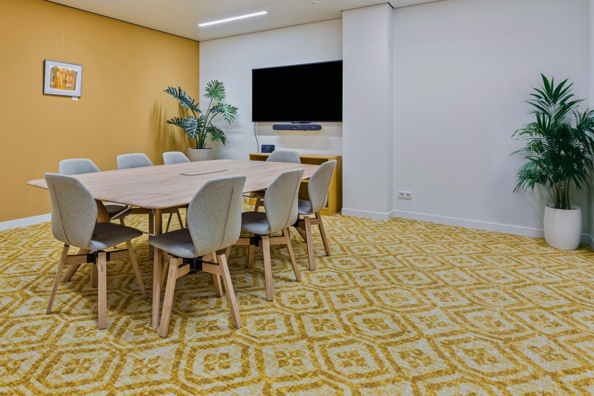 Een op maat gelegd vloerkleed verbindt het geheel visueel en voegt warmte toe. Omdat het vloerkleed geïntegreerd is in de vloer, is er geen risico dat men struikelt over de randen – een essentiële veiligheidsmaatregel voor deze doelgroep.