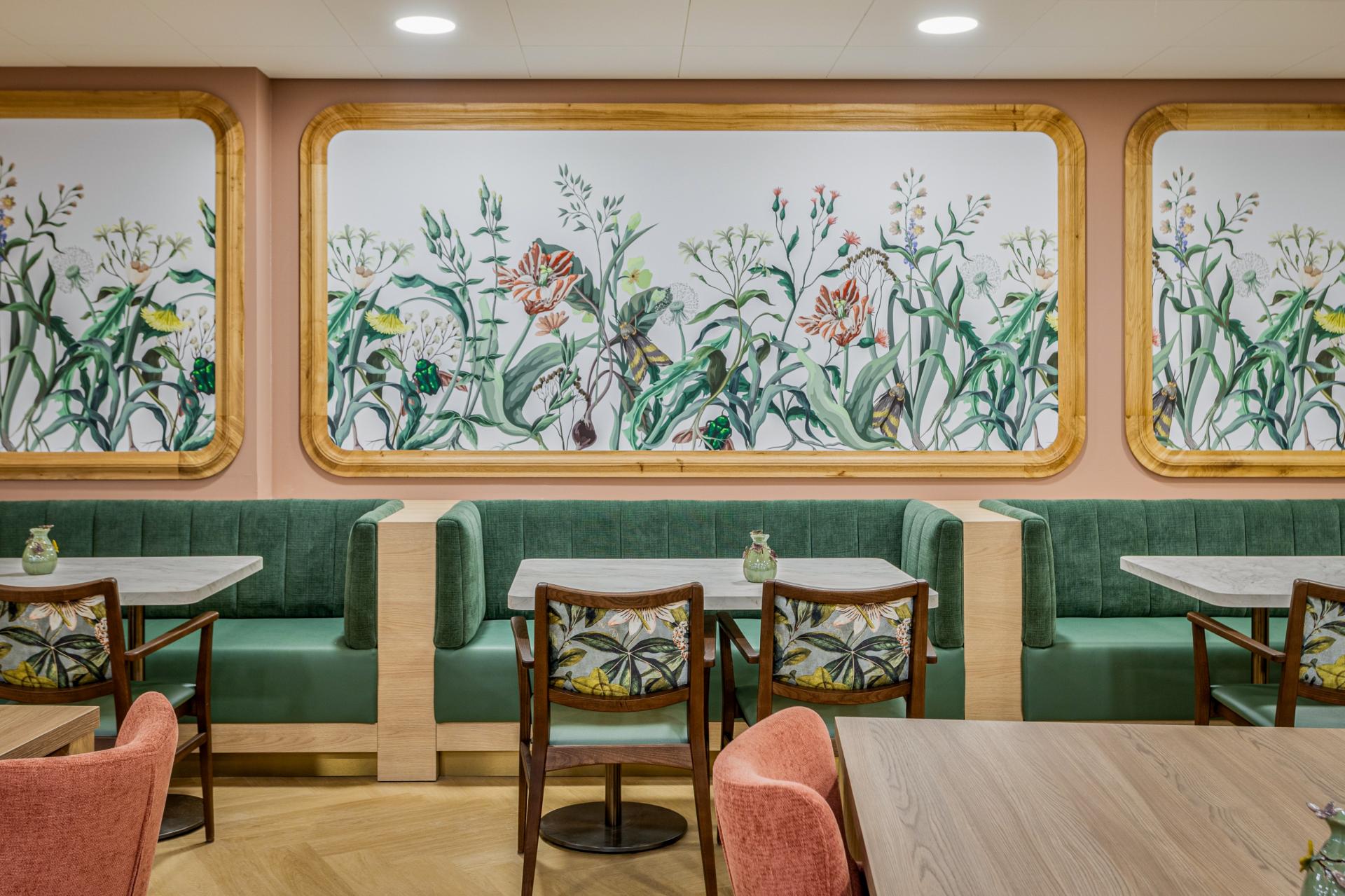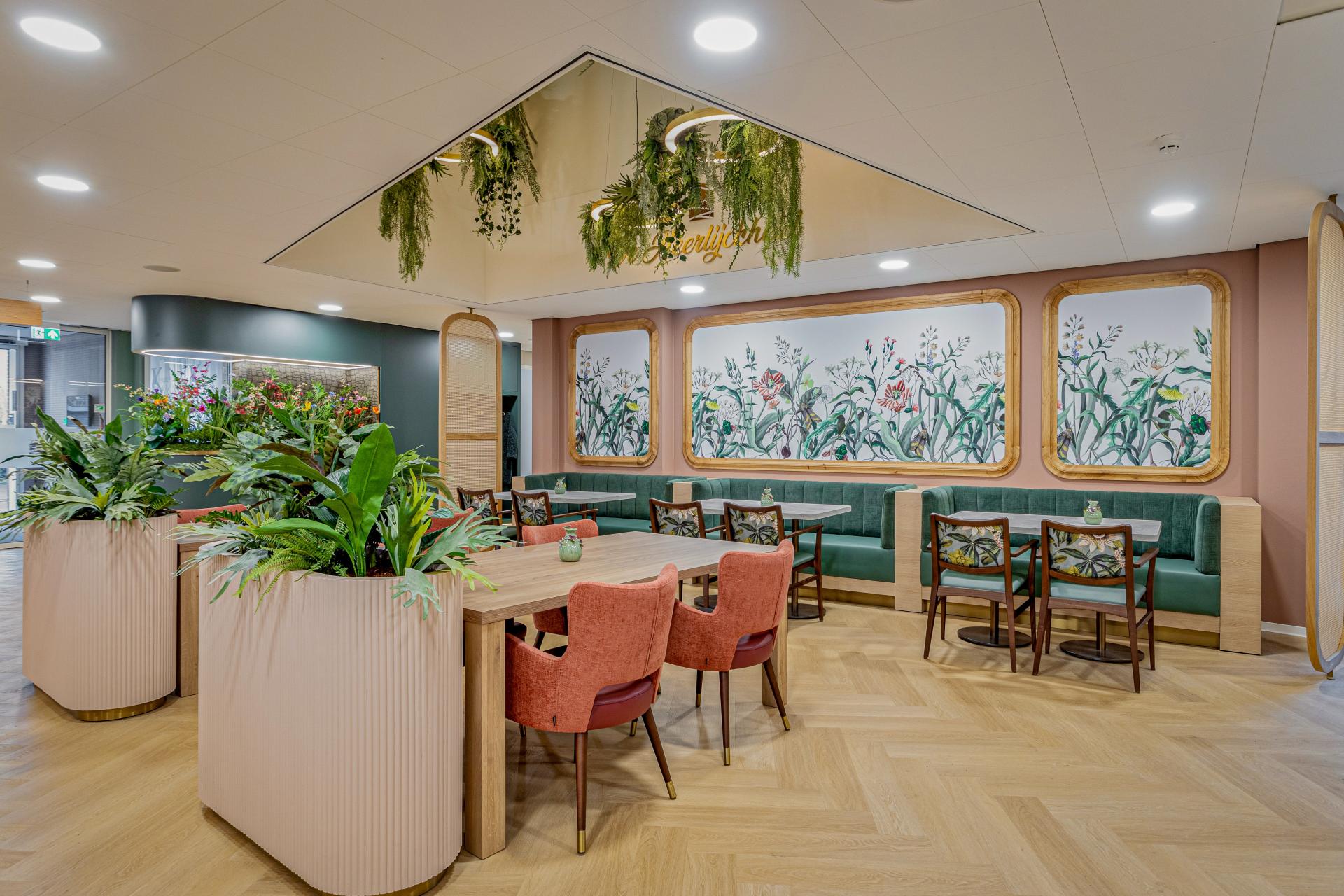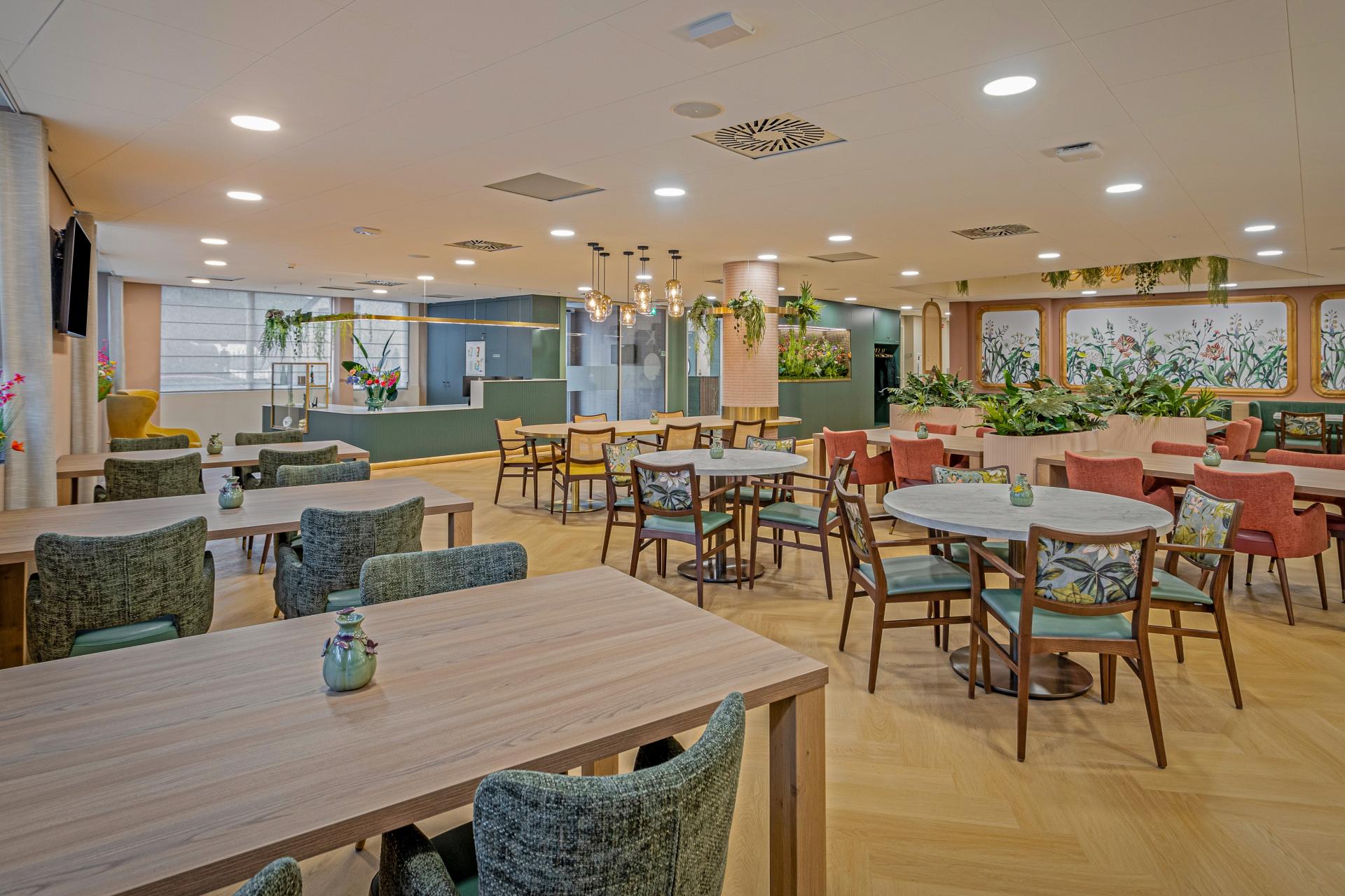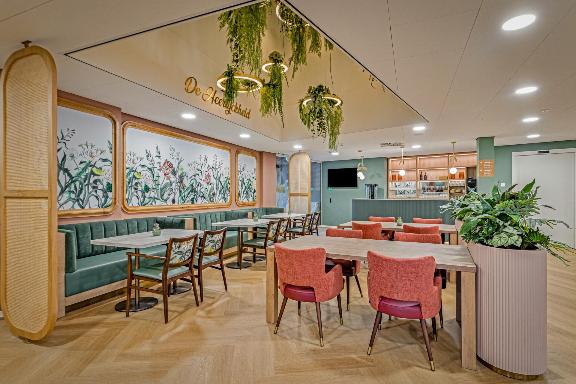 In maart 2022 is de bouw gestart van de nieuwe vestiging van TanteLouise in Hoogerwaard. Dit eigentijdse verpleeghuis, gelegen in het levendige dorpscentrum van Hoogerheide, omvat in totaal 141 bewonerskamers. Ons team heeft zich volledig ingezet om niet alleen deze bewonerskamers, maar ook het centrale restaurant en de 17 gemeenschappelijke woonkamers te voorzien van een warme en eigentijdse atmosfeer. Met zorgvuldige keuzes in materialen, kleuren, gordijnen, verlichting en natuurlijk meubilair hebben we dit doel met succes bereikt! Brasserie ‘De Heerlijckheid’ Het kloppende hart van dit indrukwekkende gebouw is de brasserie, waar tevens de entree en receptie zich bevinden. De brasserie heeft als doel om alle 'heerlijkheden' samen te brengen: warmte, gezelligheid, eten en drinken, dit alles in een toegankelijke en huiselijke setting. Onze interieur designer Pebbles van Campen heeft daarom gekozen voor materialen en kleuren die rust uitstralen, maar toch eigentijds zijn. De subtiele roze-, rood- en groentinten combineren perfect met de lichte eiken vloer. Het meubilair in de brasserie vertoont iets intensere kleuren. De Kelly Flow Hole Maple stoelen met messing pootjes zijn gestoffeerd in lichte- en donkerrode tinten en een groene, gemêleerde kleur. Deze worden gecombineerd met rechthoekige, eiken Oregon eettafels. Langs de muur zijn op maat gemaakte, groen gestoffeerde banken geplaatst, met daarboven botanische visuals als wanddecoratie in een houten omlijsting, die perfect samengaan met de groene velours bekleding. |
