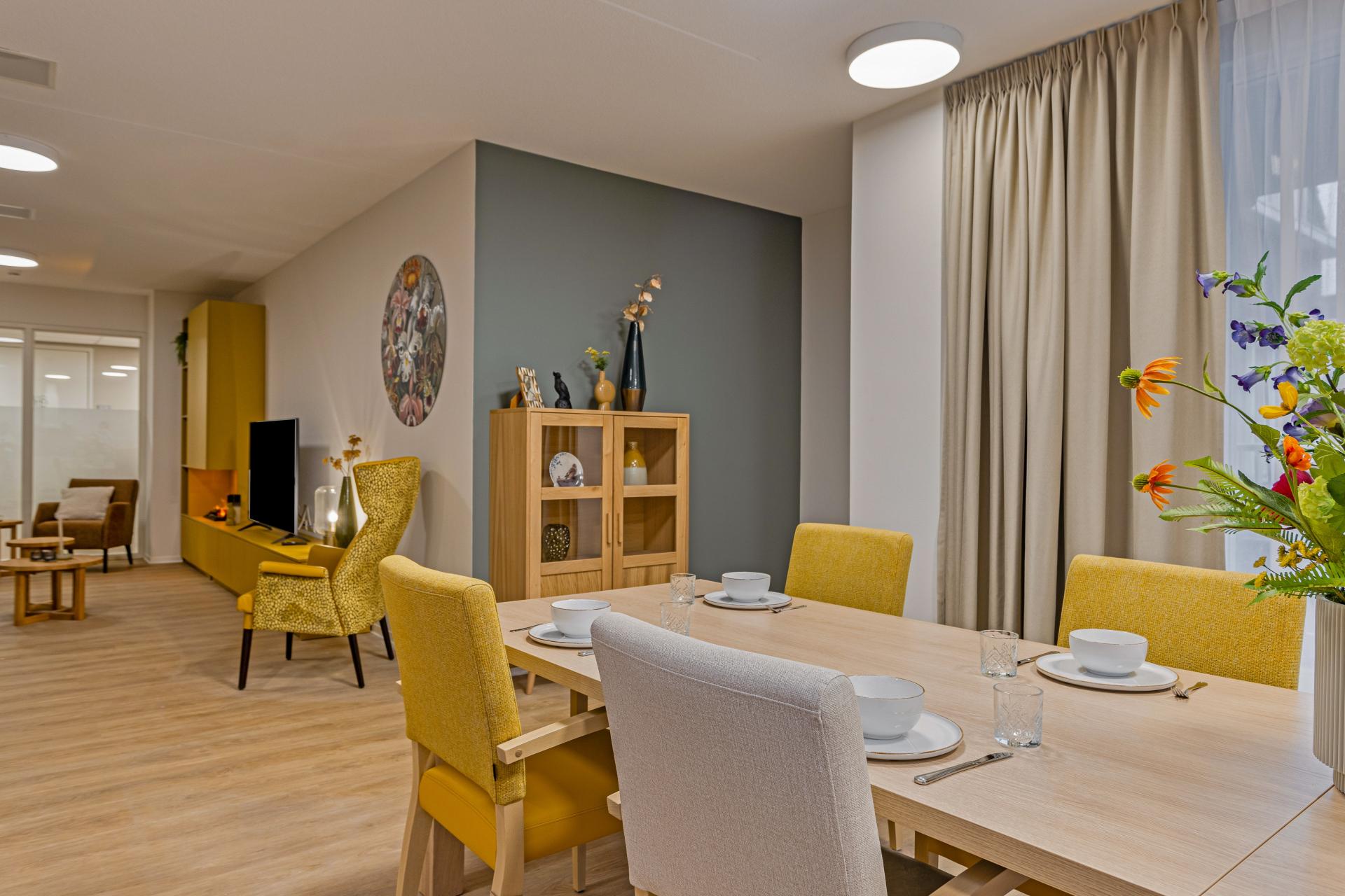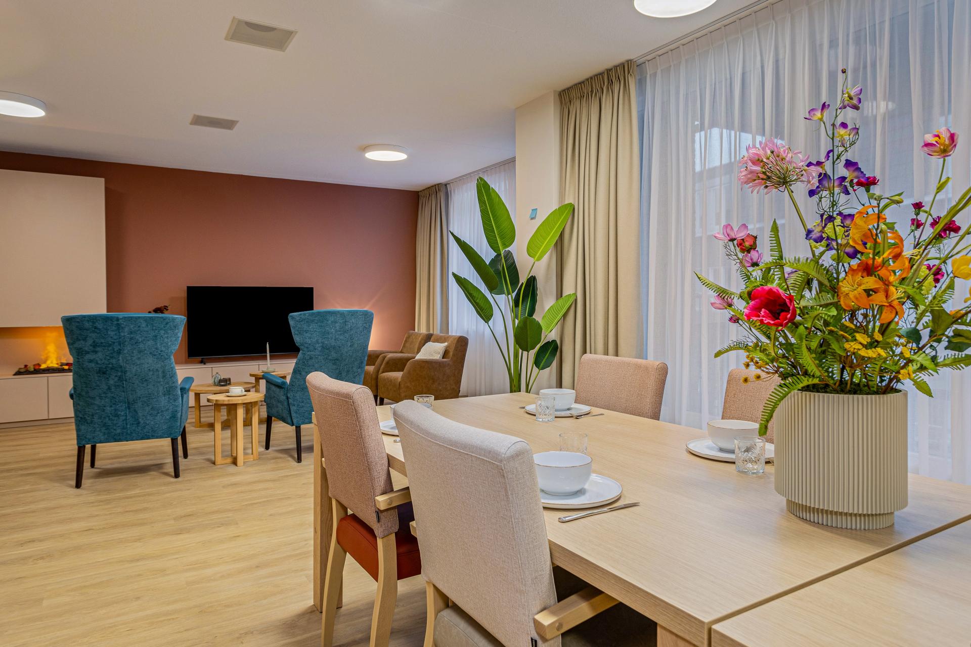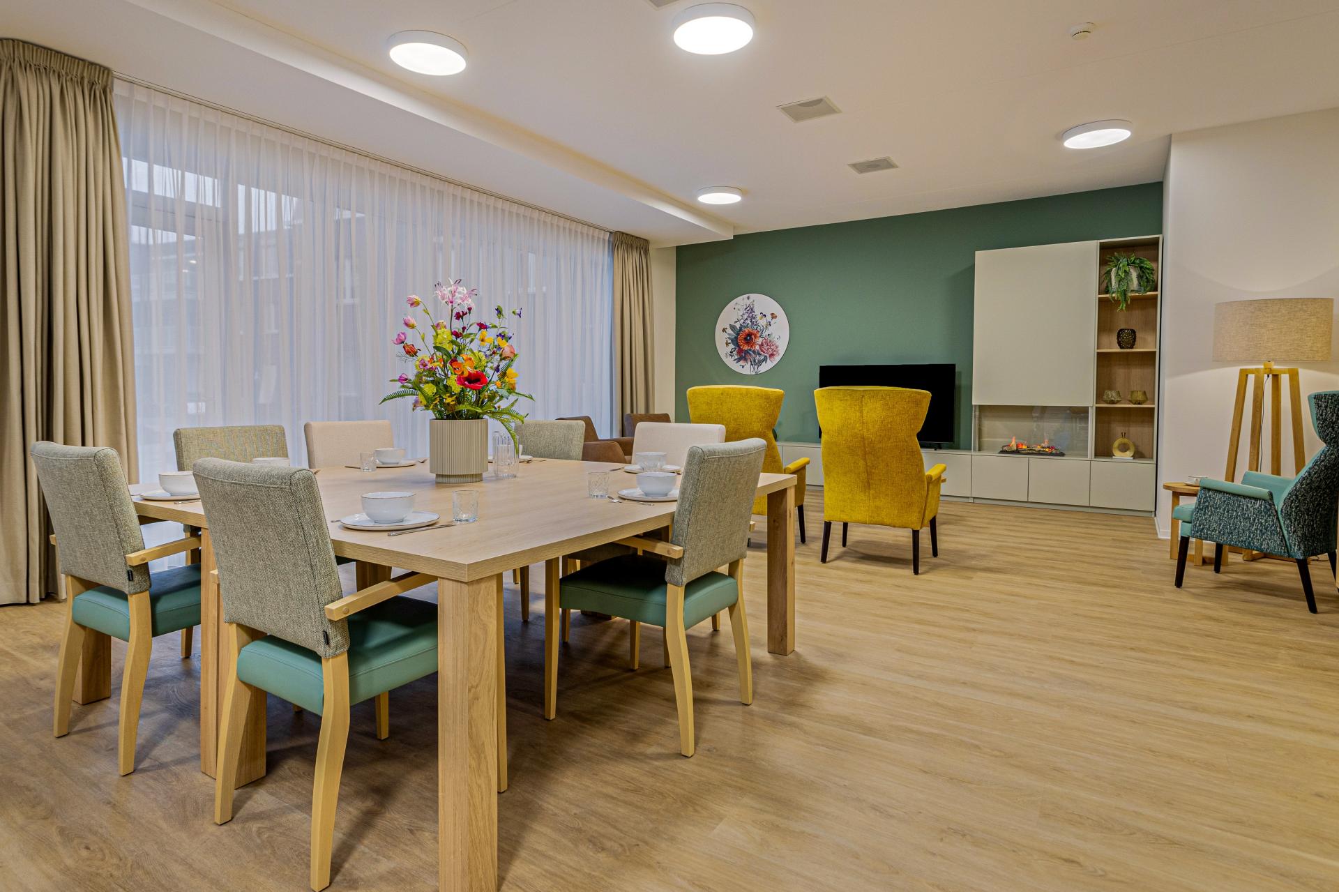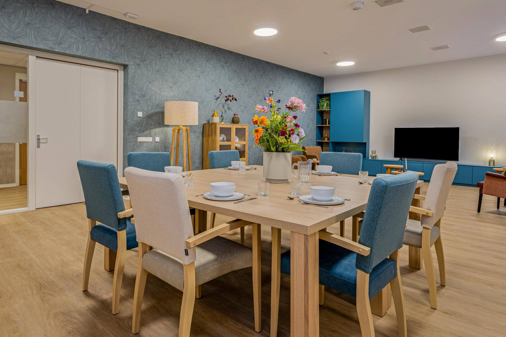 In maart 2022 is de bouw gestart van de nieuwe vestiging van TanteLouise in Hoogerwaard. Dit eigentijdse verpleeghuis, gelegen in het levendige dorpscentrum van Hoogerheide, omvat in totaal 141 bewonerskamers. Ons team heeft zich volledig ingezet om niet alleen deze bewonerskamers, maar ook het centrale restaurant en de 17 gemeenschappelijke woonkamers te voorzien van een warme en eigentijdse atmosfeer. Met zorgvuldige keuzes in materialen, kleuren, gordijnen, verlichting en natuurlijk meubilair hebben we dit doel met succes bereikt! Brasserie ‘De Heerlijckheid’ Het kloppende hart van dit indrukwekkende gebouw is de brasserie, waar tevens de entree en receptie zich bevinden. De brasserie heeft als doel om alle 'heerlijkheden' samen te brengen: warmte, gezelligheid, eten en drinken, dit alles in een toegankelijke en huiselijke setting. Onze interieur designer Pebbles van Campen heeft daarom gekozen voor materialen en kleuren die rust uitstralen, maar toch eigentijds zijn. De subtiele roze-, rood- en groentinten combineren perfect met de lichte eiken vloer. Het meubilair in de brasserie vertoont iets intensere kleuren. De Kelly Flow Hole Maple stoelen met messing pootjes zijn gestoffeerd in lichte- en donkerrode tinten en een groene, gemêleerde kleur. Deze worden gecombineerd met rechthoekige, eiken Oregon eettafels. Langs de muur zijn op maat gemaakte, groen gestoffeerde banken geplaatst, met daarboven botanische visuals als wanddecoratie in een houten omlijsting, die perfect samengaan met de groene velours bekleding. |