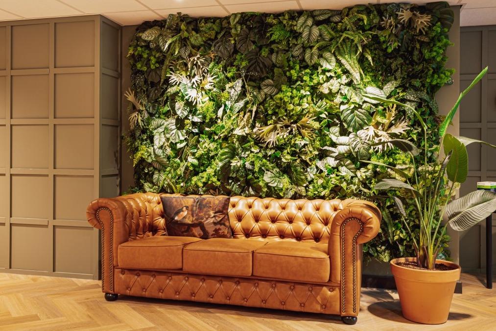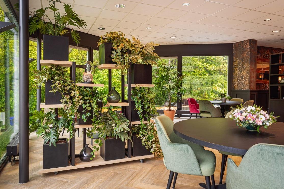 Middenin de ruimte zijn de Risto wandbanken geplaatst met daarboven hangplanten. Dit geheel zorgt voor een natuurlijke scheiding in de grote ruimte. Waar je aan de ene kant de warme sfeer van een hotel voelt, ervaar je aan de andere kant veel meer het buiten gevoel door de grote raampartijen. De wandbanken zijn gecombineerd met de Vince armstoelen met een massief beuken frame en beige, gestoffeerde rugleuning en zitting. |