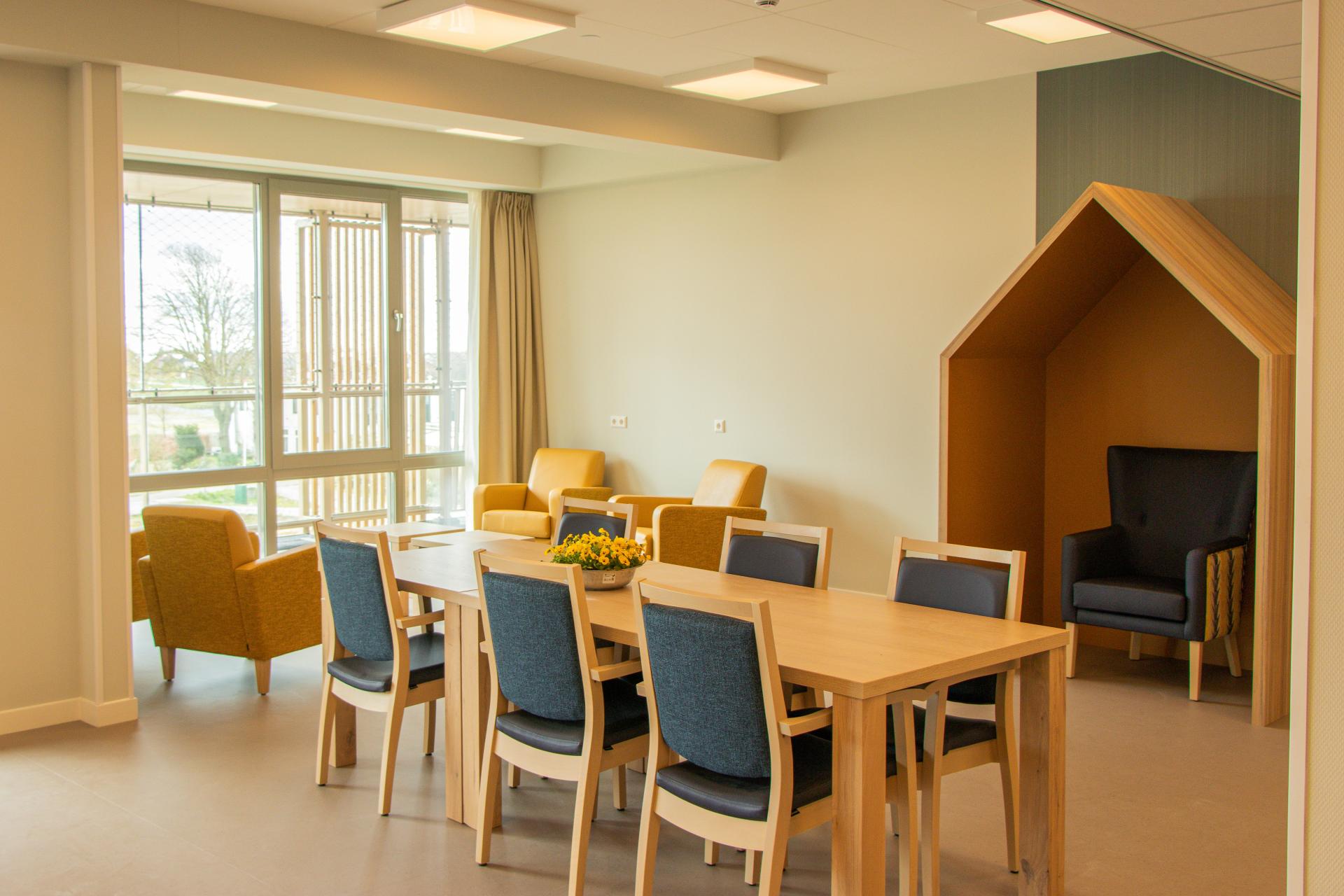 Daarom is op de begane grond gekozen om groen als accentkleur door te voeren. Vervolgens zie je de gele gloed van de zon tegen de bomen en bladeren schijnen, vandaar dat geel op de eerste etage de boventoon voert. En bovenaan zie je de toppen van de bomen tegen een heldere blauwe lucht afsteken, niet zo raar dat de kleur blauw als basis is gebruikt voor de tweede etage. Inrichting In de woonkamers is met minimale middelen een fijne omgeving gecreëerd voor de cliënten en medewerkers. Zo heeft iedere woonkamer een klein, maatwerk huisje, waar de Nazari fauteuil geplaatst is, zodat cliënten zich even terug kunnen trekken en het geborgen gevoel versterkt wordt. Verder is de Mike bank gecombineerd met de Classy en Leie fauteuil zodat de cliënten daar bijvoorbeeld tv kunnen kijken. Daarnaast is er in iedere woonkamer een of meerdere zware eettafels geplaatst met daarbij de Finn H96 met slede poot of de Kalifa armstoelen. Op de begane grond is in de woonkamer nog een extra nis gecreëerd waar een maatwerk bank en de Floyd armstoelen zijn geplaatst, zodat de cliënten zich even kunnen terug trekken. Waar het mogelijk was heeft Fiori gezorgd voor extra sfeer door middel van smaakvolle groenbeleving. Dit bijzondere project laat zien dat sommige interieurconcepten niet altijd gebaat zijn bij uitgesproken kleuren en materialen, maar dat eenvoud en minimalisme de voorkeur hebben.