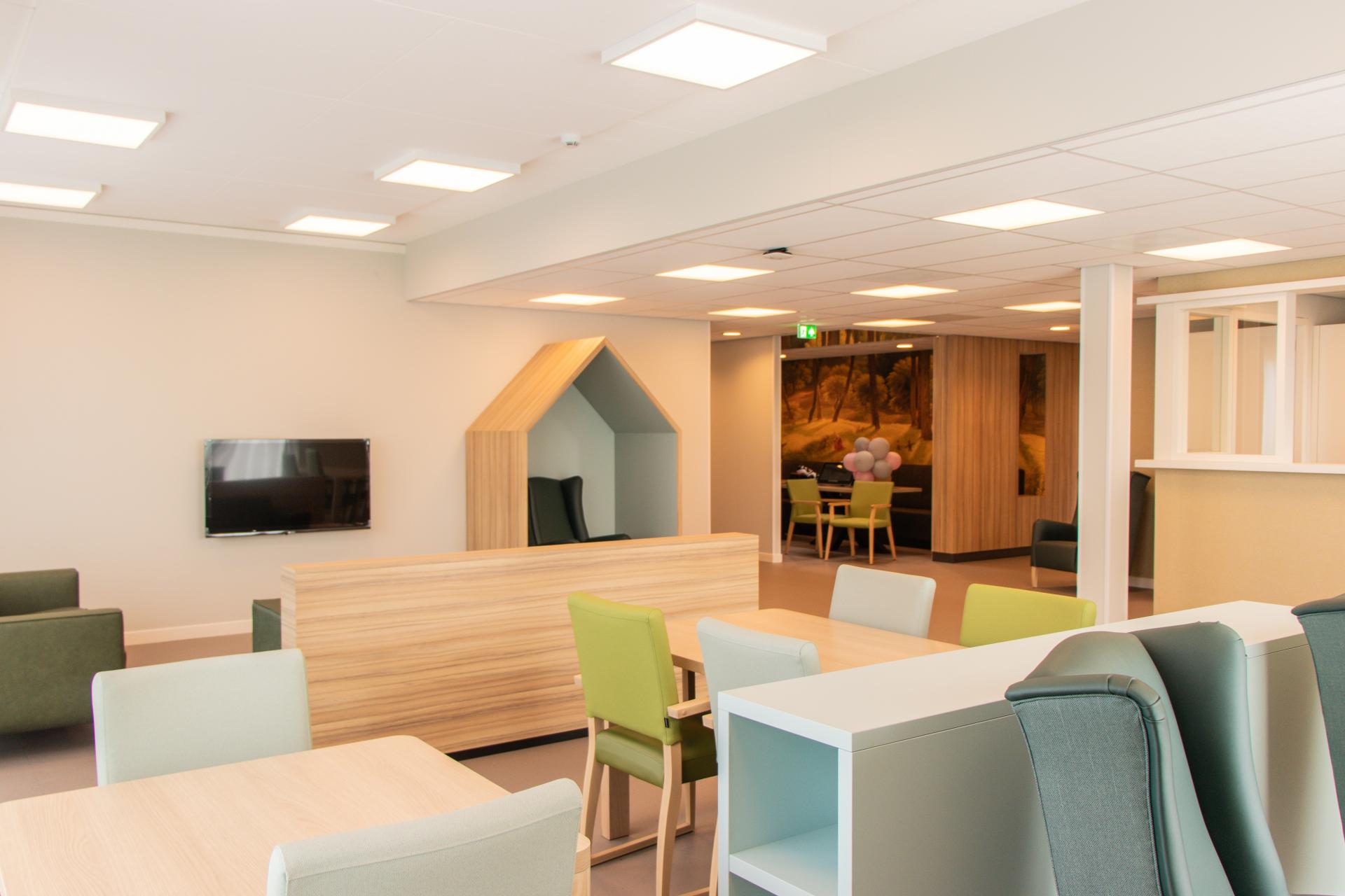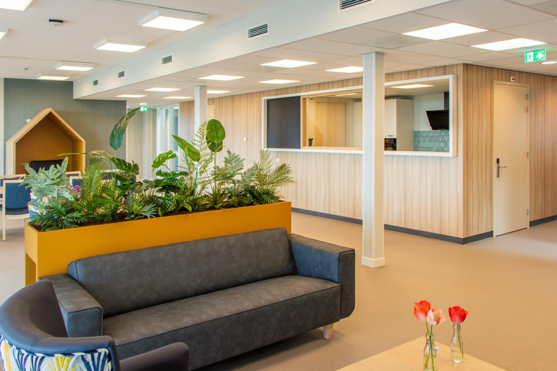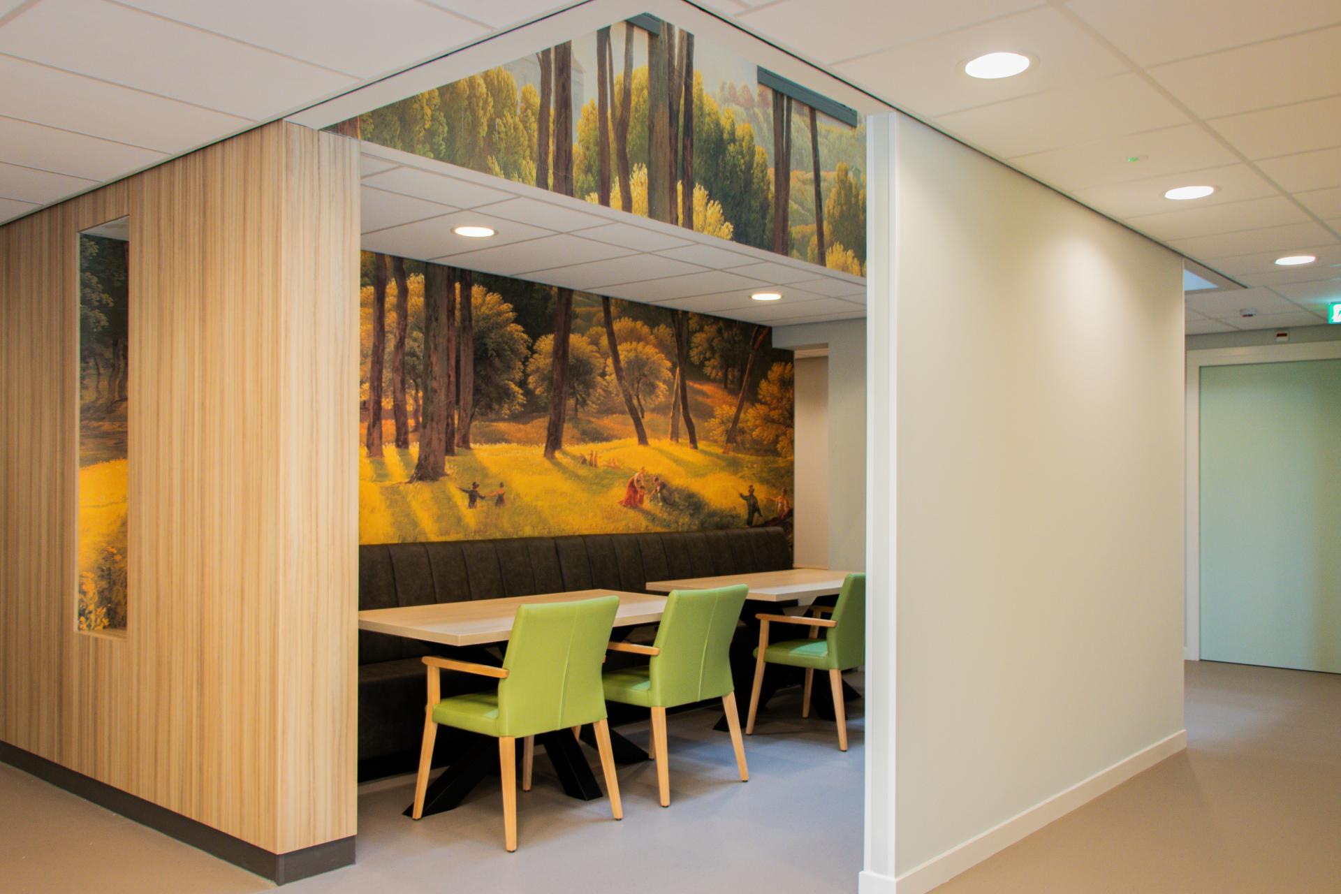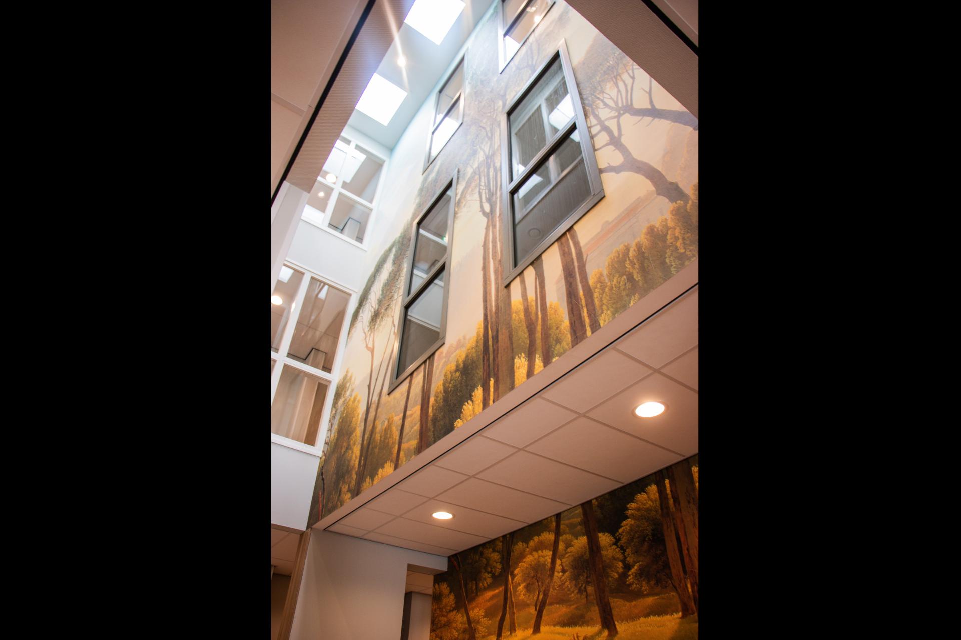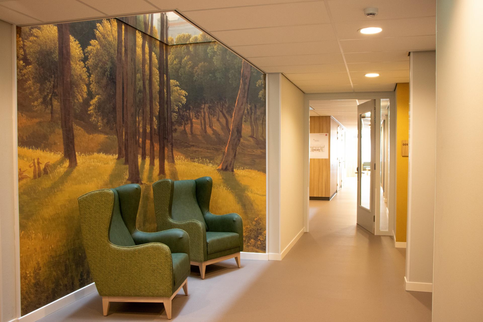 In december 2021 startte de bouw van het nieuwe behandelcentrum van Zorgbalans in Hillegom, genaamd; Sonnevanck. Sonnevanck is een gespecialiseerd geriatrisch behandelcentrum dat gericht is op individuen met ernstige gedragsproblematiek. Door de zware zorgvraag van de cliënten moest er tijdens de bouw kritisch worden gekeken naar de inrichting van het behandelcentrum. In samenwerking met Zorgbalans hebben interieur designer Amy Roovers en zorgmanager Joost Graat een interieur mogen samenstellen dat aan de behoefte van de cliënten en medewerkers voldoet. In maart 2024 is het behandelcentrum officieel geopend en met succes in gebruik genomen. Het interieur laat zich omschrijven als minimalistisch en eenvoudig en dat is natuurlijk niet zonder reden. De cliënten van Sonnevanck zijn door hun gedragsproblematiek gebaat bij een interieur dat prikkelarm is en rust uitstraalt. Daarnaast is het van belang dat het meubilair verzwaard, robuust en gedragsbestendig is, zodat de cliënten er niet onverwacht mee kunnen schuiven of optillen. Naast de bewonerskamers hebben wij ook de studio’s, gangen, vergaderruimtes en personeelsruimtes mogen voorzien van meubilair, wandafwerking en raambekleding. Kleurrijke etages Als inspiratie voor dit minimalistische interieur is er gekozen om één afbeelding vanaf de begane grond helemaal door te trekken tot aan de tweede verdieping. Deze afbeelding is vanuit de gangen van alle drie de etages te zien. Op deze afbeelding zijn meters hoge bomen te zien; op de begane grond zie je voornamelijk de stam van de bomen in het grasland.