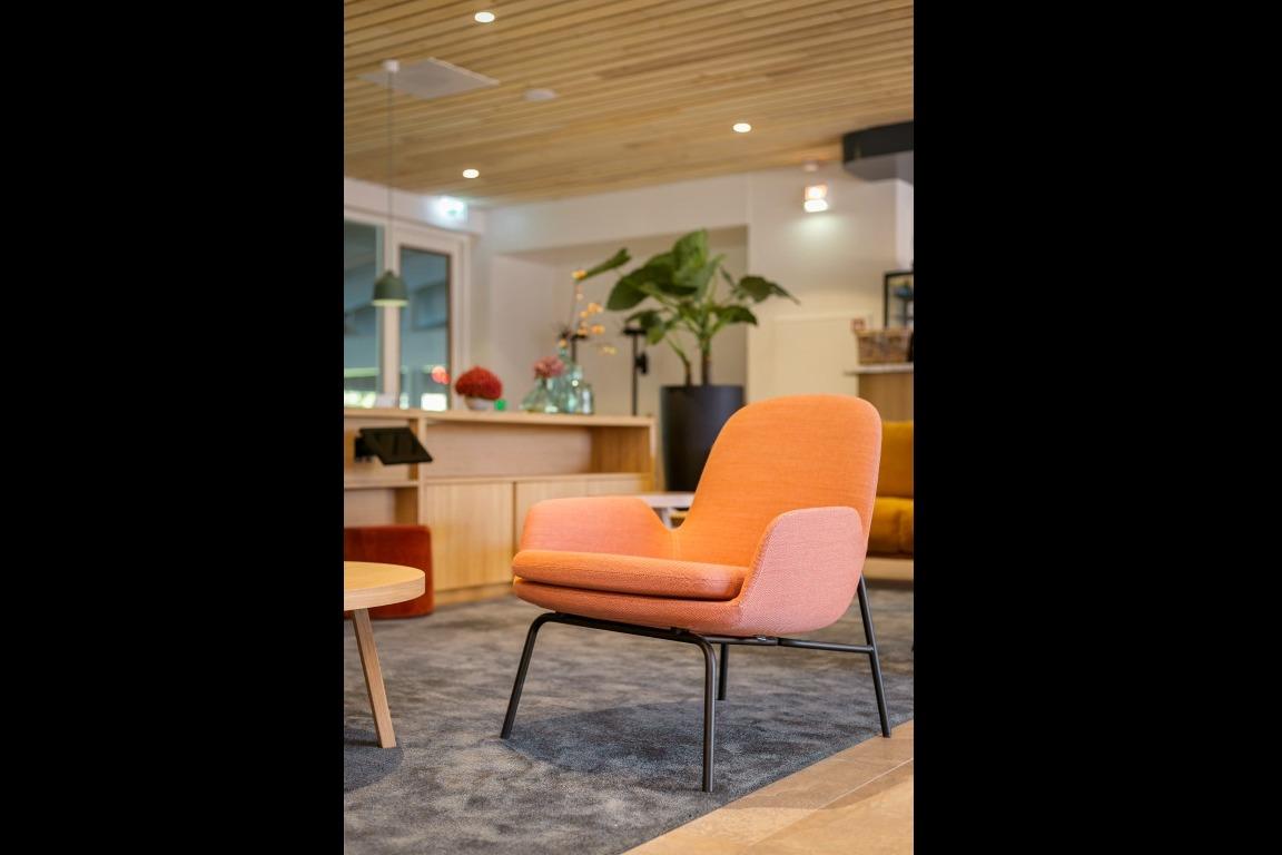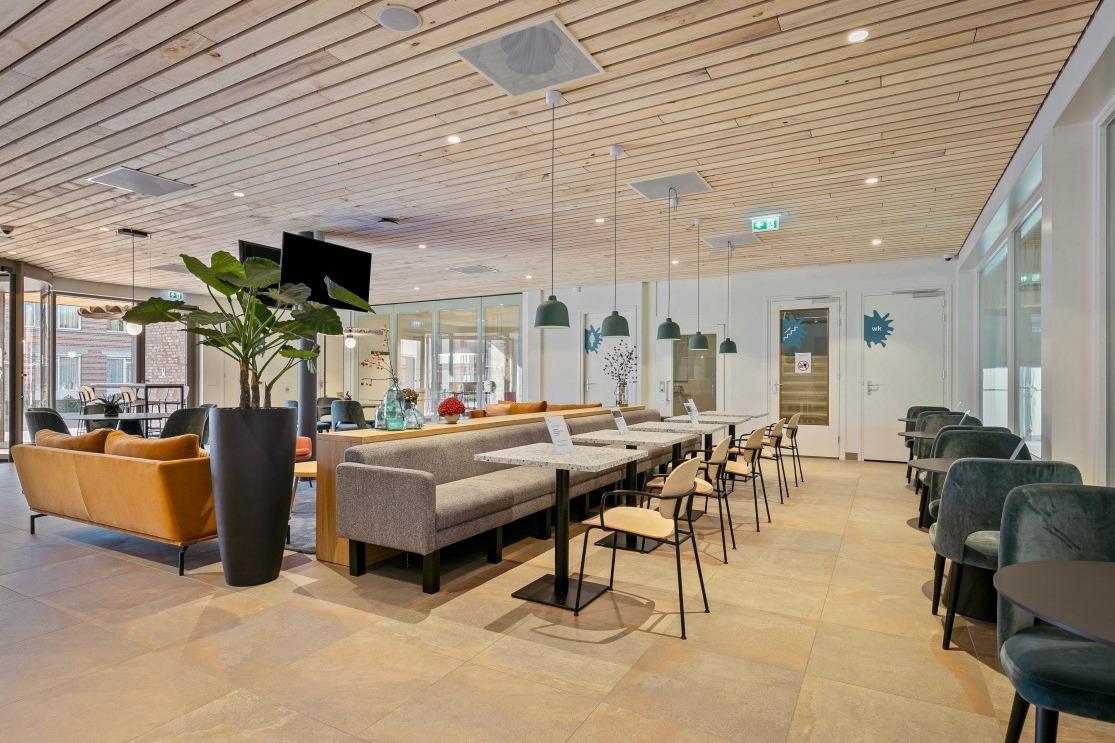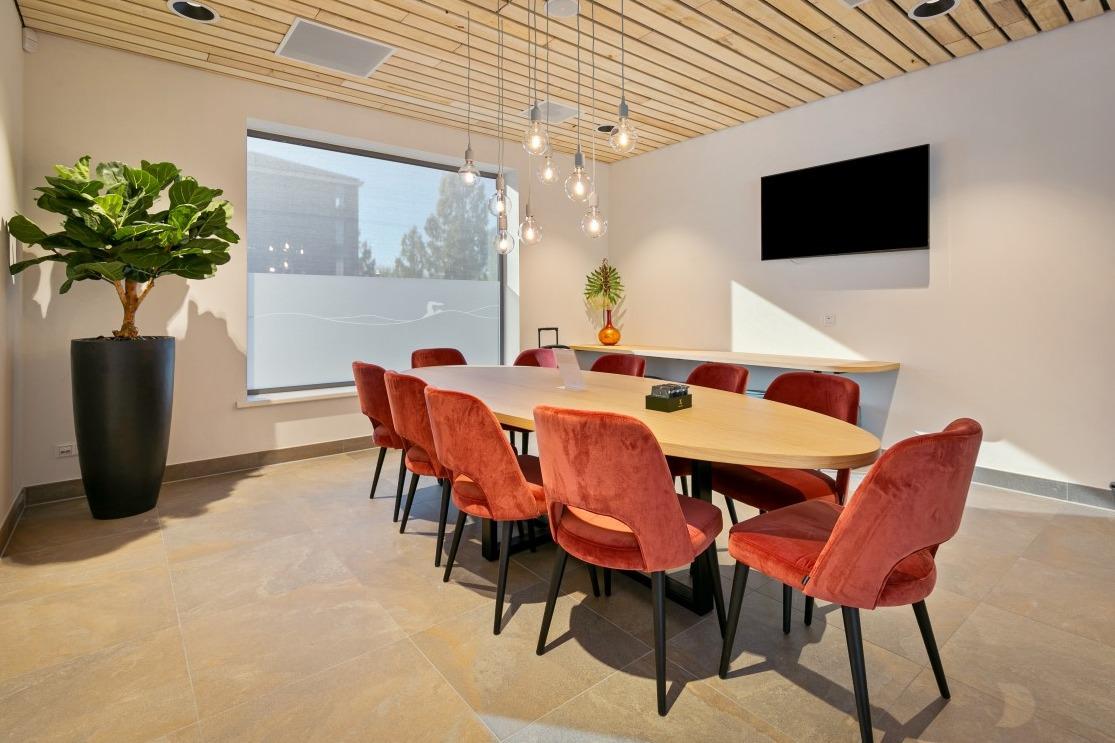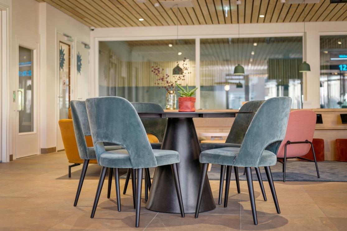 Scandinavisch modern Tijdens het ontwerpen werd er een moodboard samengesteld met warme kleuren, als tegenhanger op het vele blauw en wit van het zwembad. Veel organische vormen, lichte materialen en maatwerk dat precies is afgestemd op de verschillende bezoekers. In het midden van de ruimte is een fijne zithoek gecreëerd met de Nona bank in een warme mosterd kleur, de Era Lounge low - steel in het zalm roze, de Niu poefjes in velourse, rode stof en verschillende houten bijzettafeltjes. De ruimte wordt op een natuurlijke manier verdeeld door het maatwerkmeubel met daarin geïntegreerde Ipads voor het vertier van de kleintjes. Ook zijn er stroompunten voor het opladen van een laptop of telefoon. Aan de andere kant van de maatwerkkast is de lange Square wandbank geplaatst, gecombineerd met de Inox tafelonderstellen, terrazzo tafelbladen en de Mundi A met zwart stalen frame en eiken zitting en rug. Tegen de glaswand aan staan de Ema 1 H stoelen en de Ikon onderstellen, dé plek om de zwemwedstrijden en trainingen op de voet te volgen. . Multifunctionele vergaderruimte Naast de ontvangstruimte is een extra afgesloten ruimte gecreëerd, die als vergaderruimte ingezet wordt. Deze ruimte wordt verhuurd of kan worden ingezet als leestafel of werkplek. Net als in de ontvangstruimte hangt ook hier een scherm waar je de zwemmers kan volgen tijdens wedstrijden of trainingen. Door de vele zitmogelijkheden is er voor iedere bezoeker een geschikt plekje gecreëerd; of je nu aan het raam gekluisterd wil zitten, tijdens het wachten even wil werken of ontspannen op de bank naar de schermen wil kijken…er is voor iedereen plek. |