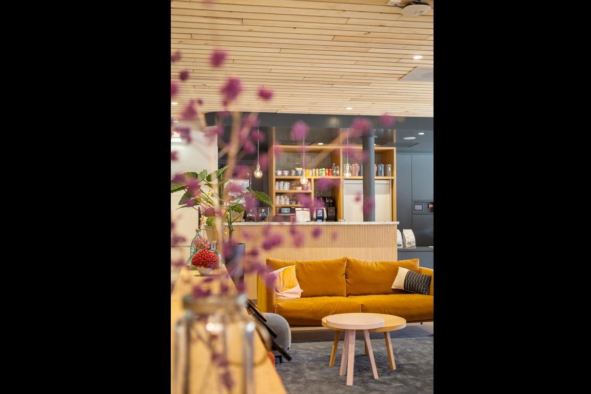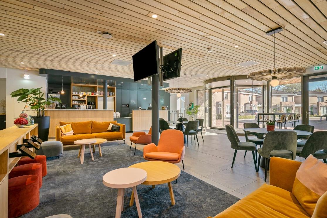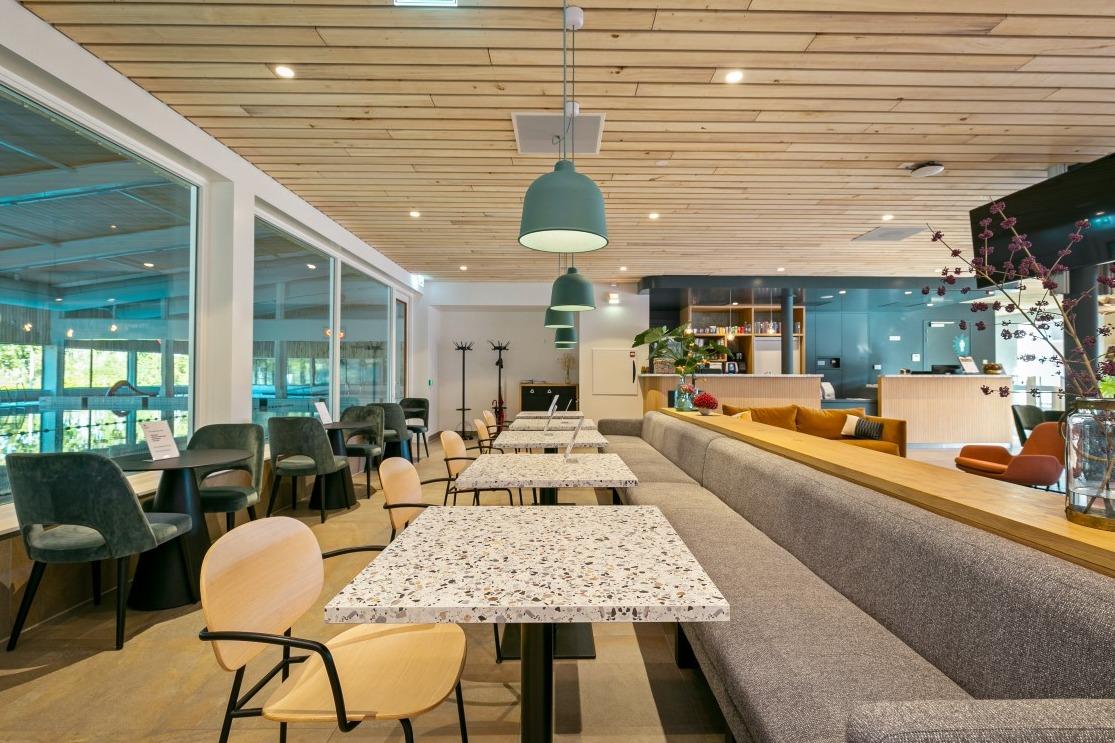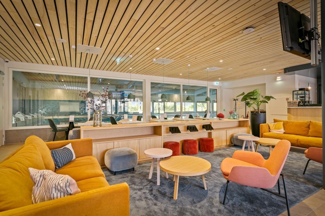 Scandinavisch modern Tijdens het ontwerpen werd er een moodboard samengesteld met warme kleuren, als tegenhanger op het vele blauw en wit van het zwembad. Veel organische vormen, lichte materialen en maatwerk dat precies is afgestemd op de verschillende bezoekers. In het midden van de ruimte is een fijne zithoek gecreëerd met de Nona bank in een warme mosterd kleur, de Era Lounge low - steel in het zalm roze, de Niu poefjes in velourse, rode stof en verschillende houten bijzettafeltjes. De ruimte wordt op een natuurlijke manier verdeeld door het maatwerkmeubel met daarin geïntegreerde Ipads voor het vertier van de kleintjes. Ook zijn er stroompunten voor het opladen van een laptop of telefoon. Aan de andere kant van de maatwerkkast is de lange Square wandbank geplaatst, gecombineerd met de Inox tafelonderstellen, terrazzo tafelbladen en de Mundi A met zwart stalen frame en eiken zitting en rug. Tegen de glaswand aan staan de Ema 1 H stoelen en de Ikon onderstellen, dé plek om de zwemwedstrijden en trainingen op de voet te volgen. . Multifunctionele vergaderruimte Naast de ontvangstruimte is een extra afgesloten ruimte gecreëerd, die als vergaderruimte ingezet wordt. Deze ruimte wordt verhuurd of kan worden ingezet als leestafel of werkplek. Net als in de ontvangstruimte hangt ook hier een scherm waar je de zwemmers kan volgen tijdens wedstrijden of trainingen. Door de vele zitmogelijkheden is er voor iedere bezoeker een geschikt plekje gecreëerd; of je nu aan het raam gekluisterd wil zitten, tijdens het wachten even wil werken of ontspannen op de bank naar de schermen wil kijken…er is voor iedereen plek. |